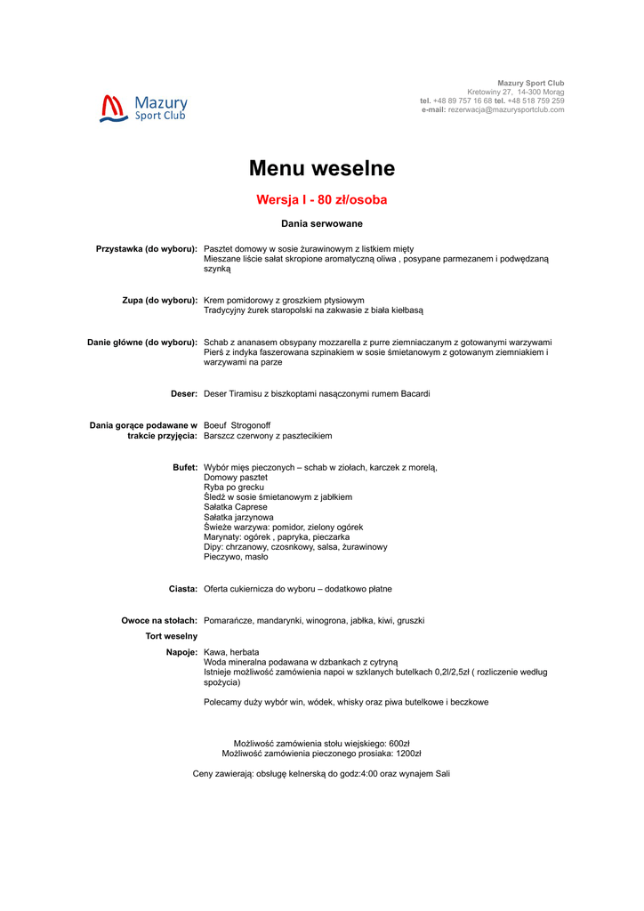 Mazury Sport Club Kretowiny 27, 14-300 Morąg tel. +48 89 757 16 68 tel. +48 518 759 259 e-mail: [email protected] Menu weselne Wersja I - 80 zł/osoba Dania serwowane Przystawka (do wyboru): Pasztet domowy w sosie żurawinowym z listkiem mięty Mieszane liście sałat skropione aromatyczną oliwa , posypane parmezanem i podwędzaną szynką Zupa (do wyboru): Krem pomidorowy z groszkiem ptysiowym Tradycyjny żurek staropolski na zakwasie z biała kiełbasą Danie główne (do wyboru): Schab z ananasem obsypany mozzarella z purre ziemniaczanym z gotowanymi warzywami Pierś z indyka faszerowana szpinakiem w sosie śmietanowym z gotowanym ziemniakiem i warzywami na parze Deser: Deser Tiramisu z biszkoptami nasączonymi rumem Bacardi Dania gorące podawane w Boeuf Strogonoff trakcie przyjęcia: Barszcz czerwony z pasztecikiem Bufet: Wybór mięs pieczonych – schab w ziołach, karczek z morelą, Domowy pasztet Ryba po grecku Śledź w sosie śmietanowym z jabłkiem Sałatka Caprese Sałatka jarzynowa Świeże warzywa: pomidor, zielony ogórek Marynaty: ogórek , papryka, pieczarka Dipy: chrzanowy, czosnkowy, salsa, żurawinowy Pieczywo, masło Ciasta: Oferta cukiernicza do wyboru – dodatkowo płatne Owoce na stołach: Pomarańcze, mandarynki, winogrona, jabłka, kiwi, gruszki Tort weselny Napoje: Kawa, herbata Woda mineralna podawana w dzbankach z cytryną Istnieje możliwość zamówienia napoi w szklanych butelkach 0,2l/2,5zł ( rozliczenie według spożycia) Polecamy duży wybór win, wódek, whisky oraz piwa butelkowe i beczkowe Możliwość zamówienia stołu wiejskiego: 600zł Możliwość zamówienia pieczonego prosiaka: 1200zł Ceny zawierają: obsługę kelnerską do godz:4:00 oraz wynajem Sali Mazury Sport Club Kretowiny 27, 14-300 Morąg tel. +48 89 757 16 68 tel. +48 518 759 259 e-mail: [email protected] Wersja II - 120 zł/osoba Dania serwowane Przystawka (do wyboru): Carpaccio wołowe z sałatą radicchio oprószone płatkami parmezanu, skropione oliwą z oliwek Carpaccio z wędzonego łososia obsypane rukolą , czarną oliwką, kaparami, parmezanem w delikatnym sosie musztardowo miodowym Zupa (do wyboru): Krem z brokuł z kropelką śmietany z wędzonym łososiem Tradycyjny rosół drobiowy z makaronem domowym z warzywami Danie główne (do wyboru): Pierś z kurczaka zapiekana z serem camembert i brzoskwinią w sosie malinowym podawana z gotowanym ziemniakiem i warzywami Polędwiczki wieprzowe w sosie kurkowym z purre ziemniaczanym Deser: Deser Tiramisu z biszkoptami nasączonymi rumem Bacardi Dania gorące podawane w Boeuf Strogonoff trakcie przyjęcia: Bigos staropolski podlewany czerwonym winem Barszcz czerwony z pasztecikiem Bufet: Wybór mięs pieczonych – schab w ziołach, karczek z morelą, boczek rolowany Półmisek serów regionalnych Domowy pasztet Tatar wołowy Pstrąg wędzony z cytrynką Ryba po grecku Śledź w sosie śmietanowym z jabłkiem Sałatka Caprese Sałatka Grecka Sałatka jarzynowa Świeże warzywa: pomidor, zielony ogórek Marynaty: ogórek , papryka, pieczarka Dipy: chrzanowy, czosnkowy, salsa, żurawinowy Pieczywo, masło Ciasta: Oferta cukiernicza do wyboru – jabłecznik, sernik Owoce na stołach: Pomarańcze, mandarynki, winogrona, jabłka, kiwi, gruszki Tort weselny Napoje: Kawa, herbata Soki podawane w dzbankach: jabłkowy, pomarańczowy, porzeczkowy, grapefruit Woda mineralna podawana w dzbankach z cytryną Istnieje możliwość zamówienia napoi w szklanych butelkach 0,2l/2,5zł ( rozliczenie według spożycia) Polecamy duży wybór win, wódek, whisky oraz piwa butelkowe i beczkowe Możliwość zamówienia stołu wiejskiego: 600zł Możliwość zamówienia pieczonego prosiaka: 1200zł Ceny zawierają: obsługę kelnerską do godz:4:00 oraz wynajem Sali