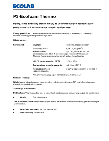 P3-Ecofoam Thermo Płynny, silnie alkaliczny środek myjący do usuwania tłustych osadów i żywic powędzarniczych w zakładach przemysłu spożywczego. Zalety produktu • doskonałe właściwości usuwania tłustych, białkowych i smolistych osadów powstających w procesie wędzenia Właściwości: Koncentrat: Wygląd: klarowna, brązowa ciecz* Gęstość (20°C): 1,38 – 1,42 g/cm * 3 Alkaliczność: 9,6 – 10,4ml* 0,5n HCl na zmiareczkowanie 50ml 1-procentowego roztworu P3-Ecofoam Thermo (woda zdemineralizowana) wobec fenoloftaleiny. pH 1% (woda zdemin., 20°C): 12,5 – 12,9 Temperatura przechowywania: od +5 do +35° C Rozpuszczalność: każdym stosunku w 20° C rozpuszczalny w wodzie w * Parametr odnoszący się do kontroli towaru dostarczonego Roztwór roboczy: Właściwości pianotwórcze: pieni się, nieprzydatny w systemach CIP, może być stosowany również do mycia iniektorowego. Tolerancja materiałowa: P3-Ecofoam Thermo nadaje się, w warunkach zastosowania opisanych poniżej, do powierzchni • Metale Stal nierdzewna P3- Ecofoam Thermo nie nadaje się do mycia aluminium ocynkowanych lub galwanizowanych powierzchni. • Tworzywa sztuczne: PE, PP, twarde PVC • Inne: materiały ceramiczne Zastosowanie: Ze względu na wysoką alkaliczność i właściwości zwilżające P3-Ecofoam Thermo nadaje się szczególnie do likwidowania trudnych do usunięcia zabrudzeń tłuszczowych i białkowych oraz osadów i zabrudzeń powstających w procesie wędzenia. P3-Ecofoam Thermo może być używany do czyszczenia komór wędzarniczych, frytownic, smażalników i urządzeń do gotowania. Zaleca się stężenie 2-5%. Przy silnych i trudno usuwalnych zanieczyszczeniach może być konieczne zastosowanie wyższego stężenia. Komory wędzarnicze 1. Roztwór myjący P3-Ecofoam Thermo (40-90 °C) jest natryskiwany lub nanoszony w postaci piany przy pomocy automatycznych urządzeń myjących. 2. Czas kontaktu 15-40 minut. Unikać zasychania preparatu na mytych powierzchniach. 3. Po myciu spłukać wodą o jakości wody pitnej tak, aby usunąć wszystkie zanieczyszczenia i resztki piany. Urządzenia do gotowania 1. Płukać wstępnie wodą o temperaturze 50 – 70 °C. 2. Napełnić zbiorniki roztworem 2 - 3% P3-Ecofoam Thermo frytownice, smażalniki 3. Podgrzać roztwór do temperatury 60 – 80 °C. 4. Czas kontaktu 15-30 minut w stałej temperaturze. 5. Po opróżnieniu dokładnie wypłukać wodą o jakości pitnej. Do codziennego czyszczenia używać piany P3-Ecofoam Thermo o stężeniu 3 - 5% i wody do płukania o temperaturze 40 - 60 °C. Kontrola: Pomiar stężenia Miareczkowanie: • • • • • Roztwór badany: 50 ml roztworu użytkowego Titrant: 0,5 n HCl Wskaźnik miareczkowania: fenoloftaleina Stała miareczkowania: 0,2 Objętość titranta w ml x 0,2 = (wagowe)% P3-Ecofoam Thermo P3-System • Przy zastosowaniu P3-Ecofoam Thermo zalecamy użycie Systemu Higieny P3Topax. • Urządzenia do pianowania i płukania pod ciśnieniem do 25 bar • Dozowanie środka regulowane w zależności od potrzeb • Łatwe i ekonomiczne użycie Bezpieczeństwo P3-Ecofoam Thermo klasyfikowany jest jako „produkt żrący” (symbol „c”); zawiera wodorotlenek sodu. Uwaga! Podczas mycia, szczególnie przy użyciu systemów wysokociśnieniowych, może pojawić się aerozol zawierający wodę i użyty środek chemiczny. Należy unikać jego wdychania. W tym celu prosimy o ochronę dróg oddechowych (maski ochronne). I Informacje zawarte w niniejszej ulotce odnoszą się do naszej aktualnej wiedzy i doświadczenia i opisują właściwości P3-Ecofoam Thermo podczas jego normalnego użycia. Nie jesteśmy prawnie odpowiedzialni za właściwości produktu w indywidualnych warunkach. Co więcej, mając na względzie liczne parametry mogące mieć wpływ na działanie naszych produktów, ulotka ta nie zwalnia użytkowników od obowiązku sprawdzenia przydatności produktów i zapewnienia odpowiednich środków bezpieczeństwa. Należy przy tym uniknąć pogwałcenia praw patentowych. (SBU Food & Beverage, MAJ 2007) P3-Ecofoam Thermo Przewodnictwo (25'C,0 d)współczynnik temperaturowy alfa= 1,69%/'C 012345 stężenie, % wag Informacje zawarte w niniejszej ulotce odnoszą się do naszej aktualnej wiedzy i doświadczenia i opisują właściwości P3-Ecofoam Thermo podczas jego normalnego użycia. Nie jesteśmy prawnie odpowiedzialni za właściwości produktu w indywidualnych warunkach. Co więcej, mając na względzie liczne parametry mogące mieć wpływ na działanie naszych produktów, ulotka ta nie zwalnia użytkowników od obowiązku sprawdzenia przydatności produktów i zapewnienia odpowiednich środków bezpieczeństwa. Należy przy tym uniknąć pogwałcenia praw patentowych. (SBU Food & Beverage, MAJ 2007)