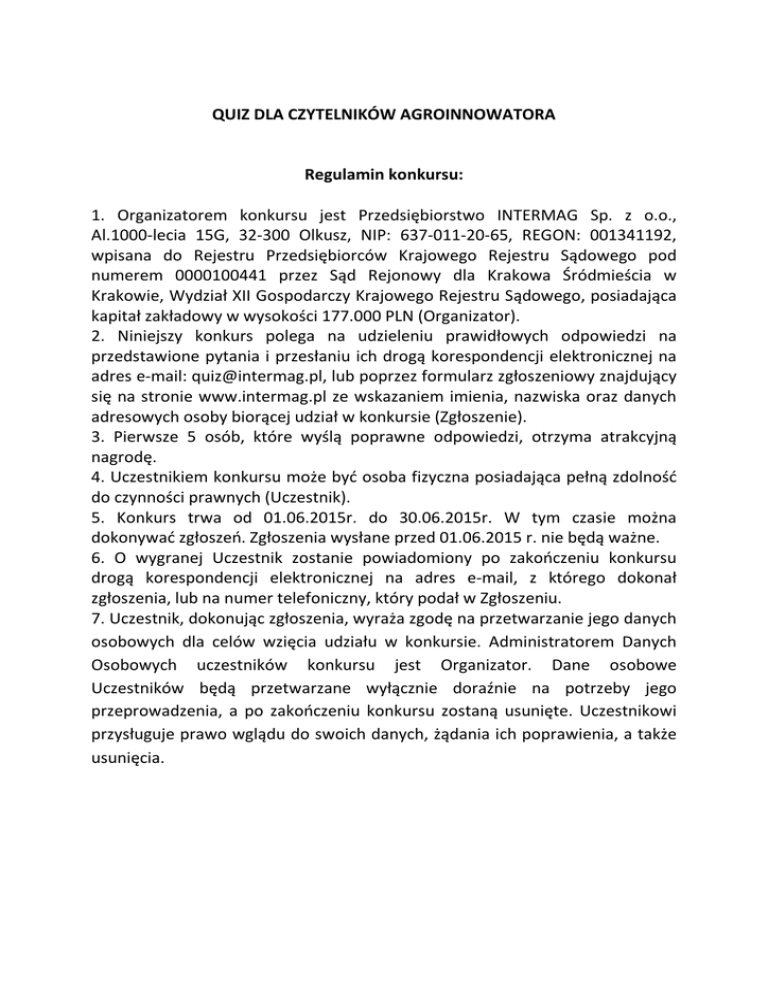 QUIZ DLA CZYTELNIKÓW AGROINNOWATORA Regulamin konkursu: 1. Organizatorem konkursu jest Przedsiębiorstwo INTERMAG Sp. z o.o., Al.1000-lecia 15G, 32-300 Olkusz, NIP: 637-011-20-65, REGON: 001341192, wpisana do Rejestru Przedsiębiorców Krajowego Rejestru Sądowego pod numerem 0000100441 przez Sąd Rejonowy dla Krakowa Śródmieścia w Krakowie, Wydział XII Gospodarczy Krajowego Rejestru Sądowego, posiadająca kapitał zakładowy w wysokości 177.000 PLN (Organizator). 2. Niniejszy konkurs polega na udzieleniu prawidłowych odpowiedzi na przedstawione pytania i przesłaniu ich drogą korespondencji elektronicznej na adres e-mail: [email protected], lub poprzez formularz zgłoszeniowy znajdujący się na stronie www.intermag.pl ze wskazaniem imienia, nazwiska oraz danych adresowych osoby biorącej udział w konkursie (Zgłoszenie). 3. Pierwsze 5 osób, które wyślą poprawne odpowiedzi, otrzyma atrakcyjną nagrodę. 4. Uczestnikiem konkursu może być osoba fizyczna posiadająca pełną zdolność do czynności prawnych (Uczestnik). 5. Konkurs trwa od 01.06.2015r. do 30.06.2015r. W tym czasie można dokonywać zgłoszeń. Zgłoszenia wysłane przed 01.06.2015 r. nie będą ważne. 6. O wygranej Uczestnik zostanie powiadomiony po zakończeniu konkursu drogą korespondencji elektronicznej na adres e-mail, z którego dokonał zgłoszenia, lub na numer telefoniczny, który podał w Zgłoszeniu. 7. Uczestnik, dokonując zgłoszenia, wyraża zgodę na przetwarzanie jego danych osobowych dla celów wzięcia udziału w konkursie. Administratorem Danych Osobowych uczestników konkursu jest Organizator. Dane osobowe Uczestników będą przetwarzane wyłącznie doraźnie na potrzeby jego przeprowadzenia, a po zakończeniu konkursu zostaną usunięte. Uczestnikowi przysługuje prawo wglądu do swoich danych, żądania ich poprawienia, a także usunięcia.