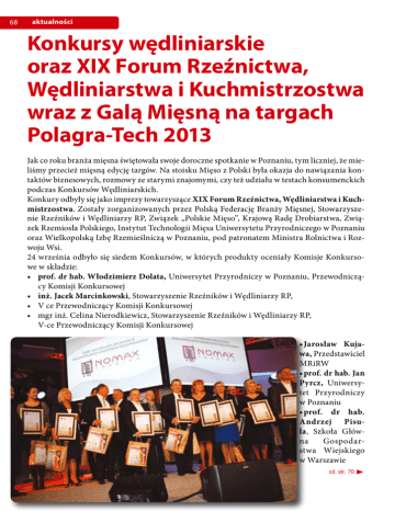 68 aktualności Konkursy wędliniarskie oraz XIX Forum Rzeźnictwa, Wędliniarstwa i Kuchmistrzostwa wraz z Galą Mięsną na targach Polagra-Tech 2013 Jak co roku branża mięsna świętowała swoje doroczne spotkanie w Poznaniu, tym liczniej, że mieliśmy przecież mięsną edycję targów. Na stoisku Mięso z Polski była okazja do nawiązania kontaktów biznesowych, rozmowy ze starymi znajomymi, czy też udziału w testach konsumenckich podczas Konkursów Wędliniarskich. Konkury odbyły się jako imprezy towarzyszące XIX Forum Rzeźnictwa, Wędliniarstwa i Kuchmistrzostwa. Zostały zorganizowanych przez Polską Federację Branży Mięsnej, Stowarzyszenie Rzeźników i Wędliniarzy RP, Związek „Polskie Mięso”, Krajową Radę Drobiarstwa, Związek Rzemiosła Polskiego, Instytut Technologii Mięsa Uniwersytetu Przyrodniczego w Poznaniu oraz Wielkopolską Izbę Rzemieślniczą w Poznaniu, pod patronatem Ministra Rolnictwa i Rozwoju Wsi. 24 września odbyło się siedem Konkursów, w których produkty oceniały Komisje Konkursowe w składzie: • prof. dr hab. Włodzimierz Dolata, Uniwersytet Przyrodniczy w Poznaniu, Przewodniczący Komisji Konkursowej • inż. Jacek Marcinkowski, Stowarzyszenie Rzeźników i Wędliniarzy RP, • V ce Przewodniczący Komisji Konkursowej • mgr inż. Celina Nierodkiewicz, Stowarzyszenie Rzeźników i Wędliniarzy RP, V-ce Przewodniczący Komisji Konkursowej •Jarosław Kujawa, Przedstawiciel MRiRW •prof. dr hab. Jan Pyrcz, Uniwersytet Przyrodniczy w Poznaniu •prof. dr hab. Andrzej Pisula, Szkoła Główna Gospodarstwa Wiejskiego w Warszawie cd. str. 70 70 aktualności • Prof. dr hab. Mirosław Słowiński, Szkoła Główna Gospodarstwa Wiejskiego w Warszawie • dr Dariusz Lisiak, Instytut Biotechnologii Przemysłu RolnoSpożywczego • mgr Waldemar Jaworski, Instytut Przemysłu Mięsnego i Tłuszczowego w Poznaniu • Roman Markowski, Mistrz Wędliniarstwa, Wielkopolski Cech Rzeźników-Wędliniarzy-Kucharzy w Poznaniu • dr inż. Mirosława Krzywdzińska-Bartkowiak, Uniwersytet Przyrodniczy w Poznaniu • dr inż. Agnieszka Bilska, Uniwersytet Przyrodniczy w Poznaniu • dr inż. Beata Mikołajczak, Uniwersytet Przyrodniczy w Poznaniu • dr inż. Ewa Iwańska, Uniwersytet Przyrodniczy w Poznaniu • mgr Barbara Kobierna, Uniwersytet Przyrodniczy w Poznaniu • mgr Ewa Marcinek-Łabińska, Uniwersytet Przyrodniczy w Poznaniu Przewodnicząca Komisji Konkursowej „Mięso w Daniach Gotowych” • Hieronim Jurga, ABC Kuchni, Poznań, członek Komisji Konkursowej „Mięso w Daniach Gotowych” • mgr Katarzyna Hartwich, Uniwersytet Przyrodniczy w Poznaniu, członek Komisji „MwDG” • mgr Paulina Gatniejewska, Uniwersytet Przyrodniczy w Poznaniu, członek Komisji „MwDG” • mgr Justyna Bilon, Uniwersytet Przyrodniczy w Poznaniu, członek Komisji „MwDG” • mgr Joanna Czyż, Uniwersytet Przyrodniczy w Poznaniu, członek Komisji „MwDG” • dr inż. Michał Piątek, aktualności Uniwersytet Przyrodniczy w Poznaniu, Sekretarz Komisji Konkursowych • mgr inż. Agnieszka Frala, Uniwersytet Przyrodniczy w Poznaniu, Sekretarz Komisji Konkursowych W Konkursie nr 3 na Najlepszy Wyrób Wędliniarski w Ocenie Konsumenckiej wyroby oceniane były przez konsumentów. W Konkursach nagrodzono producentów, których wyroby uzyskały najwyższe oceny. KONKURS 1 o tytuł NAJLEPSZEGO PRODUCENTA WĘDLIN XVI edycja Grupa 1 - WĘDZONKI PARZONE 1 miejsce - Rzeźnictwo ZYGUŁA ZBĄSZYNEK Sp. z o.o. Sp.K., Zbąszynek za boczek lwowski 2 miejsce - Zakład Mięsny POLIWCZAK Sp.J., Celina Poliwczak, Piotr Poliwczak, Mysłowice za baleron marynowany 3 miejsce - Zakłady Mięsne Henryka Stokłosy Sp. z o.o., Śmiłowo za szynkę wiejską Wyróżnienie - Zakład Mięsny POLIWCZAK Sp.J., Celina Poliwczak, Piotr Poliwczak, Mysłowice za szynkę mysłowicką kruchą Wyróżnienie - Zakłady Mięsne DOBROSŁAWÓW Henryk Amanowicz, Dobrosławów za szynkę staropolską Grupa 2 - WĘDZONKI SUROWE 1 miejsce - Niewieścin Sp. z o.o., Niewieścin za szynkę długo dojrzewającą 2 miejsce - Rzeźnictwo ZYGUŁA ZBĄSZYNEK Sp. z o.o. Sp.K., Zbąszynek za polędwicę surową wędzoną 3 miejsce - Zakład Mięsny LENARCIK Sławomir Lenarcik, 71 72 aktualności Gotardy za szynkę z dzika Wyróżnienie Zakład Mięsny POLIWCZAK Sp.J., Celina Poliwczak, Piotr Poliwczak, Mysłowice za polędwicę surową wędzoną Wyróżnienie Firma HandlowoProdukcyjna BOHUN Sp. z o.o., Szczecin za polędwicę surową smak natury Grupa 3 - KIEŁBASY ŚREDNIO I GRUBO ROZDROBNIONE 1 miejsce - Zakład Mięsny POLIWCZAK Sp.J., Celina Poliwczak, Piotr Poliwczak, Mysłowice za kiełbasę głogowską 2 miejsce - Rzeźnictwo ZYGUŁA ZBĄSZYNEK Sp. z o.o. Sp.K., Zbąszynek za piwoszki 3 miejsce - Zakłady Mięsne VIANDO Sp. z o.o. Sp.K., Radojewice za frankfurterki Wyróżnienie - Przedsiębiorstwo Drobiarskie DROBEX Sp z o.o. Oddział w Bydgoszczy, Bydgoszcz za krakowską suchą Grupa 4 - WĘDLINY PODROBOWE 1 miejsce – Rzeźnictwo ZYGUŁA ZBĄSZYNEK Sp. z o.o. Sp.K., Zbąszynek za pasztet borowikowy 2 miejsce - Zakład Mięsny LENARCIK Sławomir Lenarcik, Gotardy za salceson włoski 3 miejsce - Zakład Przetwórstwa Mięsnego DWORECKI Sp.J., Golejewo za salceson smakosz Wyróżnienie Zakłady Mięsne Henryka Stokłosy Sp. z o.o., Śmiłowo aktualności za pasztetową podwędzaną Wyróżnienie - Zakład Mięsny POLIWCZAK Sp.J., Celina Poliwczak, Piotr Poliwczak, Mysłowice za pasztet gospodarza Grupa 5 - WĘDLINY REGIONALNE I TRADYCYJNE 1 miejsce - Zakłady Mięsne BYSTRY, Swarzędz kiełbasę kruchą 2 miejsce - Przedsiębiorstwo Drobiarskie DROBEX Sp z o.o. Oddział w Bydgoszczy, Bydgoszcz za kiełbasę solecką podsuszaną 3 miejsce - Firma Handlowo-Produkcyjna BOHUN Sp. z o.o., Szczecin za kiełbasę lisowską Wyróżnienie - Zakład Przetwórstwa Mięsnego DWORECKI Sp.J., Golejewo za kiełbasę z komina Grupa 6 - SALAMI 1 miejsce - Niewieścin Sp. z o.o., Niewieścin za salami peperoni 