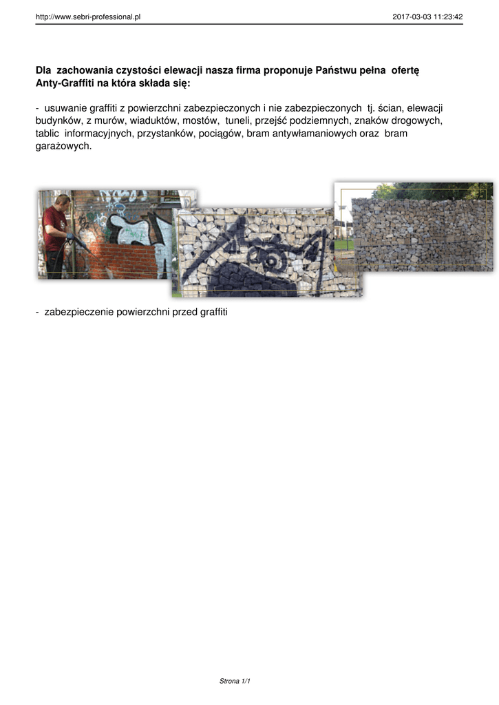 http://www.sebri-professional.pl 2017-03-03 11:23:42 Dla zachowania czystości elewacji nasza firma proponuje Państwu pełna ofertę Anty-Graffiti na która składa się: - usuwanie graffiti z powierzchni zabezpieczonych i nie zabezpieczonych tj. ścian, elewacji budynków, z murów, wiaduktów, mostów, tuneli, przejść podziemnych, znaków drogowych, tablic informacyjnych, przystanków, pociągów, bram antywłamaniowych oraz bram garażowych. - zabezpieczenie powierzchni przed graffiti Strona 1/1
