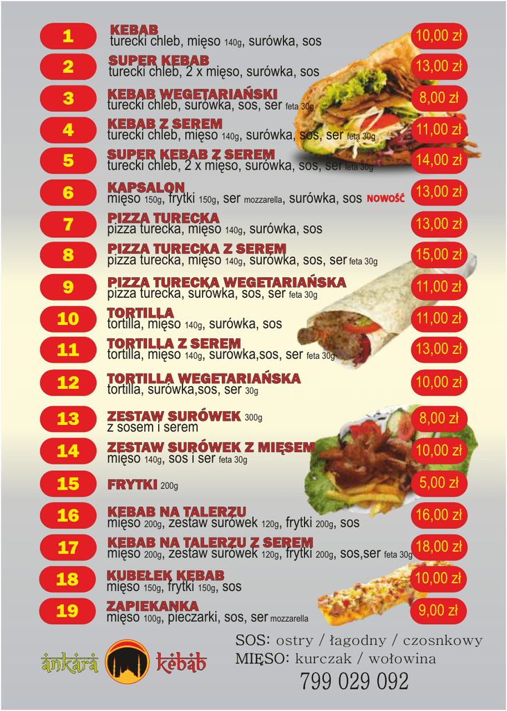 1 2 3 4 5 6 7 8 KEBAB turecki chleb, mięso 140g, surówka, sos SUPER KEBAB turecki chleb, 2 x mięso, surówka, sos 10,00 zł KEBAB WEGETARIAŃSKI turecki chleb, surówka, sos, ser feta 30g KEBAB Z SEREM turecki chleb, mięso 140g, surówka, sos, ser feta 30g SUPER KEBAB Z SEREM turecki chleb, 2 x mięso, surówka, sos, ser feta 30g 8,00 zł 13,00 zł 11,00 zł 14,00 zł KAPSALON mięso 150g, frytki 150g, ser mozzarella, surówka, sos NOWOŚĆ 13,00 zł PIZZA TURECKA 13,00 zł pizza turecka, mięso 140g, surówka, sos PIZZA TURECKA Z SEREM 15,00 zł pizza turecka, mięso 140g, surówka, sos, ser feta 30g 11 PIZZA TURECKA WEGETARIAŃSKA pizza turecka, surówka, sos, ser feta 30g TORTILLA tortilla, mięso 140g, surówka, sos TORTILLA Z SEREM tortilla, mięso 140g, surówka,sos, ser feta 30g 13,00 zł 12 TORTILLA WEGETARIAŃSKA tortilla, surówka,sos, ser 30g 10,00 zł 13 8,00 zł 14 ZESTAW SURÓWEK 300g z sosem i serem ZESTAW SURÓWEK Z MIĘSEM mięso 140g, sos i ser feta 30g 10,00 zł 15 FRYTKI 200g 5,00 zł 16 KEBAB NA TALERZU 16,00 zł mięso 200g, zestaw surówek 120g, frytki 200g, sos KEBAB NA TALERZU Z SEREM mięso 200g, zestaw surówek 120g, frytki 200g, sos,ser feta 30g 18,00 zł 9 10 17 18 19 ankara KUBEŁEK KEBAB mięso 150g, frytki 150g, sos ZAPIEKANKA mięso 100g, pieczarki, sos, ser mozzarella kebab 11,00 zł 11,00 zł 10,00 zł 9,00 zł SOS: ostry / łagodny / czosnkowy MIĘSO: kurczak / wołowina 799 029 092