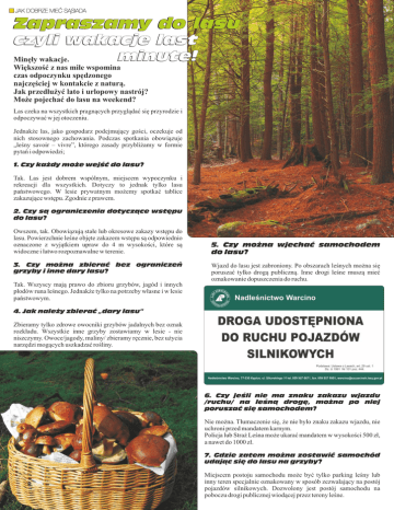 JAK DOBRZE MIEĆ SĄSIADA Zapraszamy do lasu czyli wakacje last minute! Minęły wakacje. Większość z nas mile wspomina czas odpoczynku spędzonego najczęściej w kontakcie z naturą. Jak przedłużyć lato i urlopowy nastrój? Może pojechać do lasu na weekend? Las czeka na wszystkich pragnących przyglądać się przyrodzie i odpoczywać w jej otoczeniu. Jednakże las, jako gospodarz podejmujący gości, oczekuje od nich stosownego zachowania. Podczas spotkania obowiązuje „leśny savoir – vivre”, którego zasady przybliżamy w formie pytań i odpowiedzi; 1. Czy każdy może wejść do lasu? Tak. Las jest dobrem wspólnym, miejscem wypoczynku i rekreacji dla wszystkich. Dotyczy to jednak tylko lasu państwowego. W lesie prywatnym możemy spotkać tablice zakazujące wstępu. Zgodnie z prawem. 2. Czy są ograniczenia dotyczące wstępu do lasu? Owszem, tak. Obowiązują stałe lub okresowe zakazy wstępu do lasu. Powierzchnie leśne objęte zakazem wstępu są odpowiednio oznaczone z wyjątkiem upraw do 4 m wysokości, które są widoczne i łatwo rozpoznawalne w terenie. 3. Czy można zbierać bez ograniczeń grzyby i inne dary lasu? Tak. Wszyscy mają prawo do zbioru grzybów, jagód i innych płodów runa leśnego. Jednakże tylko na potrzeby własne i w lesie państwowym. 5. Czy można wjechać samochodem do lasu? Wjazd do lasu jest zabroniony. Po obszarach leśnych można się poruszać tylko drogą publiczną. Inne drogi leśne muszą mieć oznakowanie dopuszczenia do ruchu. 4. Jak należy zbierać „dary lasu” Zbieramy tylko zdrowe owocniki grzybów jadalnych bez oznak rozkładu. Wszystkie inne grzyby zostawiamy w lesie - nie niszczymy. Owoce/jagody, maliny/ zbieramy ręcznie, bez użycia narzędzi mogących uszkadzać rośliny. 6. Czy jeśli nie ma znaku zakazu wjazdu /ruchu/ na leśną drogę, można po niej poruszać się samochodem? Nie można. Tłumaczenie się, że nie było znaku zakazu wjazdu, nie uchroni przed mandatem karnym. Policja lub Straż Leśna może ukarać mandatem w wysokości 500 zł, a nawet do 1000 zł. 7. Gdzie zatem można zostawić samochód udając się do lasu na grzyby? Miejscem postoju samochodu może być tylko parking leśny lub inny teren specjalnie oznakowany w sposób zezwalający na postój pojazdów silnikowych. Dozwolony jest postój samochodu na poboczu drogi publicznej wiodącej przez tereny leśne. JAK DOBRZE MIEĆ SĄSIADA 8. Czy po lesie można jeździć quadem? Nie można. Tylko właściciel lasu we własnym lesie może jeździć pojazdem silnikowym. Wystarczy kupić odpowiedni obszar lasu. Wtedy będzie można po nim jeździć quadem. 9. Czy po udanym grzybobraniu można zostać w lesie przy ognisku? W lesie oraz w odległości 100 m od granicy lasu zabronione jest rozniecanie ognia i korzystania z ognia otwartego /dotyczy również grilla/. W lesie można zapalić ognisko,ale wyłącznie w miejscu specjalnie wyznaczonym przez nadleśniczego lub właściciela lasu. 10. Czy można zabrać psa do lasu, żeby się wreszcie wybiegał? Można zabrać psa do lasu. Ale nie wolno go spuszczać ze smyczy. Zakaz ten dotyczy również właścicieli gruntów leśnych i jego celem jest ochrona wszelkiej zwierzyny. 11. Czy można zostać w lesie na noc i rozbić namiot? Biwakowanie w lesie jest dozwolone tylko w miejscach wyznaczonych do tego celu przez nadleśniczego lub właściciela lasu. Rozbijanie namiotów poza miejscami wyznaczonymi jest zabronione. T.C. Za jazdę quadem po lesie można dostać wysoki mandat. LEŚNY QUIZ Dla szczęśliwców, Przekonaj się co wiesz o lesie. którzy wykażą się doskonałą wiedzą o lesie, Każde z poniższych pytań Redakcja “VIRIDIS” posiada tylko jedną, poprawną odpowiedź. przygotowała atrakcyjne nagrody. 1. W jaki sposób można poruszać się po lesie nie naruszając przepisów prawa? 2. Kto może zostać ukarany za przejazd pojazdem silnikowym przez las do obiektu śródleśnego (jezioro, ambona, pasieka)? A) konno B) motorowerem A) rybak B) pszczelarz C) furmanką lub bryczką D) rowerem C) wędkarz D) myśliwy 3. Kto nie ma uprawnień do legitymowania w lesie i nakładania mandatów karnych? A) gajowy C) inż. nadzoru Do wygrania zestaw biwakowy Fiskars - saperka - finka - toporek campingowy 4. Której powierzchni leśnej nie dotyczy stały, a jedynie okresowy zakaz wstępu? B) strażnik A) uprawa leśna do 4 m. wysokości B) las o dużym zagrożeniu pożarowym D) podleśniczy C) leśna uprawa dośw. D) leśna ostoja zwierząt LEŚNY QUIZ ROZWIĄZANIE Dane kontaktowe 1 2 3 4 Prawidłowe odpowiedzi Wyrażam zgodę na przetwarzanie moich danych osobowych, w tym umieszczenie mojego imienia i nazwiska oraz miejscowości na liście laureatów w magazynu VIRIDIS. Wiem, że mam możliwość wglądu i ich poprawiania./Ustawa o ochronie danych osobowych, Dz. U. z 2002 r. Nr 101, poz. 926/ Podpis Nazwa Centrum Ogrodniczego ROZWIĄZANIE PROSZĘ PRZEKAZAĆ DO SKLEPU, W KTÓRYM OTRZYMALIŚCIE PAŃSTWO MAGAZYN VIRIDIS DO DNIA 10.10.12