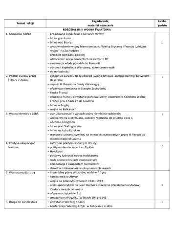 Temat lekcji 1. Kampania polska 2. Podbój Europy przez Hitlera i Stalina 3. Wojna Niemiec z ZSRR 4. Polityka okupacyjna Niemiec 5. Wojna poza Europą 6. Droga do zwycięstwa Zagadnienia, materiał nauczania ROZDZIAŁ III: II WOJNA ŚWIATOWA – prowokacje niemieckie i pierwsze strzały – bitwa graniczna – bitwa nad Bzurą – wypowiedzenie wojny Niemcom przez Wielką Brytanię i Francję („dziwna wojna” na Zachodzie) – przebieg kampanii polskiej – wkroczenie wojsk sowieckich na ziemie II RP – ewakuacja władz polskich do Rumunii – obrona i kapitulacja Warszawy, zakooczenie walk – straty ludności – ekspansja Związku Radzieckiego (wojna zimowa, aneksja paostw bałtyckich i Besarabii) – napaśd III Rzeszy na Danię i Norwegię – ofensywa niemiecka w Europie Zachodniej – klęska Francji – okupacja Francji, powstanie paostwa Vichy, utworzenie Komitetu Wolnej Francji gen. Charles’a de Gaulle’a – bitwa o Anglię – wojna na Bałkanach – plan „Barbarossa” i wybuch wojny niemiecko-radzieckiej – wielka wojna ojczyźniana, sukcesy Niemców do grudnia 1941 r. – obrona Leningradu – bitwa pod Stalingradem – bitwa na Łuku Kurskim – stosunek ludności cywilnej na terenach zajmowanych przez III Rzeszę do niemieckiego okupanta – założenia polityki rasowej III Rzeszy – polityka niemiecka wobec Żydów – Holokaust – postawy ludności wobec Holokaustu – ruch oporu w krajach okupowanych – kolaboracja z okupantem niemieckim – zbrodnie hitlerowskie w okupowanych krajach – imperialne plany Włochów, walki w Afryce – koniec walk w Afryce – wojna na Atlantyku w latach 1941–1943 – atak Japooczyków na Pearl Harbor i znaczenie przystąpienia Stanów Zjednoczonych do wojny – ofensywa Japonii w Azji – zmagania na Pacyfiku w latach 1941–1943 – powstanie Wielkiej Koalicji – konferencje Wielkiej Trójki w Teheranie i Jałcie Liczba godzin 1. 1 1 1 1 1 – desant aliantów na Sycylii i we Włoszech – ofensywa radziecka od 1944 do początku 1945 r. – desant w Normandii – droga do Berlina i kapitulacja Niemiec – ofensywa USA na Dalekim Wschodzie w 1945 r. – atak atomowy na Hiroszimę i Nagasaki, kapitulacja Japonii 7. Lekcja powtórzeniowa 8. Sprawdzian wiadomości 1 1