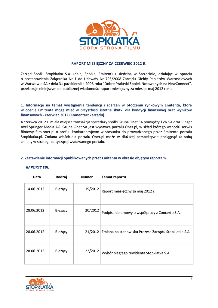 RAPORT MIESIĘCZNY ZA CZERWIEC 2012 R. Zarząd Spółki Stopklatka S.A. (dalej Spółka, Emitent) z siedzibą w Szczecinie, działając w oparciu o postanowienia Załącznika Nr 1 do Uchwały Nr 795/2008 Zarządu Giełdy Papierów Wartościowych w Warszawie SA z dnia 31 października 2008 roku "Dobre Praktyki Spółek Notowanych na NewConnect", przekazuje niniejszym do publicznej wiadomości raport miesięczny za miesiąc maj 2012 roku. 1. Informacje na temat wystąpienia tendencji i zdarzeń w otoczeniu rynkowym Emitenta, które w ocenie Emitenta mogą mieć w przyszłości istotne skutki dla kondycji finansowej oraz wyników finansowych - czerwiec 2012 (Komentarz Zarządu). 4 czerwca 2012 r. miała miejsce transakcja sprzedaży spółki Grupa Onet SA pomiędzy TVN SA oraz Ringer Axel Springer Media AG. Grupa Onet SA jest wydawcą portalu Onet.pl, w skład którego wchodzi serwis filmowy film.onet.pl o profilu konkurencyjnym w stosunku do prowadzonego przez Emitenta portalu Stopklatka.pl. Zmiana właściciela portalu Onet.pl może w dłuższej perspektywie pociągnąć za sobą zmiany w strategii dotyczącej wydawanego portalu. 2. Zestawienie informacji opublikowanych przez Emitenta w okresie objętym raportem. RAPORTY EBI: Data Rodzaj Numer Temat raportu 14.06.2012 Bieżący 19/2012 28.06.2012 Bieżący 20/2012 28.06.2012 Bieżący 21/2012 Zmiana na stanowisku Prezesa Zarządu Stopklatka S.A. 28.06.2012 Bieżący 22/2012 Raport miesięczny za maj 2012 r. Podpisanie umowy o współpracy z Concerto S.A. Wybór biegłego rewidenta Stopklatka S.A. 1 STOPKLATKA SPÓŁKA AKCYJNA RAPORT MIESIĘCZNY ZA CZERWIEC 2012 R. RAPORTY ESPI: W raportowanym okresie Spółka nie publikowała raportów ESPI. 3. Informacje na temat realizacji celów emisji, jeżeli taka realizacja choćby w części miała miejsce w okresie objętym raportem. W okresie objętym raportem Spółka prowadziła działania w zakresie: obsługi redakcyjnej oraz relacji z przeglądów i wydarzeń kulturalnych, patronatów medialnych dla wydarzeń kinowych i imprez specjalnych, kontynuacji prac projektowo-programistycznych w portalu Stopklatka.pl (dalej Portal). Poniżej znajduje się szczegółowy opis działań prowadzonych w raportowanym miesiącu. W czerwcu 2012 r. najważniejszymi wydarzeniami w działalności Stopklatki było: - rozpoczęcie współpracy z Radiem Zet, - wdrożenie nowej podstrony „Perły Starego Kina”, - afiliacja DVDRoller do grupy mediowej Emitenta. Emitent został partnerem programu filmowego „KinoZETka” emitowanego na antenie Radia Zet, a na Portalu została zamieszczona specjalna podstrona z wyborem aktualnych wywiadów filmowych w wersji audio, przeprowadzonych przez dziennikarzy Radia ZET. Specjalnie dla internautów został również zaimplementowany w serwisie player Radia ZET, ze specjalnie dobranymi muzycznymi kanałami tematycznymi, w tym z piosenkami i muzyką filmową. Player pozwala użytkownikom na słuchanie stacji online. Wiadomości kulturalne Radia ZET dostępne w serwisie Radiozet.pl zostały wzbogacone o informacje na temat wybranych filmów, a słuchaczom został udostępniony kontent z Portalu. W nowym dziale „Perły Starego Kina” Emitent prezentuje najciekawsze, pełnometrażowe polskie filmy nakręcone przed wojną. wszyscy użytkownicy Portalu mogą w dowolnym czasie obejrzeć 13 wyselekcjonowanych filmów i przenieść się w lata okresu międzywojennego. Wśród propozycji znajdują się tak uznane tytuły, jak: „Manewry miłosne”, „Jego ekscelencja subiekt”, „Książątko”, „Paweł i Gaweł”. Dzięki afiliacji dvdroller.pl do grupy mediowej Emitenta użytkownicy Portalu mogą korzystać z nowej funkcjonalności - INTERNETOWEJ GIEŁDY FILMOWEJ. Giełda powstała dla ludzi, którzy pasjonują się filmem, dla tych którzy cenią jakość obrazu i dźwięku, dla kolekcjonerów i nie tylko. Można na niej bezpłatnie wymienić się filmami na DVD i Blu-ray. Wszystkim powyższym działaniom towarzyszyły kampanie skoncentrowane na promocji. Działania zespołu redakcyjnego: W czerwcu br. redakcja Stopklatki prowadziła działania wokół następujących wydarzeń filmowych: - projekt filmu dokumentalnego Moje 89 Pokolenie, - Festiwal Transatlantyk, - Przegląd Kino Letnie w Warszawie, - Festiwal Animator, - Festiwal Wakacyjne Kadry, - Festiwal Lubuskie Lato Filmowe wraz z codziennymi relacjami, - Orange Kino Letnie. 2 STOPKLATKA SPÓŁKA AKCYJNA RAPORT MIESIĘCZNY ZA CZERWIEC 2012 R. Redakcja przeprowadziła i opublikowała wiele wywiadów, wśród nich wywiady z takimi osobowościami jak: Cameron Diaz, Glen Hansard, Kevin Macdonald, Idris Elba, Marcin Koszałka, Cezary Harasimowicz. W czerwcu przez Redakcję zostały napisane i opublikowane materiały w postaci: - dwuczęściowego przewodnika na temat letnich festiwali filmowych, - artykułu poświęconego premierom lata w polskich kinach, - artykułu o tematyce ciąży w kinie - autorstwa pisarki Joanny Woźniczko-Czeczott, - artykułu o filmie "Chwała dziwkom". Ponadto Redakcja opublikowała kolejne odcinki komiksu "The Movie", w tym specjalny odcinek przygotowany na Euro 2012. Redakcja wsparła działaniami inicjatywy działów marketingu i społeczności. W czerwcu w Stopklatce pojawiło się niemalże 700 informacji z kraju i zagranicy. Redakcja zamieściła recenzje wszystkich filmów kinowych wchodzących do kin w danym miesiącu i wielu filmów wydanych na DVD/Blu-ray. Do grona współpracujących ze Stopklatką dziennikarzy dołączyli: Anna Tatarska, Kamil Śmiałkowski, Joanna Ozdobińska (Nowy Jork), Jacek Wakar. Działania zespołu marketingowego i PR: W czerwcu 2012 r. na Portalu oraz w mediach zewnętrznych były prowadzone szerokie działania promocyjne trzech kluczowych projektów: - współpracy z Radiem Zet, - wdrożenia nowej podstrony „Perły Starego Kina”, - afiliacji DVDRoller do Stopklatki. W czerwcu br. Portal sprawował pieczę nad kilkunastoma wydarzeniami, wśród których