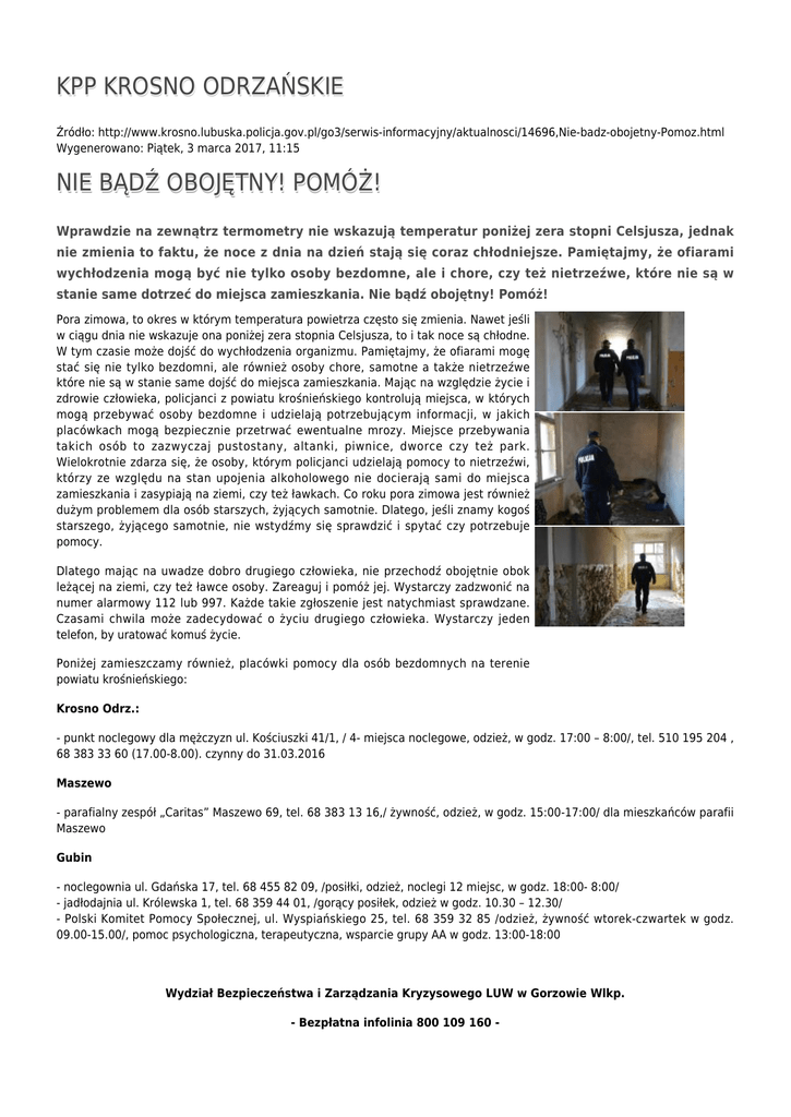 KPP KROSNO ODRZAŃSKIE Źródło: http://www.krosno.lubuska.policja.gov.pl/go3/serwis-informacyjny/aktualnosci/14696,Nie-badz-obojetny-Pomoz.html Wygenerowano: Piątek, 3 marca 2017, 11:15 NIE BĄDŹ OBOJĘTNY! POMÓŻ! Wprawdzie na zewnątrz termometry nie wskazują temperatur poniżej zera stopni Celsjusza, jednak nie zmienia to faktu, że noce z dnia na dzień stają się coraz chłodniejsze. Pamiętajmy, że ofiarami wychłodzenia mogą być nie tylko osoby bezdomne, ale i chore, czy też nietrzeźwe, które nie są w stanie same dotrzeć do miejsca zamieszkania. Nie bądź obojętny! Pomóż! Pora zimowa, to okres w którym temperatura powietrza często się zmienia. Nawet jeśli w ciągu dnia nie wskazuje ona poniżej zera stopnia Celsjusza, to i tak noce są chłodne. W tym czasie może dojść do wychłodzenia organizmu. Pamiętajmy, że ofiarami mogę stać się nie tylko bezdomni, ale również osoby chore, samotne a także nietrzeźwe które nie są w stanie same dojść do miejsca zamieszkania. Mając na względzie życie i zdrowie człowieka, policjanci z powiatu krośnieńskiego kontrolują miejsca, w których mogą przebywać osoby bezdomne i udzielają potrzebującym informacji, w jakich placówkach mogą bezpiecznie przetrwać ewentualne mrozy. Miejsce przebywania takich osób to zazwyczaj pustostany, altanki, piwnice, dworce czy też park. Wielokrotnie zdarza się, że osoby, którym policjanci udzielają pomocy to nietrzeźwi, którzy ze względu na stan upojenia alkoholowego nie docierają sami do miejsca zamieszkania i zasypiają na ziemi, czy też ławkach. Co roku pora zimowa jest również dużym problemem dla osób starszych, żyjących samotnie. Dlatego, jeśli znamy kogoś starszego, żyjącego samotnie, nie wstydźmy się sprawdzić i spytać czy potrzebuje pomocy. Dlatego mając na uwadze dobro drugiego człowieka, nie przechodź obojętnie obok leżącej na ziemi, czy też ławce osoby. Zareaguj i pomóż jej. Wystarczy zadzwonić na numer alarmowy 112 lub 997. Każde takie zgłoszenie jest natychmiast sprawdzane. Czasami chwila może zadecydować o życiu drugiego człowieka. Wystarczy jeden telefon, by uratować komuś życie. Poniżej zamieszczamy również, placówki pomocy dla osób bezdomnych na terenie powiatu krośnieńskiego: Krosno Odrz.: - punkt noclegowy dla mężczyzn ul. Kościuszki 41/1, / 4- miejsca noclegowe, odzież, w godz. 17:00 – 8:00/, tel. 510 195 204 , 68 383 33 60 (17.00-8.00). czynny do 31.03.2016 Maszewo - parafialny zespół „Caritas” Maszewo 69, tel. 68 383 13 16,/ żywność, odzież, w godz. 15:00-17:00/ dla mieszkańców parafii Maszewo Gubin - noclegownia ul. Gdańska 17, tel. 68 455 82 09, /posiłki, odzież, noclegi 12 miejsc, w godz. 18:00- 8:00/ - jadłodajnia ul. Królewska 1, tel. 68 359 44 01, /gorący posiłek, odzież w godz. 10.30 – 12.30/ - Polski Komitet Pomocy Społecznej, ul. Wyspiańskiego 25, tel. 68 359 32 85 /odzież, żywność wtorek-czwartek w godz. 09.00-15.00/, pomoc psychologiczna, terapeutyczna, wsparcie grupy AA w godz. 13:00-18:00 Wydział Bezpieczeństwa i Zarządzania Kryzysowego LUW w Gorzowie Wlkp. - Bezpłatna infolinia 800 109 160 - Ocena: 0/5 (0) Tweetnij