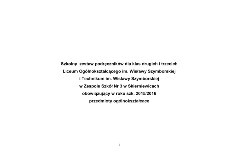 Szkolny zestaw podręczników dla klas drugich i trzecich Liceum Ogólnokształcącego im. Wisławy Szymborskiej i Technikum im. Wisławy Szymborskiej w Zespole Szkół Nr 3 w Skierniewicach obowiązujący w roku szk. 2015/2016 przedmioty ogólnokształcące 1 Autor/autorzy Tytuł podręcznika Nr dopuszczenia Wydawca JĘZYK POLSKI Zrozumieć tekst - zrozumieć człowieka. Romantyzm - pozytywizm. Podręcznik do języka polskiego. Liceum i technikum. Klasa 2. Część 1. Zakres podstawowy i rozszerzony. KLASA DRUGA Dariusz Chemperek, Adam Kalbarczyk, Dariusz Trześniowski Zrozumieć tekst - zrozumieć człowieka. Dariusz Chemperek, Adam Modernizm-dwudziestolecie międzywojenne Kalbarczyk, Dariusz (nurt klasyczny). Podręcznik do języka polskiego. Trześniowski Liceum i technikum. Klasa 2. Część 2. Zakres podstawowy i rozszerzony. 463/2/2012 463/4/2013 Wydawnictwa Szkolne i Pedagogiczne Sp. z o.o. Wydawnictwa Szkolne i Pedagogiczne Sp. z o.o. JĘZYK POLSKI Nowe Zrozumieć Tekst - zrozumieć człowieka. Dwudziestolecie międzywojenne (awangarda) powojenna nowoczesność. Podręcznik do języka polskiego. Liceum i technikum. Klasa 3. Zakres podstawowy i rozszerzony. KLASA TRZECIA Dariusz Chemperek, Adam Kalbarczyk, Dariusz Trześniowski 703/5/2014/ 2015 Wydawnictwa Szkolne i Pedagogiczne Sp. z o.o. JĘZYK ANGIELSKI zakres podstawowy Gateway plus 2. KLASA DRUGA David Spencer 674/2/2013 Macmillan Gateway plus 3. David Spencer 674/3/2014 Macmillan JĘZYK ANGIELSKI zakres rozszerzony Gateway plus 2. Gateway plus 3. KLASA DRUGA David Spencer David Spencer 2 674/2/2013 Macmillan 674/3/2014 Macmillan Gateway plus 4 David Spencer 674/4/2014 Macmillan Gateway plus 5. David Spencer 674/5/2014 Macmillan JĘZYK ANGIELSKI zakres rozszerzony New Matura Solutions Intermediate Zakres rozszerzony. Matura 2015 Repetytorium. Poziom podstawowy i rozszerzony. Podręcznik do języka angielskiego. Longman Repetytorium Maturalne Poziom rozszerzony. Longman Repetytorium Maturalne Poziom podstawowy. KLASA TRZECIA Tim Falla, Paul A. Davies, Małgorzata Wieruszewska 361/3/2012 Oxford Marta Rosińska, Lynda Edwards 710/2014 Macmillan Marta Umińska, Bob Hastings, Dominika Chandler, Beata Trapnell Marta Umińska, Bob Hastings, Dominika Chandler, Beata Trapnell, Rod Fricker. Angela Bandis 723/2014 Pearson 696/2014 Pearson 681/2014 Nowa Era 710/2014 Macmillan JĘZYK ANGIELSKI Destination Matura 2015. Repetytorium do języka angielskiego. Poziom podstawowy i rozszerzony. Podręcznik dla szkół ponadgimnazjalnych. Matura 2015 Repetytorium. Poziom podstawowy i rozszerzony. Podręcznik do języka angielskiego. KLASA CZWARTA TECHNIKUM Marta Inglot, Izabela Michalak, Anna Milewska, Katarzyna Mrozowska-Linda, Zbigniew Pokrzewiński, Beata Polit, Anna Rzeźnik, Agnieszka, SaramowiczGarstecka, Halina Tyliba Marta Rosińska, Lynda Edwards 3 JĘZYK NIEMIECKI - zakres podstawowy KLASA DRUGA S.Mróz-Dwornikowska, K. Szachowska Welttour. Język niemiecki dla szkół ponadgimnazjalnych. Część 2. 459/2/2012 Nowa Era Spółka z o.o. JĘZYK NIEMIECKI - zakres podstawowy KLASA TRZECIA S.Mróz-Dwornikowska, K. Szachowska Welttour. Język niemiecki dla szkół ponadgimnazjalnych. Część 3. 459/3/2013 Nowa Era Spółka z o.o. JĘZYK NIEMIECKI - zakres rozszerzony Alles klar 2a – zakres rozszerzony. Kurs dla początkujących i kontynuujących naukę po gimnazjum. Podręcznik z ćwiczeniami dla liceum ogólnokształcącego, liceum profilowanego i technikum. Alles klar 2b – zakres rozszerzony. Kurs dla początkujących i kontynuujących naukę po gimnazjum. Podręcznik z ćwiczeniami dla liceum ogólnokształcącego, liceum i technikum . KLASA DRUGA Krystyna Łuniewska, Urszulka Tworek, Zofia Wąsik Krystyna Łuniewska, Urszula Tworek, Zofia Wąsik 281/3/2011 Wydawnictwa Szkolne i Pedagogiczne Sp. z o.o. 281/4/2011 Wydawnictwa Szkolne i Pedagogiczne Sp. z o.o. JĘZYK NIEMIECKI zakres rozszerzony Alles klar 3a,b – zakres rozszerzony. Kurs dla początkujących i kontynuujących naukę po gimnazjum. Podręcznik z ćwiczeniami dla liceum ogólnokształcącego, liceum profilowanego i technikum Repetytorium maturalne Abitur. Repetytorium maturalne Welttour 4. KLASA TRZECIA Krystyna Łuniewska, Urszula 281/5/2011 Tworek, Zofia Wąsik Anna Kryczyńska-Pham, Joanna Szczęk Sylwia Mróz-Dwornikowska 4 Wydawnictwa Szkolne i Pedagogiczne Sp. z o.o. Nowa Era Spółka z o.o. 676/2014 459/4/2014 JĘZYK ROSYJSKI zakres podstawowy KLASA DRUGA Mirosław Zybert Новый Диaӆoг 2. Podręcznik do szkół ponadgimnazjalnych. Zakres podstawowy. Kurs dla początkujących. 682/2/2014 Wydawnictwa Szkolne i Pedagogiczne Spółka z o.o. JĘZYK ROSYJSKI zakres podstawowy Новый Диaӆoг 3. Podręcznik do szkół ponadgimnazjalnych. Zakres podstawowy. Kurs dla początkujących i kontynuujących naukę. Диaӆoг 2. Podręcznik do szkół ponadgimnazjalnych. Zakres podstawowy. Kurs dla początkujących i kontynuujących naukę. KLASA TRZECIA Olga Tatarchyk, Agnieszka Ślązak-Gwizdała 684/3/2014 Wydawnictwa Szkolne i Pedagogiczne Spółka z o.o. Mirosław Zybert 591/2/2013 Wydawnictwa Szkolne i Pedagogiczne Spółka. z o.o. 382/2/2013 Wydawnictwo Szkolne PWN Sp. z o.o. 382/3/2014 Wydawnictwo Szkolne PWN Spółka z o.o. 642/1/2013 Nowa Era Spółka z o.o. 642/2/2014 Nowa Era Spółka z o.o. JĘZYK FRANCUSKI KLASA Francofolie express 2. Podręcznik dla szkół ponadgimnazjalnych. DRUGA Regine Boutegege, Magdalena Supryn-Klepcarz JĘZYK FRANCUSKI Francofolie express 3. KLASA TRZECIA Regine Boutégège, Magdalena Supryn-Klepcarz HISTORIA zakres rozszerzony KLASA DRUGA (klasa II J) Zrozumieć przeszłość. Starożytność i Ryszard Kulesza, Krzysztof średniowiecze. Podręcznik do historii dla liceum Kowalewski ogólnokształcącego i technikum. Zakres rozszerzony. Zrozumieć przeszłość. Dzieje nowożytne. Paweł Klint, Podręcznik do historii dla liceum Piotr Galik 5 ogólnokształcącego i technikum. Zakres rozszerzony. Część 2. HISTORIA zakres 