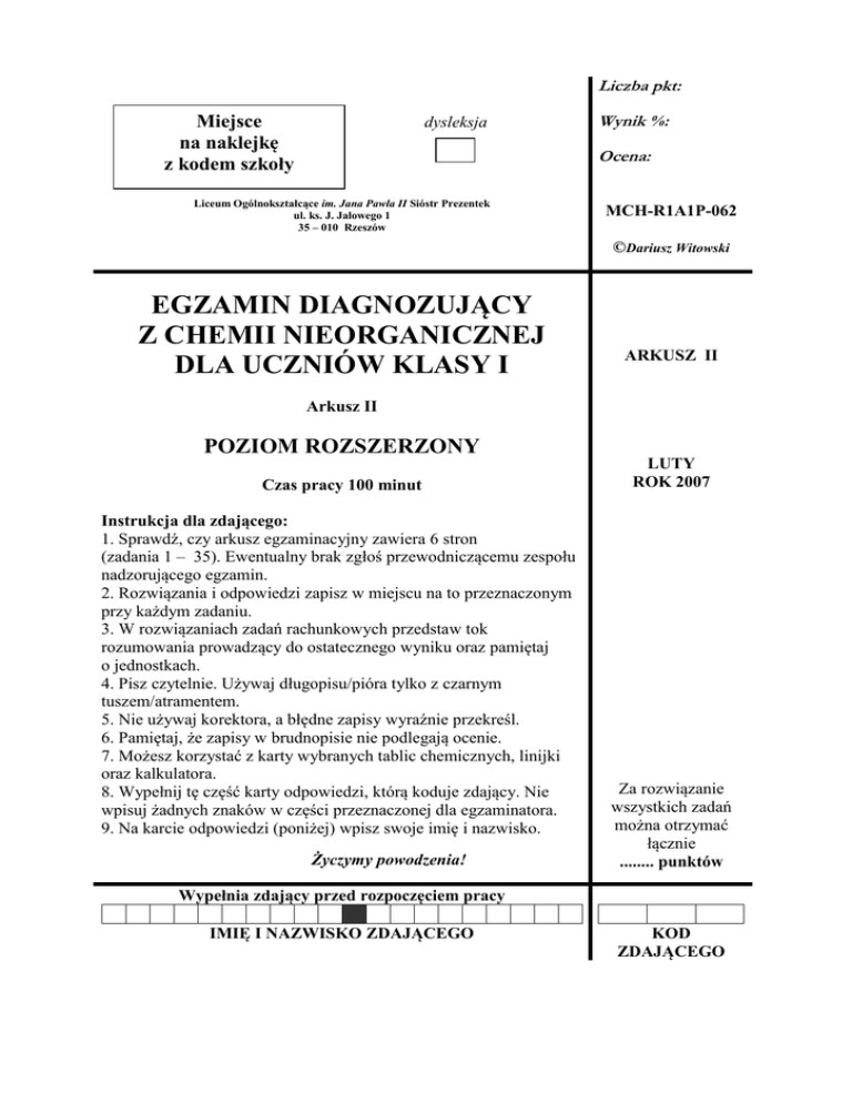 EGZAMIN DIAGNOZUJĄCY Z CHEMII NIEORGANICZNEJ DLA