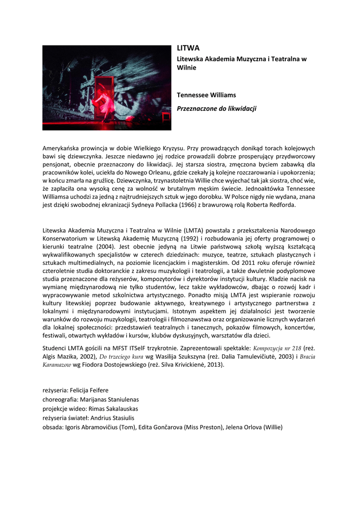 LITWA Litewska Akademia Muzyczna i Teatralna w Wilnie Tennessee Williams Przeznaczone do likwidacji Amerykańska prowincja w dobie Wielkiego Kryzysu. Przy prowadzących donikąd torach kolejowych bawi się dziewczynka. Jeszcze niedawno jej rodzice prowadzili dobrze prosperujący przydworcowy pensjonat, obecnie przeznaczony do likwidacji. Jej starsza siostra, zmęczona byciem zabawką dla pracowników kolei, uciekła do Nowego Orleanu, gdzie czekały ją kolejne rozczarowania i upokorzenia; w końcu zmarła na gruźlicę. Dziewczynka, trzynastoletnia Willie chce wyjechać tak jak siostra, choć wie, że zapłaciła ona wysoką cenę za wolność w brutalnym męskim świecie. Jednoaktówka Tennessee Williamsa uchodzi za jedną z najtrudniejszych sztuk w jego dorobku. W Polsce nigdy nie wydana, znana jest dzięki swobodnej ekranizacji Sydneya Pollacka (1966) z brawurową rolą Roberta Redforda. Litewska Akademia Muzyczna i Teatralna w Wilnie (LMTA) powstała z przekształcenia Narodowego Konserwatorium w Litewską Akademię Muzyczną (1992) i rozbudowania jej oferty programowej o kierunki teatralne (2004). Jest obecnie jedyną na Litwie państwową szkołą wyższą kształcącą wykwalifikowanych specjalistów w czterech dziedzinach: muzyce, teatrze, sztukach plastycznych i sztukach multimedialnych, na poziomie licencjackim i magisterskim. Od 2011 roku oferuje również czteroletnie studia doktoranckie z zakresu muzykologii i teatrologii, a także dwuletnie podyplomowe studia przeznaczone dla reżyserów, kompozytorów i dyrektorów instytucji kultury. Kładzie nacisk na wymianę międzynarodową nie tylko studentów, lecz także wykładowców, dbając o rozwój kadr i wypracowywanie metod szkolnictwa artystycznego. Ponadto misją LMTA jest wspieranie rozwoju kultury litewskiej poprzez budowanie aktywnego, kreatywnego i artystycznego partnerstwa z lokalnymi i międzynarodowymi instytucjami. Istotnym aspektem jej działalności jest tworzenie warunków do rozwoju muzykologii, teatrologii i filmoznawstwa oraz organizowanie licznych wydarzeń dla lokalnej społeczności: przedstawień teatralnych i tanecznych, pokazów filmowych, koncertów, festiwali, otwartych wykładów i kursów, klubów dyskusyjnych, warsztatów dla dzieci. Studenci LMTA gościli na MFST ITSelF trzykrotnie. Zaprezentowali spektakle: Kompozycja nr 218 (reż. Algis Mazika, 2002), Do trzeciego kura wg Wasilija Szukszyna (reż. Dalia Tamulevičiutė, 2003) i Bracia Karamazow wg Fiodora Dostojewskiego (reż. Silva Krivickienė, 2013). reżyseria: Felicija Feifere choreografia: Marijanas Staniulenas projekcje wideo: Rimas Sakalauskas reżyseria świateł: Andrius Stasiulis obsada: Igoris Abramovičius (Tom), Edita Gončarova (Miss Preston), Jelena Orlova (Willie)
