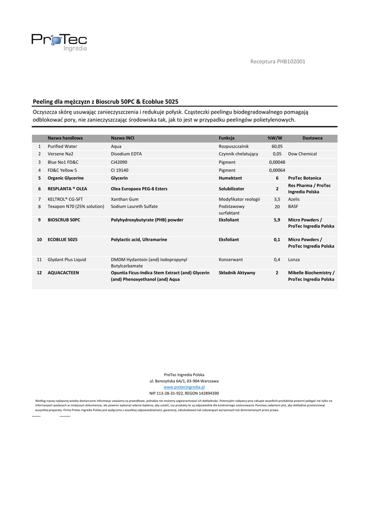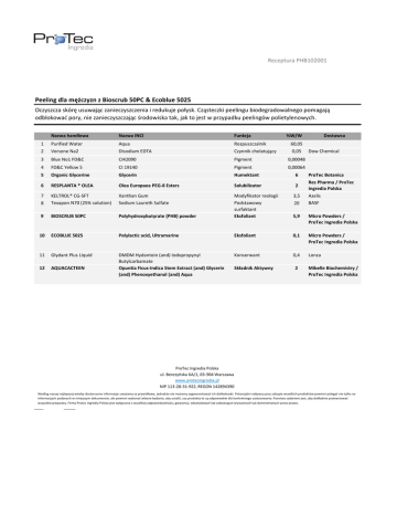 Receptura PHB102001 Peeling dla mężczyzn z Bioscrub 50PC & Ecoblue 5025 Oczyszcza skórę usuwając zanieczyszczenia i redukuje połysk. Cząsteczki peelingu biodegradowalnego pomagają odblokować pory, nie zanieczyszczając środowiska tak, jak to jest w przypadku peelingów polietylenowych. Nazwa handlowa Nazwa INCI Funkcja 1 2 Purified Water Versene Na2 Aqua Disodium EDTA Rozpuszczalnik Czynnik chelatujący 3 Blue No1 FD&C CI42090 Pigment 0,00048 4 FD&C Yellow 5 CI 19140 Pigment 0,00064 5 Organic Glycerine Glycerin Humektant 6 6 RESPLANTA ® OLEA Olea Europaea PEG-8 Esters Solubilizator 2 7 8 KELTROL® CG-SFT Texapon N70 (25% solution) Xanthan Gum Sodium Laureth Sulfate 9 BIOSCRUB 50PC Polyhydroxybutyrate (PHB) powder Modyfikator reologii Podstawowy surfaktant Eksfoliant 5,9 Micro Powders / ProTec Ingredia Polska 10 ECOBLUE 5025 Polylactic acid, Ultramarine Eksfoliant 0,1 Micro Powders / ProTec Ingredia Polska 11 Glydant Plus Liquid Konserwant 0,4 Lonza 12 AQUACACTEEN DMDM Hydantoin (and) Iodopropynyl Butylcarbamate Opuntia Ficus-Indica Stem Extract (and) Glycerin (and) Phenoxyethanol (and) Aqua Składnik Aktywny %W/W 60,05 0,05 3,5 20 2 Dostawca Dow Chemical ProTec Botanica Res Pharma / ProTec Ingredia Polska Azelis BASF Mibelle Biochemistry / ProTec Ingredia Polska ProTec Ingredia Polska ul. Berezyńska 6A/1, 03-904 Warszawa www.protecingredia.pl NIP 113-28-31-922, REGON 142894390 Według naszej najlepszej wiedzy dostarczone informacje uważamy za prawidłowe, jednakże nie możemy zagwarantować ich dokładności. Potencjalni nabywcy przy zakupie wszelkich produktów powinni polegać nie tylko na informacjach podanych w niniejszym dokumencie, ale powinni wykonać własne badania, aby ustalić, czy produkty te są odpowiednie dla konkretnego zastosowania. Panstwa zadaniem jest, aby dokładnie przetestować wszystkie preparaty. Firma Protec Ingredia Polska jest wyłączona z wszelkiej odpowiedzialności, gwarancji, odszkodowań lub zobowiązań wyrażonych lub domniemanych przez prawo. Sposób wykonania Do głównej kolby dodać: Purified Water Rozpocząć mieszanie z dużą prędkością Blue No1 FD&C FD&C Yellow 5 Disodium EDTA Mieszać do rozpuszczenia Podgrzewać do temperatury 80C W mniejszej kolbie przygotować mieszaninę: Organic Glycerine RESPLANTA ® OLEA KELTROL® CG-SFT Mieszać do otrzymania homogenicznej mieszaniny Mieszać do otrzymania gładkiej, pozbawionej grudek masy Wyłączyć mieszanie. Jeśli dostępna jest pompa próżniowa, rozpocząć wyciąganie próżni. Bardzo powoli dodać zawartość mniejszej kolby do kolby głównej. Przełączyć homogenizator na najwolniejszą prędkość. Delikatnie homogenizować unikając jeżeli to możliwe napowietrzenia. Homogenizować do uzyskania jednorodnej mieszaniny pozbawionej grudek. Wyłączyć homogenizator. Chłodzić do 23C. Do kolby głównej powoli dodać: Texapon N70 (25% solution) Mieszać bardzo powoli unikając napowietrzenia Mieszać do uzyskania homogenicznej mieszaniny W odpowiedniej kolbie przygotować: BIOSCRUB 50PC ECOBLUE 5025 Mieszać do uzyskania jednorodnej mieszaniny Glydant Plus Liquid Mieszać do uzyskania jednorodnej mieszaniny AQUACACTEEN Mieszać do uzyskania jednorodnej mieszaniny Kontynuować chłodzenie do 23C, a następnie sprawdzić zgodność ze specyfikacją. Specyfikacja produktu pH 6.00 -6.70 (jeśli pH jest zbyt niskie, dopasować za pomocą 50% roztworu kwasu cytrynowego) Lepkość 120-150,000 cps (LVT Spindle 3, Szybkość 10, 30 s) Kolor Biało-niebieski Wygląd Klarowny żel z białymi i niebieskimi drobinkami ProTec Ingredia Polska ul. Berezyńska 6A/1, 03-904 Warszawa www.protecingredia.pl NIP 113-28-31-922, REGON 142894390 Według naszej najlepszej wiedzy dostarczone informacje uważamy za prawidłowe, jednakże nie możemy zagwarantować ich dokładności. Potencjalni nabywcy przy zakupie wszelkich produktów powinni polegać nie tylko na informacjach podanych w niniejszym dokumencie, ale powinni wykonać własne badania, aby ustalić, czy produkty te są odpowiednie dla konkretnego zastosowania. Panstwa zadaniem jest, aby dokładnie przetestować wszystkie preparaty. Firma Protec Ingredia Polska jest wyłączona z wszelkiej odpowiedzialności, gwarancji, odszkodowań lub zobowiązań wyrażonych lub domniemanych przez prawo.