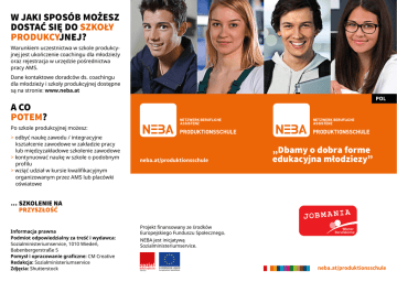 W JAKI SPOSÓB MOŻESZ DOSTAĆ SIĘ DO SZKOŁY PRODUKCYJNEJ? Warunkiem uczestnictwa w szkole produkcyjnej jest ukończenie coachingu dla młodzieży oraz rejestracja w urzędzie pośrednictwa pracy AMS. Dane kontaktowe doradców ds. coachingu dla młodzieży i szkoły produkcyjnej dostępne są na stronie: www.neba.at POL A CO POTEM? Po szkole produkcyjnej możesz: > odbyć naukę zawodu / integracyjne kształcenie zawodowe w zakładzie pracy lub międzyzakładowe szkolenie zawodowe > kontynuować naukę w szkole o podobnym profilu > wziąć udział w kursie kwalifikacyjnym organizowanym przez AMS lub placówki oświatowe neba.at/produktionsschule „Dbamy o dobra forme edukacyjna młodziezy” … SZKOLENIE NA PRZYSZŁOŚĆ Informacja prawna Podmiot odpowiedzialny za treść i wydawca: Sozialministeriumservice, 1010 Wiedeń, Babenbergerstraße 5 Pomysł i opracowanie graficzne: CM Creative Redakcja: Sozialministeriumservice Zdjęcia: Shutterstock Projekt finansowany ze środków Europejskiego Funduszu Społecznego. NEBA jest inicjatywą Sozialministeriumservice. neba.at/produktionsschule WIE LÄUFT DIE PRODUKTIONSSCHULE AB? Die Produktionsschule besteht aus vier Säulen: Trainingsmodule Es gibt Trainingsmodule mit den Schwerpunkten: WARUM PRODUKTIONSSCHULE? > Sie sind im 15. Lebensjahr oder älter und auf der Suche nach der für Sie idealen "AusBildung"? > Sie wollen die dafür notwendigen Kompetenzen trainieren? Die Produktionsschule kann Ihnen helfen, den für Sie idealen nächsten Ausbildungsschritt zu gehen. Sie können bis zu einem Jahr in der Produktionsschule bleiben. … ENTWICKLUNGSCHANCEN FÜR IHRE BERUFLICHE REIFE WAS IST DIE PRODUKTIONSSCHULE? Die Produktionsschule ist ein Angebot für Jugendliche und junge Erwachsene nach Beendigung ihrer Schulpflicht, die Unterstützung für ihre weitere schulische oder berufliche Ausbildung suchen. Die Produktionsschule trainiert Sie > im Verhalten bei der Arbeit (Konzentrationsfähigkeit, Sorgfalt, Pünktlichkeit, Selbständigkeit, …) > im Verhalten mit anderen Menschen (Benehmen, äußeres Erscheinungsbild, Umgang mit Kritik und Konflikten, …) > in der Berufswahlreife (Einschätzung der eigenen Fähigkeiten) … DIE PRODUKTIONSSCHULE IST KOSTENLOS UND FREIWILLIG > Aktivierung (Einstiegshilfe) > Übung (Training, berufliche Orientierung, …) > Spezialisierung (für Ihre spezifische Berufsausbildung) Coaching Ihr Coach begleitet Sie während der ganzen Dauer von der Produktionsschule und: > bespricht mit Ihnen alle 3 Monate Ihre Fortschritte > betreut Sie bei Lehrgängen zur Berufserprobung in Wirtschaftsbetrieben Wissenswerkstatt Hier können die für den nächsten Ausbildungsschritt notwendigen Kompetenzen optimal trainiert werden. Sportliche Aktivitäten Sport und Bewegung haben einen hohen Stellenwert bei der Produktionsschule und werden in unterschiedlichen Anforderungsniveaus angeboten. Am Ende wird eine Produktionsschule Zukunftsmappe übergeben.