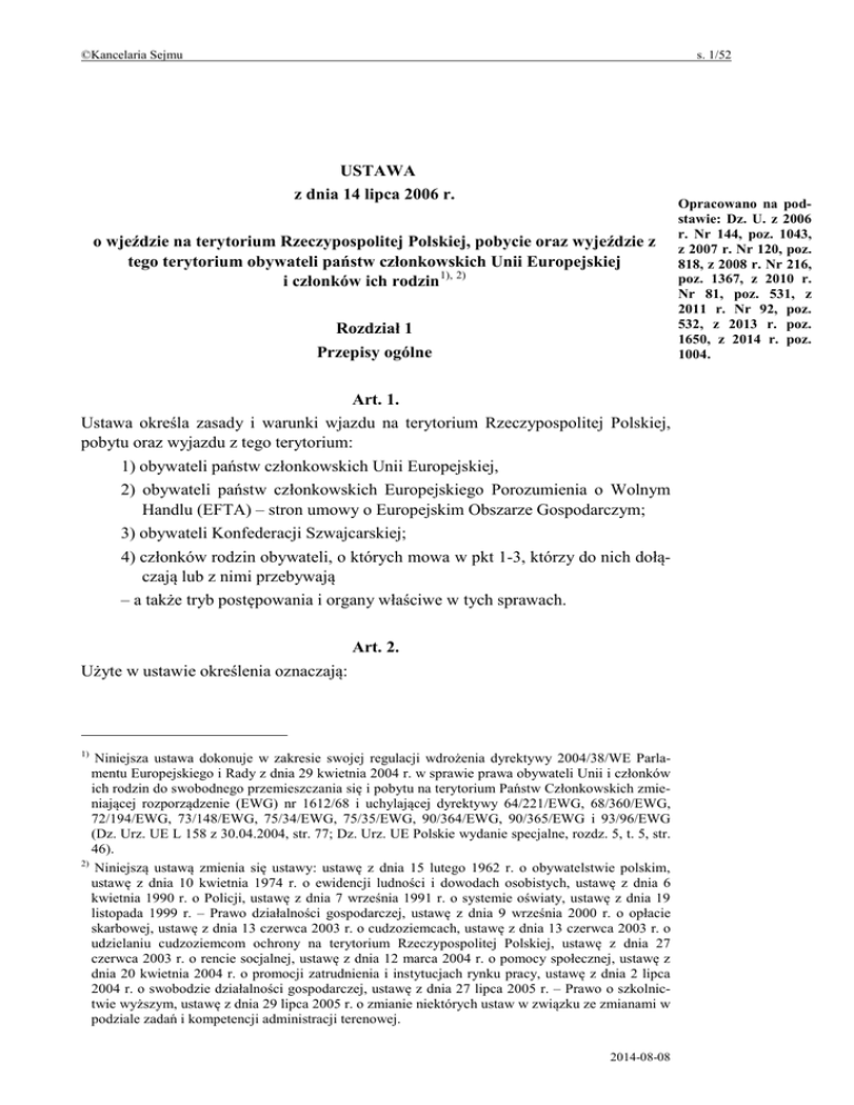 ©Kancelaria Sejmu s. 1/52 USTAWA z dnia 14 lipca 2006 r. o wjeździe na terytorium Rzeczypospolitej Polskiej, pobycie oraz wyjeździe z tego terytorium obywateli państw członkowskich Unii Europejskiej i członków ich rodzin 1), 2) Rozdział 1 Przepisy ogólne Art. 1. Ustawa określa zasady i warunki wjazdu na terytorium Rzeczypospolitej Polskiej, pobytu oraz wyjazdu z tego terytorium: 1) obywateli państw członkowskich Unii Europejskiej, 2) obywateli państw członkowskich Europejskiego Porozumienia o Wolnym Handlu (EFTA) – stron umowy o Europejskim Obszarze Gospodarczym; 3) obywateli Konfederacji Szwajcarskiej; 4) członków rodzin obywateli, o których mowa w pkt 1-3, którzy do nich dołączają lub z nimi przebywają – a także tryb postępowania i organy właściwe w tych sprawach. Art. 2. Użyte w ustawie określenia oznaczają: Niniejsza ustawa dokonuje w zakresie swojej regulacji wdrożenia dyrektywy 2004/38/WE Parlamentu Europejskiego i Rady z dnia 29 kwietnia 2004 r. w sprawie prawa obywateli Unii i członków ich rodzin do swobodnego przemieszczania się i pobytu na terytorium Państw Członkowskich zmieniającej rozporządzenie (EWG) nr 1612/68 i uchylającej dyrektywy 64/221/EWG, 68/360/EWG, 72/194/EWG, 73/148/EWG, 75/34/EWG, 75/35/EWG, 90/364/EWG, 90/365/EWG i 93/96/EWG (Dz. Urz. UE L 158 z 30.04.2004, str. 77; Dz. Urz. UE Polskie wydanie specjalne, rozdz. 5, t. 5, str. 46). 2) Niniejszą ustawą zmienia się ustawy: ustawę z dnia 15 lutego 1962 r. o obywatelstwie polskim, ustawę z dnia 10 kwietnia 1974 r. o ewidencji ludności i dowodach osobistych, ustawę z dnia 6 kwietnia 1990 r. o Policji, ustawę z dnia 7 września 1991 r. o systemie oświaty, ustawę z dnia 19 listopada 1999 r. – Prawo działalności gospodarczej, ustawę z dnia 9 września 2000 r. o opłacie skarbowej, ustawę z dnia 13 czerwca 2003 r. o cudzoziemcach, ustawę z dnia 13 czerwca 2003 r. o udzielaniu cudzoziemcom ochrony na terytorium Rzeczypospolitej Polskiej, ustawę z dnia 27 czerwca 2003 r. o rencie socjalnej, ustawę z dnia 12 marca 2004 r. o pomocy społecznej, ustawę z dnia 20 kwietnia 2004 r. o promocji zatrudnienia i instytucjach rynku pracy, ustawę z dnia 2 lipca 2004 r. o swobodzie działalności gospodarczej, ustawę z dnia 27 lipca 2005 r. – Prawo o szkolnictwie wyższym, ustawę z dnia 29 lipca 2005 r. o zmianie niektórych ustaw w związku ze zmianami w podziale zadań i kompetencji administracji terenowej. 1) 2014-08-08 Opracowano na podstawie: Dz. U. z 2006 r. Nr 144, poz. 1043, z 2007 r. Nr 120, poz. 818, z 2008 r. Nr 216, poz. 1367, z 2010 r. Nr 81, poz. 531, z 2011 r. Nr 92, poz. 532, z 2013 r. poz. 1650, z 2014 r. poz. 1004. ©Kancelaria Sejmu s. 2/52 1) granica – granicę państwową Rzeczypospolitej Polskiej w rozumieniu przepisów ustawy z dnia 12 października 1990 r. o ochronie granicy państwowej (Dz. U. z 2005 r. Nr 226, poz. 1944); [2) dokument podróży – dokument podróży w rozumieniu przepisów ustawy z dnia 13 czerwca 2003 r. o cudzoziemcach (Dz. U. Nr 128, poz. 1175, z późn. zm. 3));] <2) dokument podróży – dokument podróży w rozumieniu przepisów ustawy z dnia 12 grudnia 2013 r. o cudzoziemcach (Dz. U. poz. 1650 oraz z 2014 r. poz. 463);> 3) obywatel UE – cudzoziemca: a) obywatela państwa członkowskiego Unii Europejskiej, b) obywatela państwa członkowskiego Europejskiego Porozumienia o Wolnym Handlu (EFTA) – strony umowy o Europejskim Obszarze Gospodarczym, c) obywatela Konfederacji Szwajcarskiej; 4) członek rodziny – cudzoziemca będącego lub niebędącego obywatelem UE: a) małżonka obywatela UE, b) bezpośredniego zstępnego obywatela UE lub jego małżonka, w wieku do 21 lat lub pozostającego na utrzymaniu obywatela UE lub jego małżonka, c) bezpośredniego wstępnego obywatela UE lub jego małżonka, pozostającego na utrzymaniu obywatela UE lub jego małżonka; 5) osoba pracująca na własny rachunek – osobę fizyczną będącą przedsiębiorcą w rozumieniu przepisów ustawy z dnia 2 lipca 2004 r. o swobodzie działalności gospodarczej (Dz. U. Nr 173, poz. 1807, z późn. zm. 4)), a także każdą inną osobę fizyczną wykonującą działalność zarobkową we własnym imieniu i na własny rachunek, nawet gdy inne ustawy nie zaliczają tej działalności do działalności gospodarczej, lub osoby wykonującej taką działalność do przedsiębiorców; 6) państwo członkowskie – państwo członkowskie Unii Europejskiej, państwo członkowskie Europejskiego Porozumienia o Wolnym Handlu (EFTA) – stronę umowy o Europejskim Obszarze Gospodarczym, Konfederację Szwajcarską; 7) pracownik – osobę pozostającą w stosunku pracy, a także osobę wykonującą pracę w ramach umowy cywilnoprawnej; 8) wiza – wizę w rozumieniu przepisów ustawy z dnia 12 grudnia 2013 r. o cudzoziemcach (Dz. U. poz. 1650); Art. 2a. Zmiany wymienionej ustawy zostały ogłoszone w Dz. U. z 2004 r. Nr 96, poz. 959 i Nr 179, poz. 1842, z 2005 r. Nr 90, poz. 757, Nr 94, poz. 788, Nr 132, poz. 1105 i Nr 163, poz. 1362 oraz z 2006 r. Nr 104, poz. 708 i 711 i Nr 143, poz. 1027. 4) Zmiany wymienionej ustawy zostały ogłoszone w Dz. U. z 2004 r. Nr 281, poz. 2777, z 2005 r. Nr 33, poz. 289, Nr 94, poz. 788, Nr 143, poz. 1199, Nr 175, poz. 1460, Nr 177, poz. 1468, Nr 178, poz. 1480, Nr 179, poz. 1485, Nr 180, poz. 1494 i Nr 183, poz. 1538 oraz z 2006 r. Nr 17, poz. 127. 3) 2014-08-08 Nowe br zmienie pkt 2 w ar t. 2 wejdzie w życie z dn. 30.08.2014 r . (Dz. U. z 2014 r . poz. 1004). ©Kancelaria Sejmu s. 3/52 1. Do osób, o których mowa w art. 1, stosuje się przepisy art. 49–56, przepisy wydane na podstawie art. 57 ust. 1, art. 336 ust. 3, art. 337 ust. 1, art. 338, przepisy wydane na podstawie art. 339 ust. 1, art. 340–347, art. 394–427, art. 428 ust. 1 pkt 2 lit. a i k oraz pkt 3–5, art. 429 ust. 1 pkt 2, 7, 8 i 12 oraz ust. 2, art. 430 ust. 1, 2 pkt 5 i 7 oraz ust. 6 i 7, art. 432, art. 439–441, art. 444–447, art. 449–456 
