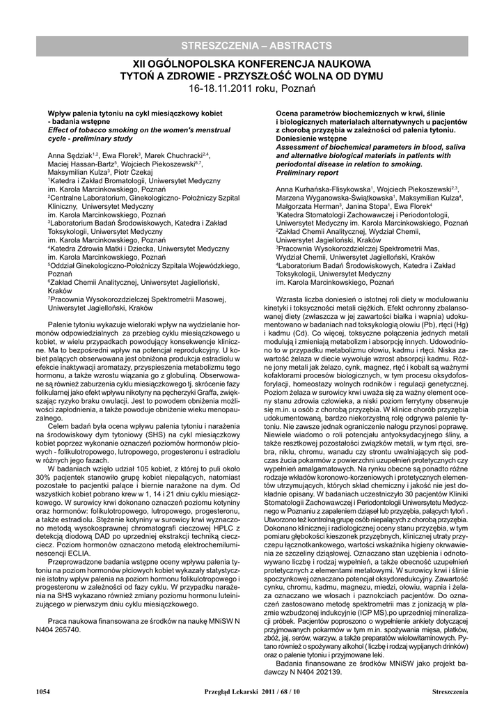 STRESZCZENIA ABSTRACTS XII OGÓLNOPOLSKA KONFERENCJA NAUKOWA TYTOÑ A ZDROWIE - PRZYSZ£OÆ WOLNA OD DYMU 16-18.11.2011 roku, Poznañ Wp³yw palenia tytoniu na cykl miesi¹czkowy kobiet - badania wstêpne Effect of tobacco smoking on the women's menstrual cycle - preliminary study Anna Sêdziak1,2, Ewa Florek3, Marek Chuchracki2,4, Maciej Hassan-Bartz5, Wojciech Piekoszewski6,7, Maksymilian Kulza3, Piotr Czekaj 1 Katedra i Zak³ad Bromatologii, Uniwersytet Medyczny im. Karola Marcinkowskiego, Poznañ 2 Centralne Laboratorium, Ginekologiczno- Po³o¿niczy Szpital Kliniczny, Uniwersytet Medyczny im. Karola Marcinkowskiego, Poznañ 3 Laboratorium Badañ rodowiskowych, Katedra i Zak³ad Toksykologii, Uniwersytet Medyczny im. Karola Marcinkowskiego, Poznañ 4 Katedra Zdrowia Matki i Dziecka, Uniwersytet Medyczny im. Karola Marcinkowskiego, Poznañ 5 Oddzia³ Ginekologiczno-Po³o¿niczy Szpitala Wojewódzkiego, Poznañ 6 Zak³ad Chemii Analitycznej, Uniwersytet Jagielloñski, Kraków 7 Pracownia Wysokorozdzielczej Spektrometrii Masowej, Uniwersytet Jagielloñski, Kraków Palenie tytoniu wykazuje wieloraki wp³yw na wydzielanie hormonów odpowiedzialnych za przebieg cyklu miesi¹czkowego u kobiet, w wielu przypadkach powoduj¹cy konsekwencje kliniczne. Ma to bezporedni wp³yw na potencja³ reprodukcyjny. U kobiet pal¹cych obserwowana jest obni¿ona produkcja estradiolu w efekcie inaktywacji aromatazy, przyspieszenia metabolizmu tego hormonu, a tak¿e wzrostu wi¹zania go z globulin¹. Obserwowane s¹ równie¿ zaburzenia cyklu miesi¹czkowego tj. skrócenie fazy folikularnej jako efekt wp³ywu nikotyny na pêcherzyki Graffa, zwiêkszaj¹c ryzyko braku owulacji. Jest to powodem obni¿enia mo¿liwoci zap³odnienia, a tak¿e powoduje obni¿enie wieku menopauzalnego. Celem badañ by³a ocena wp³ywu palenia tytoniu i nara¿enia na rodowiskowy dym tytoniowy (SHS) na cykl miesi¹czkowy kobiet poprzez wykonanie oznaczeñ poziomów hormonów p³ciowych - folikulotropowego, lutropowego, progesteronu i estradiolu w ró¿nych jego fazach. W badaniach wziê³o udzia³ 105 kobiet, z której to puli oko³o 30% pacjentek stanowi³o grupê kobiet niepal¹cych, natomiast pozosta³e to pacjentki pal¹ce i biernie nara¿one na dym. Od wszystkich kobiet pobrano krew w 1, 14 i 21 dniu cyklu miesi¹czkowego. W surowicy krwi dokonano oznaczeñ poziomu kotyniny oraz hormonów: folikulotropowego, lutropowego, progesteronu, a tak¿e estradiolu. Stê¿enie kotyniny w surowicy krwi wyznaczono metod¹ wysokosprawnej chromatografi cieczowej HPLC z detekcj¹ diodow¹ DAD po uprzedniej ekstrakcji technik¹ cieczciecz. Poziom hormonów oznaczono metod¹ elektrochemiluminescencji ECLIA. Przeprowadzone badania wstêpne oceny wp³ywu palenia tytoniu na poziom hormonów p³ciowych kobiet wykaza³y statystycznie istotny wp³yw palenia na poziom hormonu folikulotropowego i progesteronu w zale¿noci od fazy cyklu. W przypadku nara¿enia na SHS wykazano równie¿ zmiany poziomu hormonu luteinizuj¹cego w pierwszym dniu cyklu miesi¹czkowego. Praca naukowa finansowana ze rodków na naukê MNiSW N N404 265740. 1054 Ocena parametrów biochemicznych w krwi, linie i biologicznych materia³ach alternatywnych u pacjentów z chorob¹ przyzêbia w zale¿noci od palenia tytoniu. Doniesienie wstêpne Assessment of biochemical parameters in blood, saliva and alternative biological materials in patients with periodontal disease in relation to smoking. Preliminary report Anna Kurhañska-Flisykowska1, Wojciech Piekoszewski2,3, Marzena Wyganowska-wi¹tkowska1, Maksymilian Kulza4, Ma³gorzata Herman3, Janina Stopa1, Ewa Florek4 1 Katedra Stomatologii Zachowawczej i Periodontologii, Uniwersytet Medyczny im. Karola Marcinkowskiego, Poznañ 2 Zak³ad Chemii Analitycznej, Wydzia³ Chemii, Uniwersytet Jagielloñski, Kraków 3 Pracownia Wysokorozdzielczej Spektrometrii Mas, Wydzia³ Chemii, Uniwersytet Jagielloñski, Kraków 4 Laboratorium Badañ rodowiskowych, Katedra i Zak³ad Toksykologii, Uniwersytet Medyczny im. Karola Marcinkowskiego, Poznañ Wzrasta liczba doniesieñ o istotnej roli diety w modulowaniu kinetyki i toksycznoci metali ciê¿kich. Efekt ochronny zbalansowanej diety (zw³aszcza w jej zawartoci bia³ka i wapnia) udokumentowano w badaniach nad toksykologi¹ o³owiu (Pb), rtêci (Hg) i kadmu (Cd). Co wiêcej, toksyczne po³¹czenia jednych metali moduluj¹ i zmieniaj¹ metabolizm i absorpcjê innych. Udowodniono to w przypadku metabolizmu o³owiu, kadmu i rtêci. Niska zawartoæ ¿elaza w diecie wywo³uje wzrost absorpcji kadmu. Ró¿ne jony metali jak ¿elazo, cynk, magnez, rtêæ i kobalt s¹ wa¿nymi kofaktorami procesów biologicznych, w tym procesu oksydofosforylacji, homeostazy wolnych rodników i regulacji genetycznej. Poziom ¿elaza w surowicy krwi uwa¿a siê za wa¿ny element oceny stanu zdrowia cz³owieka, a niski poziom ferrytyny obserwuje siê m.in. u osób z chorob¹ przyzêbia. W klinice chorób przyzêbia udokumentowan¹, bardzo niekorzystn¹ rolê odgrywa palenie tytoniu. Nie zawsze jednak ograniczenie na³ogu przynosi poprawê. Niewiele wiadomo o roli potencja³u antyoksydacyjnego liny, a tak¿e resztkowej pozosta³oci zwi¹zków metali, w tym rtêci, srebra, niklu, chromu, wanadu czy strontu uwalniaj¹cych siê podczas ¿ucia pokarmów z powierzchni uzupe³nieñ protetycznych czy wype³nieñ amalgamatowych. Na rynku obecne s¹ ponadto ró¿ne rodzaje wk³adów koronowo-korzeniowych i protetycznych elementów utrzymuj¹cych, których sk³ad chemiczny i jakoæ nie jest dok³adnie opisany. W badaniach uczestniczy³o 30 pacjentów Kliniki Stomatologii Zachowawczej i Periodontologii Uniwersytetu Medycznego w Poznaniu z zapaleniem dzi¹se³ lub przyzêbia, pal¹cych tytoñ . Utworzono te¿ kontroln¹ grupê osób niepal¹cych z chorob¹ przyzêbia. Dokonano klinicznej i radiologicznej oceny stanu przyzêbia, w tym pomiaru g³êbokoci kieszonek przyzêbnych, klinicznej utraty przyczepu ³¹cznotkankowego, wartoci wskanika higien