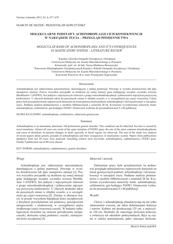 Nowiny Lekarskie 2012, 81, 6, 677–678 MARCIN DE MEZER1, PRZEMYSŁAW KOPCZYŃSKI2 MOLEKULARNE PODSTAWY ACHONDROPLAZJI I ICH KONSEKWENCJE W NARZĄDZIE ŻUCIA – PRZEGLĄD PIŚMIENNICTWA MOLECULAR BASIS OF ACHONDROPLASIA AND IT’S CONSEQUENCES IN MASTICATORY SYSTEM – LITERATURE REVIEW 1 Katedra i Klinika Ortopedii Szczękowej i Ortodoncji Uniwersytet Medyczny im. Karola Marcinkowskiego w Poznaniu Kierownik: prof. zw. dr hab. Teresa Matthews-Brzozowska 2 Pracownia Miniimplantów Ortodontycznych Katedry i Kliniki Ortopedii Szczękowej i Ortodoncji Uniwersytet Medyczny im. Karola Marcinkowskiego w Poznaniu Kierownik Pracowni: dr n. med. Przemysław Kopczyński Streszczenie Achondroplazja jest zaburzeniem autosomalnym, dominującym o pełnej penetracji. Powstaje w wyniku dziedziczenia lub jako następstwo mutacji. Prawie wszystkie przypadki są skutkiem tej samej mutacji genu kodującego receptor czynnika wzrostu fibroblastów 3 (FGFR3). Jest jednym z najczęstszych schorzeń z grupy osteochondrodysplazji i jednocześnie najczęstszą przyczyną karłowatości. U chorych dochodzi także do poważnych zmian w obrębie czaszki, a w szczególności jej części twarzowej. Celem pracy było przeanalizowanie najnowszych doniesień na temat genetycznych podstaw achondroplazji i ich konsekwencji w narządzie żucia. Poddano analizie piśmiennictwo z zasobów bibliotecznych z ostatnich 20 lat. Kryterium wyszukiwania stanowiły hasła: achondroplazja, cefalometria, gen kodujący FGFR3. Ostatecznie wybrano do przeanalizowania 9 z 80 publikacji. SŁOWA KLUCZOWE: achondroplazja, cefalometria, zaburzenia genetyczne. Summary Achondroplasia is an autosomal, dominant, full penetration genetic disorder. This condition can be inherited, but also is caused by novel mutations. Almost all cases are result of the same mutation of FGFR3 gene, the one of the most common chondrodysplasias and cause of dwarfism. In patients changes in skull, specially in facial region, are observed. The aim of the study was analysis of recent papers about genetic grounds of achondroplasia and their cosequences in masticatory system. Papers from publications databases from last 20 years were analysed. Searching criteria were keywords: achondroplasia, cephalometrics, FGFR3 gene. Finally 9 publication out of 80 were chosen. KEY WORDS: achondroplasia, cephalometrics, genetic disorders. Wstęp Materiał i metody Achondroplazja jest zaburzeniem autosomalnym, dominującym o pełnej penetracji. Powstaje w wyniku dziedziczenia lub jako następstwo mutacji [1]. Prawie wszystkie przypadki są skutkiem tej samej mutacji genu kodującego receptor czynnika wzrostu fibroblastów 3 (FGFR3). Jest jednym z najczęstszych schorzeń z grupy osteochondrodysplazji i jednocześnie najczęstszą przyczyną karłowatości. U chorych dochodzi także do poważnych zmian w obrębie czaszki, a w szczególności jej części twarzowej [2]. Zmiany w obszarze twarzy to przede wszystkim hipoplazja kości szczękowych, z dotylnym przechyleniem ich podstawy, powiększenie mózgoczaszki i niedorozwój, w szczególności piętra środkowego części twarzowej czaszki. W badaniu radiologicznym stwierdza się znaczne powiększenie mózgoczaszki, skrócenie tylnej podstawy czaszki, zmniejszenie kości szczękowej [3]. Założeniem pracy było przedstawienie na podstawie przeglądu piśmiennictwa najnowszych doniesień na temat genetycznych podstaw achondroplazji i ich konsekwencji w narządzie żucia. Poddano analizie piśmiennitwo z zasobów bibliotecznych z ostatnich 20 lat. Kryterium wyszukiwania stanowiły hasła: achondroplazja, cefalometria, gen kodujący FGFR3. Ostatecznie wybrano do przeanalizowania 9 z 80 publikacji. Wyniki Chorzy z achondroplazją charakteryzują się nie tylko zaburzeniem wzrostu, ale także deformacjami kończyn i stawów. Kobiety nie przekraczają 125 cm, a mężczyźni 130 cm. Dochodzi do znacznego skrócenia kończyn, a zwłaszcza ich odcinków proksymalnych. Ręce są często w całości pomniejszone, palce znacząco skrócone. PRACE POGLĄDOWE 678 Marcin de Mezer, Przemysław Kopczyński W obrębie stawów łokciowych i biodrowych stwierdza się przykurcze, ograniczające ich ruchy [4]. W odcinku piersiowo-lędźwiowym kręgosłupa występować może kifoza, w obrębie której stwierdza się znaczące przewężenie światła kanału kręgowego. W odcinku lędźwiowym dochodzi często do pogłebienia lordozy, a w odcinku krzyżowym do poziomego ułożenia kości krzyżowej [5]. Do poważnych zmian i charakterystycznych dla achondroplazji deformacji dochodzi w obrębie czaszki. Charakterystyczny wygląd czaszki manifestuje się powiększeniem mózgoczaszki, czemu towarzyszy znaczne powiększenie guzów czołowych [6]. W obrębie piętra środkowego twarzoczaszki zauważa się jej niedorozwój [7]. W obrazie radiologicznym zwraca się uwagę na skrócenie tylnej podstawy czaszki, zmniejszenie otworu wielkiego i jego skośne ustawienie. Kości szczękowe są zmniejszone, a zatoki czołowe ulegają powiększeniu [8]. Jak podają autorzy badań, przyczyną tak wielu zmian w obrazie czaszki są zaburzenia rozwoju kości na podłożu chrzęstnym oraz zbyt wczesne zrastanie się chrząstkozrostów podstawy czaszki, które są pierwotnymi centrami wzrostu [9]. Zaburzenie wzrostu podstawy czaszki wpływa na relacje pomiędzy szczęką i żuchwą, a to w konsekwencji na zaburzenia zębowo-zgryzowe [10]. Bjork wykazał, że charakterystycznemu zmniejszeniu kąta podstawy czaszki u chorych na achondroplazję, towarzyszy obniżanie się stawu skroniowo – żuchwowego. Skutkiem tego jest doprzednia rotacja szkieletu twarzy [11]. Towarzyszy temu prognatyczne położenie żuchwy, czemu towarzyszą doprzednie wady zgryzu charakterystyczne dla III klasy szkieletowej [12]. Wnioski W prezentowanej pracy autorzy na podstawie przeglądu piśmiennictwa wykazali molekularne podstawy choroby genetycznej, jaką jest achondroplazja i jej konsekwencje w zaburzeniac