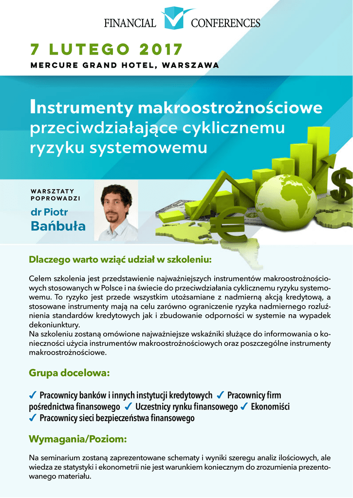FINANCIAL CONFERENCES 7 LUTEGo 2017 Mercure Grand Hotel, Warszawa Instrumenty makroostrożnościowe przeciwdziałające cyklicznemu ryzyku systemowemu W A R S Z TAT Y P O P R OWA D Z I dr Piotr Bańbuła Dlaczego warto wziąć udział w szkoleniu: Celem szkolenia jest przedstawienie najważniejszych instrumentów makroostrożnościowych stosowanych w Polsce i na świecie do przeciwdziałania cyklicznemu ryzyku systemowemu. To ryzyko jest przede wszystkim utożsamiane z nadmierną akcją kredytową, a stosowane instrumenty mają na celu zarówno ograniczenie ryzyka nadmiernego rozluźnienia standardów kredytowych jak i zbudowanie odporności w systemie na wypadek dekoniunktury. Na szkoleniu zostaną omówione najważniejsze wskaźniki służące do informowania o konieczności użycia instrumentów makroostrożnościowych oraz poszczególne instrumenty makroostrożnościowe. Grupa docelowa: Pracownicy banków i innych instytucji kredytowych Pracownicy firm pośrednictwa finansowego Uczestnicy rynku finansowego Ekonomiści Pracownicy sieci bezpieczeństwa finansowego Wymagania/Poziom: Na seminarium zostaną zaprezentowane schematy i wyniki szeregu analiz ilościowych, ale wiedza ze statystyki i ekonometrii nie jest warunkiem koniecznym do zrozumienia prezentowanego materiału. FINANCIAL CONFERENCES PrOGRAM 9.30 - 10.00 Rejestracja uczestników i poranna kawa Cykliczne ryzyko systemowe Wśrod wskaźnikow informujących o cyklicznym ryzyku systemowym omowione zostaną: • Wskaźniki cyklu kredytowego/finansowego • Luka kredytowa (credit gap) - kalibracja zgodna z Bazyleą III, rekomendacjami ERRS i uwzględniająca charakterystykę kraju • Modele wczesnego ostrzegania przed kryzysem bankowym Wszystkie wskaźniki zostaną zaprezentowane na przykładzie Polski 11.30 - 11.45 Przerwa na kawę Instrumenty makroostrożnościowe Przy prezentacji instrumentow każdorazowo omawiamy: • Przesłanki do ich nakładania • Uwarunkowania prawne i możliwą skalę • Sposob kalibracji instrumentu na przykładzie Polski Instrumenty harmonizowane: • CRR: dodatkowe narzuty na wagi ryzyka, w tym sektorowe wymogi kapitałowe, • Ustawa o nadzorze makroostrożnościowym: antycykliczny bufor kapitałowy. 13.00 - 13.45 Lunch Instrumenty nieharmonizowane: • Limity Debt-to-Income i Debt-Service-to-Income • Limit Loan-to-Value 16.00 Zakończenie warsztatu i wręczenie certyfikatów FINANCIAL CONFERENCES PrELEGENT dr Piotr Bańbuła Doktor nauk ekonomicznych, obroniony w Szkole Głównej Handlowej, gdzie ukończył też studia magisterskie na kierunku Finanse i Bankowość. Studiował ekonomię w Universidade de Santiago de Compostela w Hiszpanii. Od 2012 r. pracownik naukowy SGH, adiunkt w Katedrze Ekonomii Ilościowej. Prowadzi wykłady z Inżynierii Finansowej, Wyceny Aktywów i Rynków Finansowych. Związany z bankowością centralną i rynkiem finansowym. W Narodowym Banku Polskim przez kilka lat prowadził analizy rynków i instrumentów finansowych na potrzeby Zarządu i Rady Polityki Pieniężnej. Następnie przez dwa lata pracował jako ekonomista w Europejskim Banku Centralnym zajmując się m.in. problematyką kursu walutowego i bilansu płatniczego. Obecnie znów pracuje w instytucji sieci bezpieczeństwa finansowego, gdzie kieruje wydziałem odpowiedzialnym za politykę makroostrożnościową w Polsce.