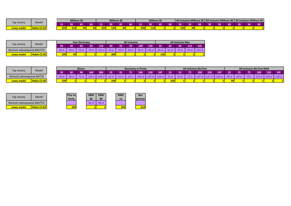 Typ zmiany Model nowy model Nokia C2-02 Typ zmiany Model Wartość zobowiązania BRUTTO nowy model Nokia C2-02 Typ zmiany Model Wartość zobowiązania NETTO nowy model Nokia C2-02 Typ zmiany Model 15 359 MIXtura 30 30 45 219 99 29 49 29 zł 49 zł 299 Nokia C2-02 49 Stan Darmowy 69 99 59 zł 49 79 zł 1 15 339 MIXtura 40 30 45 139 49 129 39 59 129 zł 39 zł 59 zł 1 1 209 60 Biznes 90 160 300 25 55 30 zł 48 zł 72 zł 128 zł 240 zł 25 zł 55 zł 239 1 Play na Kartę 1 1 RBM 66 RBM 88 66 zł 499 1 60 1 249 15 299 All Inclusive 79 109 69 zł 1 30 Wartość zobowiązania BRUTTO nowy model 60 89 zł 1 45 139 zł 45 zł 1 Rozmowy w Firmie 75 100 150 65.1 1 RBM na 1 139 1 100 zł 1 1 Bez promoc 88 zł 1 MIXtura 50 30 45 119 1 499 619 120 zł 1 60 All Inclusive MIXtura 30 All Inclusive MIXtura 40 All Inclusive MIXtura 50 39 54 69 39 54 69 39 54 69 1 149 39 1 1 1 1 1 1 1 All Inclusive Max 65 85 115 65 zł 139 75 zł 1 1 VIP 25 55 250 zł 32 zł 62 zł 1 169 145 95 zł 145 zł 1 1 All Inclusive dla Firm 75 100 150 72.1 1 107 zł 1 1 127 zł 1 All Inclusive dla Firm MAX 55 75 100 150 VIP 25 250 zł 39 zł 1 99 69 zł 79.1 1 114 zł 1 1 VIP 134 zł 1 250 zł 1