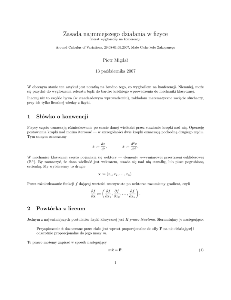równania ruchu Newtona (3) do równania Eulera-Lagrange’a (5) nie tylko wygląda jak sztuczka matematyczna. Ono po prostu jest sztuczką matematyczną. W szczególności po to potencjał nazwaliśmy uogólnionym,