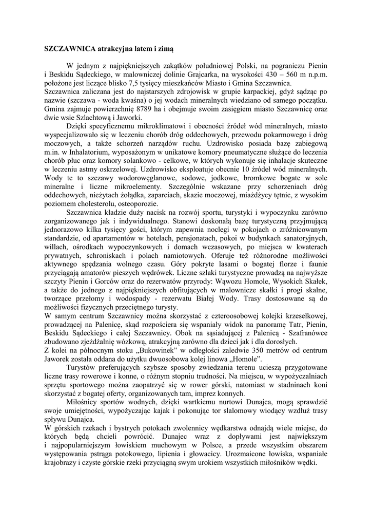 SZCZAWNICA atrakcyjna latem i zimą W jednym z najpiękniejszych zakątków południowej Polski, na pograniczu Pienin i Beskidu Sądeckiego, w malowniczej dolinie Grajcarka, na wysokości 430 – 560 m n.p.m. położone jest liczące blisko 7,5 tysięcy mieszkańców Miasto i Gmina Szczawnica. Szczawnica zaliczana jest do najstarszych zdrojowisk w grupie karpackiej, gdyż sądząc po nazwie (szczawa - woda kwaśna) o jej wodach mineralnych wiedziano od samego początku. Gmina zajmuje powierzchnię 8789 ha i obejmuje swoim zasięgiem miasto Szczawnicę oraz dwie wsie Szlachtową i Jaworki. Dzięki specyficznemu mikroklimatowi i obecności źródeł wód mineralnych, miasto wyspecjalizowało się w leczeniu chorób dróg oddechowych, przewodu pokarmowego i dróg moczowych, a także schorzeń narządów ruchu. Uzdrowisko posiada bazę zabiegową m.in. w Inhalatorium, wyposażonym w unikatowe komory pneumatyczne służące do leczenia chorób płuc oraz komory solankowo - celkowe, w których wykonuje się inhalacje skuteczne w leczeniu astmy oskrzelowej. Uzdrowisko eksploatuje obecnie 10 źródeł wód mineralnych. Wody te to szczawy wodorowęglanowe, sodowe, jodkowe, bromkowe bogate w sole mineralne i liczne mikroelementy. Szczególnie wskazane przy schorzeniach dróg oddechowych, nieżytach żołądka, zaparciach, skazie moczowej, miażdżycy tętnic, z wysokim poziomem cholesterolu, osteoporozie. Szczawnica kładzie duży nacisk na rozwój sportu, turystyki i wypoczynku zarówno zorganizowanego jak i indywidualnego. Stanowi doskonałą bazę turystyczną przyjmującą jednorazowo kilka tysięcy gości, którym zapewnia noclegi w pokojach o zróżnicowanym standardzie, od apartamentów w hotelach, pensjonatach, pokoi w budynkach sanatoryjnych, willach, ośrodkach wypoczynkowych i domach wczasowych, po miejsca w kwaterach prywatnych, schroniskach i polach namiotowych. Oferuje też różnorodne możliwości aktywnego spędzania wolnego czasu. Góry pokryte lasami o bogatej florze i faunie przyciągają amatorów pieszych wędrówek. Liczne szlaki turystyczne prowadzą na najwyższe szczyty Pienin i Gorców oraz do rezerwatów przyrody: Wąwozu Homole, Wysokich Skałek, a także do jednego z najpiękniejszych obfitujących w malownicze skałki i progi skalne, tworzące przełomy i wodospady - rezerwatu Białej Wody. Trasy dostosowane są do możliwości fizycznych przeciętnego turysty. W samym centrum Szczawnicy można skorzystać z czteroosobowej kolejki krzesełkowej, prowadzącej na Palenicę, skąd rozpościera się wspaniały widok na panoramę Tatr, Pienin, Beskidu Sądeckiego i całej Szczawnicy. Obok na sąsiadującej z Palenicą - Szafranówce zbudowano zjeżdżalnię wózkową, atrakcyjną zarówno dla dzieci jak i dla dorosłych. Z kolei na północnym stoku „Bukowinek” w odległości zaledwie 350 metrów od centrum Jaworek została oddana do użytku dwuosobowa kolej linowa „Homole”. Turystów preferujących szybsze sposoby zwiedzania terenu ucieszą przygotowane liczne trasy rowerowe i konne, o różnym stopniu trudności. Na miejscu, w wypożyczalniach sprzętu sportowego można zaopatrzyć się w rower górski, natomiast w stadninach koni skorzystać z bogatej oferty, organizowanych tam, imprez konnych. Miłośnicy sportów wodnych, dzięki wartkiemu nurtowi Dunajca, mogą sprawdzić swoje umiejętności, wypożyczając kajak i pokonując tor slalomowy wiodący wzdłuż trasy spływu Dunajca. W górskich rzekach i bystrych potokach zwolennicy wędkarstwa odnajdą wiele miejsc, do których będą chcieli powrócić. Dunajec wraz z dopływami jest największym i najpopularniejszym łowiskiem muchowym w Polsce, a przede wszystkim obszarem występowania pstrąga potokowego, lipienia i głowacicy. Urozmaicone łowiska, wspaniałe krajobrazy i czyste górskie rzeki przyciągną swym urokiem wszystkich miłośników wędki. Pobyt w Szczawnicy to również doskonała okazja do poznania uroków Pienińskiego Parku Narodowego, zwiedzenia pobliskich zamków w Niedzicy i Czorsztynie, podróży statkiem po Jeziorze Czorsztyńskim, a także skorzystania z jednej z największych atrakcji turystyczno-krajobrazowych Pienin, spływu tratwami przełomem Dunajca. Szczawnica jest atrakcyjna także zimą. Wraz z pierwszymi opadami śniegu przekształca się w centrum sportów zimowych. Na terenie miasta - w centrum, w Jaworkach i pod Durbaszką - znajdują się wyciągi narciarskie oraz trasy zjazdowe zarówno dla początkujących jak i zaawansowanych amatorów białego szaleństwa. Narciarzy o większych umiejętnościach ucieszy sztucznie śnieżona trasa na stoku Palenicy, posiadająca homologację FIS, na której rozgrywane są zawody alpejskie. Możliwość pełnej satysfakcji z uprawianego narciarstwa, także i zwolennikom jazdy rekreacyjnej, dostarczy oddana do użytku oświetlona trasa zjazdowa o długości 1800 m Palenica II. W Szczawnicy znajdują się liczne wypożyczalnie sprzętu narciarskiego i snowboardowego. Na stokach narciarskich swoje usługi oferują fachowi instruktorzy narciarstwa. Folklor góralski jest w Szczawnicy wciąż żywy i widoczny w gwarze pienińskiej, strojach ludowych noszonych przez flisaków, dorożkarzy i rodowitych szczawniczan podczas uroczystości, a także w wyrobach tutejszych rzemieślników i dziełach twórców ludowych. Działają tu zespoły regionalne oraz Pieniński Oddział Związku Podhalan. Największym świętem lokalnego folkloru, przybliżającym zwyczaje i tradycje góralskopasterskie jest organizowane w lipcu przez Miejski Ośrodek Kultury „Lato Pienińskie". Przez cały rok w pijalni uzdrowiskowej funkcjonuje Galeria Wystaw Pijalni Wód Mineralnych, w której prezentowane są prace wybitnych twórców, z kolei w odrestaurowanym budynku przy Placu Dietla mieści się Muzeum Historii Uzdrowiska gromadzące dokumenty i obiekty muzealne dotyczące powstania i historii szczawnickiego kurortu. W Muzeum Pienińskim im. Józefa Szalaya w 