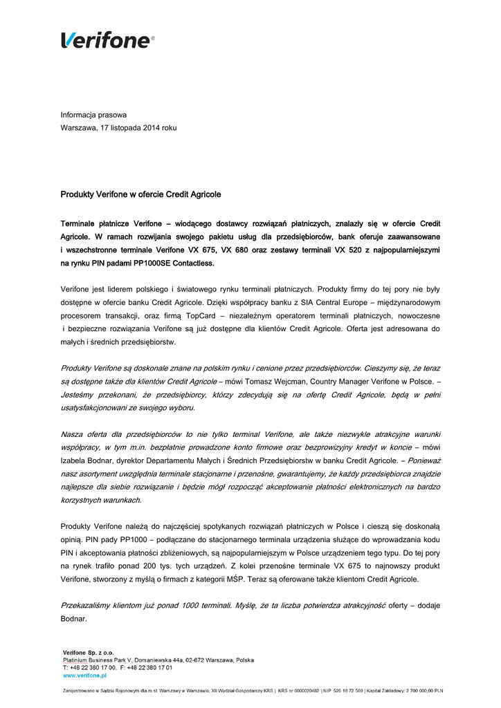 Informacja prasowa Warszawa, 17 listopada 2014 roku Produkty Verifone w ofercie Credit Agricole Terminale płatnicze Verifone – wiodącego dostawcy rozwiązań płatniczych, znalazły się w ofercie Credit Agricole. W ramach rozwijania swojego pakietu usług dla przedsiębiorców, bank oferuje zaawansowane i wszechstronne terminale Verifone VX 675, VX 680 oraz zestawy terminali VX 520 z najpopularniejszymi na rynku PIN padami PP1000SE Contactless. Verifone jest liderem polskiego i światowego rynku terminali płatniczych. Produkty firmy do tej pory nie były dostępne w ofercie banku Credit Agricole. Dzięki współpracy banku z SIA Central Europe – międzynarodowym procesorem transakcji, oraz firmą TopCard – niezależnym operatorem terminali płatniczych, nowoczesne i bezpieczne rozwiązania Verifone są już dostępne dla klientów Credit Agricole. Oferta jest adresowana do małych i średnich przedsiębiorstw. Produkty Verifone są doskonale znane na polskim rynku i cenione przez przedsiębiorców. Cieszymy się, że teraz są dostępne także dla klientów Credit Agricole – mówi Tomasz Wejcman, Country Manager Verifone w Polsce. – Jesteśmy przekonani, że przedsiębiorcy, którzy zdecydują się na ofertę Credit Agricole, będą w pełni usatysfakcjonowani ze swojego wyboru. Nasza oferta dla przedsiębiorców to nie tylko terminal Verifone, ale także niezwykle atrakcyjne warunki współpracy, w tym m.in. bezpłatnie prowadzone konto firmowe oraz bezprowizyjny kredyt w koncie – mówi Izabela Bodnar, dyrektor Departamentu Małych i Średnich Przedsiębiorstw w banku Credit Agricole. – Ponieważ nasz asortyment uwzględnia terminale stacjonarne i przenośne, gwarantujemy, że każdy przedsiębiorca znajdzie najlepsze dla siebie rozwiązanie i będzie mógł rozpocząć akceptowanie płatności elektronicznych na bardzo korzystnych warunkach. Produkty Verifone należą do najczęściej spotykanych rozwiązań płatniczych w Polsce i cieszą się doskonałą opinią. PIN pady PP1000 – podłączane do stacjonarnego terminala urządzenia służące do wprowadzania kodu PIN i akceptowania płatności zbliżeniowych, są najpopularniejszym w Polsce urządzeniem tego typu. Do tej pory na rynek trafiło ponad 200 tys. tych urządzeń. Z kolei przenośne terminale VX 675 to najnowszy produkt Verifone, stworzony z myślą o firmach z kategorii MŚP. Teraz są oferowane także klientom Credit Agricole. Przekazaliśmy klientom już ponad 1000 terminali. Myślę, że ta liczba potwierdza atrakcyjność oferty – dodaje Bodnar. Współpraca ma charakter długoterminowy i obowiązuje od sierpnia bieżącego roku. O Verifone Verifone jest wiodącym dostawcą bezpiecznych rozwiązań płatniczych, w tym wszechstronnych terminali do akceptowania płatności elektronicznych. Poprzez inwestycje w rozwój technologiczny swoich rozwiązań, Verifone wspiera rozwój branży handlowej i tworzy nowe możliwości zwiększenia dochodów handlowców. Od ponad 30 lat firma jest liderem bezpiecznych płatności elektronicznych. Obecnie zarządza siecią ponad 26 milionów urządzeń płatniczych na całym świecie – w tym terminalami stacjonarnymi, przenośnymi, multimedialnymi i samoobsługowymi. Godni zaufania eksperci Verifone każdego dnia wspierają klientów, oferując rozwiązania płatnicze dopasowane do ich indywidualnych potrzeb. Wśród partnerów Verifone znajdują się najbardziej znane marki, instytucje finansowe i agenci rozliczeniowi ze 150 krajów świata. Verifone.pl | @verifone Dodatkowe informacje: Verifone Sp. z o.o. Credit Agricole Bank Polska: Agata Adamczewska Agnieszka Gorzkowicz T. +48 22 380 17 75 T. +48 71 377 85 14 M. +48 784 575 042 M. +48 512 191 707 E. [email protected] E. [email protected]