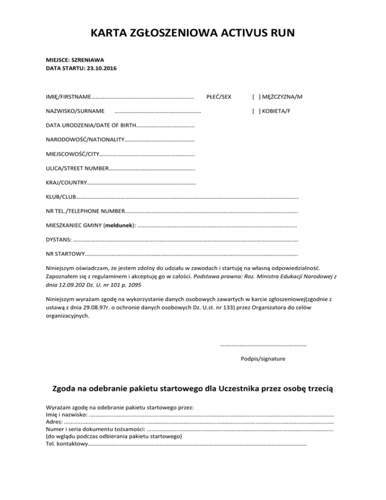 KARTA ZGŁOSZENIOWA ACTIVUS RUN MIEJSCE: SZRENIAWA DATA STARTU: 23.10.2016 IMIĘ/FIRSTNAME…………………………………………………………… NAZWISKO/SURNAME …………………………………………………. PŁEĆ/SEX [ ] MĘŻCZYZNA/M [ ] KOBIETA/F DATA URODZENIA/DATE OF BIRTH………………………………… NARODOWOŚĆ/NATIONALITY……………………………………….. MIEJSCOWOŚĆ/CITY………………………………………………………. ULICA/STREET NUMBER…………………………………………………. KRAJ/COUNTRY………………………………………………………………. KLUB/CLUB………………………………………………………………………………………………………………………………….. NR TEL./TELEPHONE NUMBER…………………………………………………………………………………………………….. MIESZKANIEC GMINY (meldunek): …………..………………………………………………………………………………… DYSTANS: ……………………………………………………………………………………………………………………………………. NR STARTOWY…………………………………………………………………………………………………………………………….. Niniejszym oświadczam, że jestem zdolny do udziału w zawodach i startuję na własną odpowiedzialność. Zapoznałem się z regulaminem i akceptuję go w całości. Podstawa prawna: Roz. Ministra Edukacji Narodowej z dnia 12.09.202 Dz. U. nr 101 p. 1095 Niniejszym wyrażam zgodę na wykorzystanie danych osobowych zawartych w karcie zgłoszeniowej(zgodnie z ustawą z dnia 29.08.97r. o ochronie danych osobowych Dz. U.st. nr 133) przez Organizatora do celów organizacyjnych. …………………….…………………………… Podpis/signature Zgoda na odebranie pakietu startowego dla Uczestnika przez osobę trzecią Wyrażam zgodę na odebranie pakietu startowego przez: Imię i nazwisko: ...................................................................................................................................................... Adres: ..................................................................................................................................................................... Numer i seria dokumentu tożsamości: .................................................................................................................. (do wglądu podczas odbierania pakietu startowego) Tel. kontaktowy…………………………………………………………………………………………………………………………………