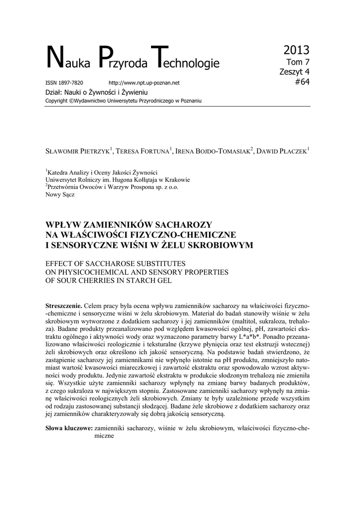 Nauka Przyroda Technologie ISSN 1897-7820 http://www.npt.up-poznan.net 2013 Tom 7 Zeszyt 4 #64 Dział: Nauki o Żywności i Żywieniu Copyright ©Wydawnictwo Uniwersytetu Przyrodniczego w Poznaniu SŁAWOMIR PIETRZYK1, TERESA FORTUNA1, IRENA BOJDO-TOMASIAK2, DAWID PŁACZEK1 1 Katedra Analizy i Oceny Jakości Żywności Uniwersytet Rolniczy im. Hugona Kołłątaja w Krakowie 2 Przetwórnia Owoców i Warzyw Prospona sp. z o.o. Nowy Sącz WPŁYW ZAMIENNIKÓW SACHAROZY NA WŁAŚCIWOŚCI FIZYCZNO-CHEMICZNE I SENSORYCZNE WIŚNI W ŻELU SKROBIOWYM EFFECT OF SACCHAROSE SUBSTITUTES ON PHYSICOCHEMICAL AND SENSORY PROPERTIES OF SOUR CHERRIES IN STARCH GEL Streszczenie. Celem pracy była ocena wpływu zamienników sacharozy na właściwości fizyczno-chemiczne i sensoryczne wiśni w żelu skrobiowym. Materiał do badań stanowiły wiśnie w żelu skrobiowym wytworzone z dodatkiem sacharozy i jej zamienników (maltitol, sukraloza, trehaloza). Badane produkty przeanalizowano pod względem kwasowości ogólnej, pH, zawartości ekstraktu ogólnego i aktywności wody oraz wyznaczono parametry barwy L*a*b*. Ponadto przeanalizowano właściwości reologicznie i teksturalne (krzywe płynięcia oraz test ekstruzji wstecznej) żeli skrobiowych oraz określono ich jakość sensoryczną. Na podstawie badań stwierdzono, że zastąpienie sacharozy jej zamiennikami nie wpłynęło istotnie na pH produktu, zmniejszyło natomiast wartość kwasowości miareczkowej i zawartość ekstraktu oraz spowodowało wzrost aktywności wody produktu. Jedynie zawartość ekstraktu w produkcie słodzonym trehalozą nie zmieniła się. Wszystkie użyte zamienniki sacharozy wpłynęły na zmianę barwy badanych produktów, z czego sukraloza w największym stopniu. Zastosowane zamienniki sacharozy wpłynęły na zmianę właściwości reologicznych żeli skrobiowych. Zmiany te były uzależnione przede wszystkim od rodzaju zastosowanej substancji słodzącej. Badane żele skrobiowe z dodatkiem sacharozy oraz jej zamienników charakteryzowały się dobrą jakością sensoryczną. Słowa kluczowe: zamienniki sacharozy, wiśnie w żelu skrobiowym, właściwości fizyczno-chemiczne 2 Pietrzyk S., Fortuna T., Bojdo-Tomasiak I., Płaczek D., 2013. Wpływ zamienników sacharozy na właściwości fizyczno-chemiczne i sensoryczne wiśni w żelu skrobiowym. Nauka Przyr. Technol. 7, 4, #64. Wstęp Jednym z przetworów owocowych dostępnych na rynku polskim są tzw. owoce w żelu lub wsady owocowe. Są to produkty handlowe otrzymane przez wymieszanie całych lub pokrojonych owoców z żelem skrobiowym, a następnie poddane pasteryzacji w puszkach. Głównym składnikiem żelu jest skrobia (naturalna, modyfikowana lub ich mieszanina) z dodatkiem cukrów (lub ich zamienników), kwasów spożywczych, środków konserwujących oraz substancji aromatyzujących, barwiących i stabilizujących. Owoce w żelu przeważnie wykorzystuje się w przemyśle spożywczym i/lub gastronomii m.in. jako dodatek do ciast lub ciastek, lodów, tortów lodowych, makaronu, ryżu, pierogów oraz naleśników (SCHUBE i IN. 2003, PAJĄK i FORTUNA 2010, PIETRZYK i IN. 2011). Obecnie w technologii żywności powszechna jest modyfikacja składu artykułów spożywczych w celu otrzymania produktu o ściśle określonych właściwościach fizyczno-chemicznych lub produktu o zmniejszonej wartości energetycznej. Przykładem tego rodzaju działań jest stosowanie zamienników nie tylko tłuszczu, lecz także sacharozy w celu wytwarzania żywności niskokalorycznej. Produkcja i spożywanie żywności niskokalorycznej (typu „light”) stały się bardzo popularne ze względu na wzrost świadomości społeczeństwa o zagrożeniach związanych z chorobami cywilizacyjnymi wynikającymi ze spożywania produktów wysokokalorycznych (KROGER i IN. 2006, NASTAJ i IN. 2007, SĘKALSKA 2007, BŁASIŃSKA i IN. 2010, ZYGLER i IN. 2012). Obecność zamienników sacharozy w produktach spożywczych wpływa nie tylko na ich wartość energetyczną, lecz także na właściwości fizyczno-chemiczne, reologiczne i sensoryczne (KUSIŃSKA i WAWRYNIUK 2006, NASTAJ i IN. 2007, KORZENIOWSKAGINTER 2009). Celem pracy było określenie wpływu zamienników sacharozy na właściwości fizyczno-chemiczne i sensoryczne wiśni w żelu skrobiowym. Materiał i metody Materiał do badań stanowiły produkty typu „wiśnie w żelu” wyprodukowane w Przetwórni Owoców i Warzyw Prospona sp. z o.o. w Nowym Sączu (Polska) według zastrzeżonego składu i technologii. Wszystkie produkty zawierały w swoim składzie wiśnie (60%), skrobię modyfikowaną, kwasek cytrynowy oraz sacharozę lub jej zamiennik (maltitol, sukralozę, trehalozę). Słodkość sacharozy przyjęto za 1, a maltitolu – za 0,6, sukralozy – za 600, trehalozy – za 0,45 słodkości sacharozy. Ilość substancji słodzącej dodanej do produktu została przeliczona w odniesieniu do słodkości sacharozy. W produktach oznaczono: kwasowość ogólną – metodą miareczkową w przeliczeniu na kwas cytrynowy (PN-90/A-75101/04), kwasowość czynną, pH (PN-90/A-75101/06), zawartość ekstraktu (PN-90/A-75101/02), aktywność wodną – urządzeniem LabSwift-aw (Novasina, Szwajcaria). Ponadto za pomocą spektrofotometru Color i5 (X-Rite, USA) wyznaczono parametry barwy w systemie CIE L*a*b* (geometria pomiarowa d/8, iluminat D65, obserwator 10), gdzie L* – to jasność, a* – parametr barwy w zakresie od zielonej (–a*) do czerwonej (a*), b* – parametr barwy w zakresie od niebieskiej (–b*) do żółtej (b*). Po usunięciu wiśni z produktu wyznaczono krzywe 3 Pietrzyk S., Fortuna T., Bojdo-Tomasiak I., Płaczek D., 2013. Wpływ zamienników sacharozy na właściwości fizyczno-chemiczne i sensoryczne wiśni w żelu skrobiowym. Nauka Przyr. Technol. 7, 4, #64. płynięcia żeli skrobiowych za pomocą reometru rotacyjnego Rheolab MC1 (Physica Messtechnic GmbH, Niemcy), wykorzystując układ współosiowych cylindrów Z3 DIN. Próbkę żelu umi