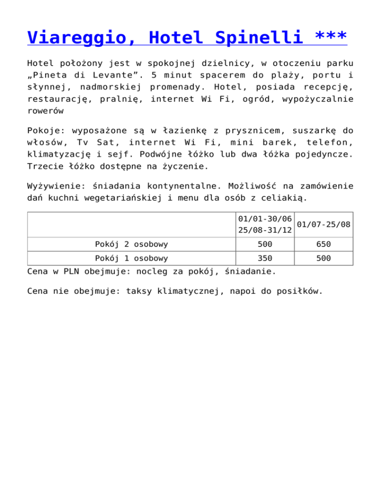 Viareggio, Hotel Spinelli *** Hotel położony jest w spokojnej dzielnicy, w otoczeniu parku „Pineta di Levante”. 5 minut spacerem do plaży, portu i słynnej, nadmorskiej promenady. Hotel, posiada recepcję, restaurację, pralnię, internet Wi Fi, ogród, wypożyczalnie rowerów Pokoje: wyposażone są w łazienkę z prysznicem, suszarkę do włosów, Tv Sat, internet Wi Fi, mini barek, telefon, klimatyzację i sejf. Podwójne łóżko lub dwa łóżka pojedyncze. Trzecie łóżko dostępne na życzenie. Wyżywienie: śniadania kontynentalne. Możliwość na zamówienie dań kuchni wegetariańskiej i menu dla osób z celiakią. 01/01-30/06 01/07-25/08 25/08-31/12 Pokój 2 osobowy 500 650 Pokój 1 osobowy 350 500 Cena w PLN obejmuje: nocleg za pokój, śniadanie. Cena nie obejmuje: taksy klimatycznej, napoi do posiłków.