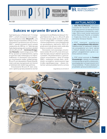 HELSIŃSKA FUNDACJA PRAW CZŁOWIEKA Nr 2 (2) luty 2007 Sukces w sprawie Bruce’a R. © Dorota Pudzianowska i Piotr Korzec Sąd Apelacyjny w Katowicach 14 lutego 2007 r. uchylił stosowanie tymczasowego aresztowania wobec Bruce’a R., o ile wpłaci kaucję w wysokości 100 tys. zł. Postanowienie uprawomocniło się 5 marca 2007 r., jednak wysokość kaucji została zwiększona do 300 tys. zł. Taka decyzja Sądu Apelacyjnego jest wynikiem działań obrońcy Bruce’a R. – mecenasa Grzegorza Słyszyka wspieranego przez PSP. W tej sprawie przedstawiliśmy opinię przyjaciela sądu wskazującą na nieprawidłowości w stosowaniu tymczasowego aresztowania wobec podejrzanego. Bruce R. jest obywatelem Nowej Zelandii, stąd w sprawę zaangażowali się również przedstawiciele władz tego państwa. Aresztowanie Bruce’a R. było związane z głośną sprawą zawalenia się hali wystawienniczej Międzynarodowych Targów Katowickich sp. z o.o. Bruce R. jako członek zarządu spółki został zatrzymany w 21 lutego 2006 r. w związku z podejrzeniem popełnienia czynu polegającego na sprowadzeniu zdarzenia, które zagraża życiu lub zdrowiu wielu osób albo mieniu w wielkich rozmiarach. Stosowanie tymczasowego aresztowania wobec Bruce’a R. przez okres ponad roku było naszym zdaniem sprzeczne z prawem. W postanowieniu o tymczasowym aresztowaniu z dnia 23 lutego 2006 r. wskazane zostały dwie przesłanki szczególne zastosowania tego środka zapobiegawczego – obawa matactwa i grożąca podejrzanemu surowa AKTUALNOŚCI » Adw. Marcin Melzacki z kancelarii Leśnodorski Ślusarek i Wspólnicy podjął się pomocy prawnej pro bono w przygotowaniu powództwa cywilnego, które może zostać wytoczone przez Katarzynę Twardo, w związku z tragiczną śmiercią jej męża – sierżanta Tomasza Twardo. » PSP nawiązał współpracę z adw. Przemysławem Wierzbickim. Zadeklarował on gotowość podjęcia się prowadzenia pro bono spraw z różnych dziedzin prawa, ze szczególnym uwzględnieniem spraw z zakresu wolności słowa. » PSP złożył wniosek do Fundacji Kronenberga o dotację na stworzenie innowacyjnego programu edukacyjnego polegającego na zorganizowaniu serii 16 warsztatów pt. „Prawo w działaniu na przykładzie spraw precedensowych”. ciąg dalszy na stronie 2 1 ciąg dalszy ze strony 1 2 kara. Jednak przedłużając stosowanie tymczasowego aresztowania sąd powoływał się już tylko na grożącą podejrzanemu surową karę. Rozstrzygnięcia sądów w zakresie stosowania i przedłużania stosowania tymczasowego aresztowania były niezgodne ze standardami wynikającymi z art. 5 § 3 Europejskiej Konwencji Praw Człowieka. Po pierwsze, nie istniały wystarczające przesłanki do stosowania tego środka wobec Bruce’a R. Europejski Trybunał Praw Człowieka (ETPCz) wielokrotnie stwierdzał, że sama powaga zarzutu nie może być wyłączną podstawą utrzymywania tymczasowego aresztowania, a zawsze z upływem czasu pierwotna podstawa stosowania tego środka staje się mniej istotna (por. wyroki w sprawach Olstowski przeciwko Polsce, nr 34052/96, §78, Drabek przeciwko Polsce, nr 5270/04, §47). Również uzasadnione podejrzenie popełnienia przestępstwa, będące ogólną przesłanką stosowania środków zapobiegawczych, nie może być uznawane za wyłączną przesłankę przedłużania stosowania tymczasowego aresztowania (por. wyroki w sprawach Tomasi przeciwko Francji, nr 241-A, §84, Czarnecki przeciwko Polsce, nr 75112/01, §39). Po drugie, w sprawie Bruce’a R. sądy nie rozważyły możliwości zastosowania innych, mniej surowych, środków zapobiegawczych, w szczególności poręczenia majątkowego oraz zakazu opuszczania kraju połączonego z zatrzymaniem paszportu. Pozostaje to w sprzeczności z orzecznictwem polskim (przykładem może być orzeczenie Trybunału Konstytucyjnego z dnia 24 lipca 2006 r., sygn. SK 58/03), jak i z orzecznictwem ETPCz (por. wyroki w sprawach Jabłoński przeciwko Polsce, nr 49929/99, §83, Górski przeciwko Polsce, nr 28904/02, §59). Uchylając stosowanie tymczasowego aresztowania wobec Bruce’a R. Sąd Apelacyjny stwierdził, że nie zostały spełnione przesłanki przedłużenia stosowania tego środka na okres ponad roku, o jakich mowa w art. 263§4 kpk. Zdaniem sądu sprawa ma charakter szczególnie zawiły, jednak prokurator wskazując na czynności, jakie należy jeszcze w sprawie przeprowadzić, nie wykazał związku między tymi czynnościami a sytuacją procesową podejrzanych (oprócz Bruce’a R. postanowienie dotyczyło dwóch innych osób). Działania podjęte w sprawie Bruce’a R. były przykładem zaangażowania Fundacji w sprawę, gdzie dochodziło do naruszeń praw podstawowych, ale która w społecznym odbiorze była trudna, a sam podejrzany stał się „zakładnikiem opinii publicznej”. Dorota Pudzianowska Sąd Najwyższy o przeludnieniu w więzieniach Sąd Najwyższy uznał, że przebywanie w przeludnionej celi może naruszać dobra osobiste i być podstawą roszczenia o zadośćuczynienie za doznaną krzywdę. Sprawa Adama D. była pierwszą sprawą o odszkodowanie za pobyt w przeludnionej celi rozpoznawaną przed Sąd Najwyższy (SN). 28 lutego 2007 r. SN uwzględnił kasację Adam D. w części dotyczącej odszkodowania za pobyt w przeludnionych celach i przekazał sprawę do ponownego rozpoznania. Problem przeludnienia dotyczy ogromnej liczby osób, a wyrok SN może wpłynąć na orzeczenia w wielu innych sprawach. Adam D. twierdził, że odbywał karę w nieludzkich warunkach, gdyż nie miał zagwarantowanej powierzchni 3 m2 na jednego osadzonego. W celach wieloosobowych, w których przebywał występowało stałe przeludnienie. Wystąpił z powództwem przeciwko Skarbowi Państwa – Okręgowemu Inspektoratowi Służby Więziennej we Wrocławiu o zapłatę na jego rzecz renty inwalidzkiej oraz zadośćuczynienie w wysokości 150 tys. zł z tytułu utraty zdrowia na skutek błędów i zaniechań lekarzy S
