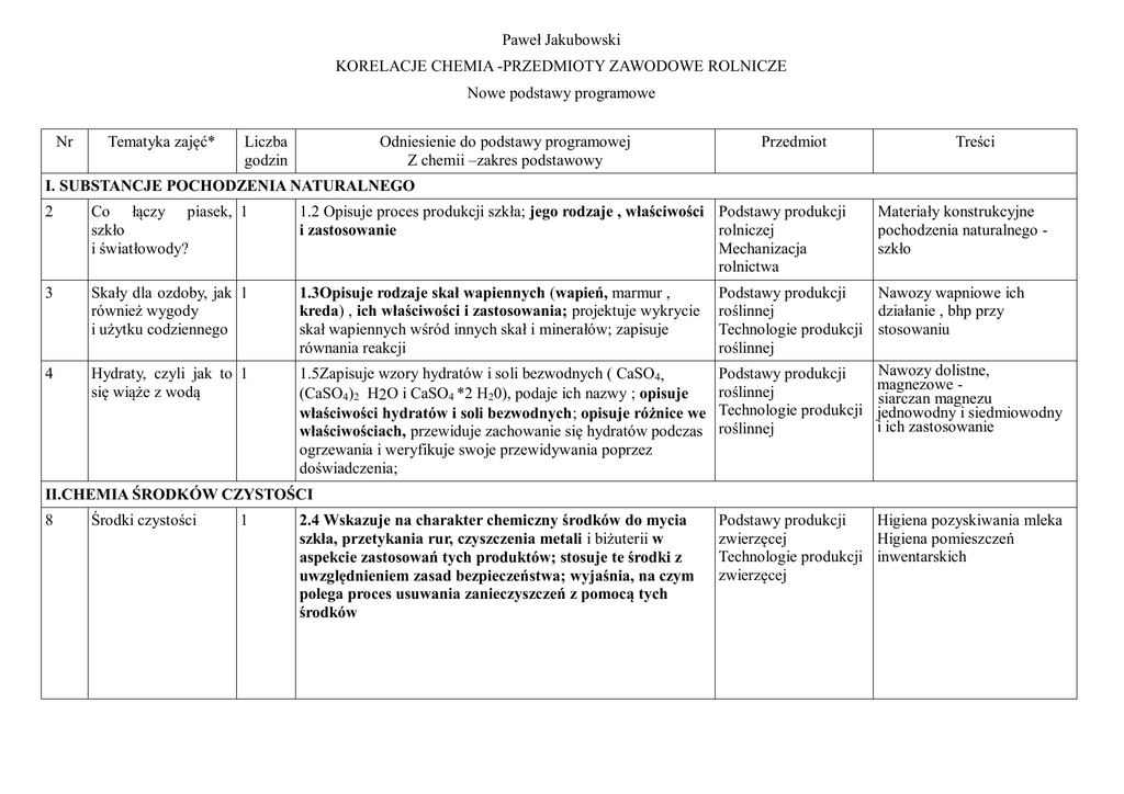 Paweł Jakubowski KORELACJE CHEMIA -PRZEDMIOTY ZAWODOWE ROLNICZE Nowe podstawy programowe Nr Tematyka zajęć* Liczba godzin Odniesienie do podstawy programowej Z chemii –zakres podstawowy Przedmiot Treści I. SUBSTANCJE POCHODZENIA NATURALNEGO 2 Co łączy piasek, 1 szkło i światłowody? 1.2 Opisuje proces produkcji szkła; jego rodzaje , właściwości Podstawy produkcji rolniczej i zastosowanie Mechanizacja rolnictwa 3 Skały dla ozdoby, jak 1 również wygody i użytku codziennego 1.3Opisuje rodzaje skał wapiennych (wapień, marmur , kreda) , ich właściwości i zastosowania; projektuje wykrycie skał wapiennych wśród innych skał i minerałów; zapisuje równania reakcji 4 Hydraty, czyli jak to 1 się wiąże z wodą Materiały konstrukcyjne pochodzenia naturalnego szkło Podstawy produkcji Nawozy wapniowe ich roślinnej działanie , bhp przy Technologie produkcji stosowaniu roślinnej Nawozy dolistne, 1.5Zapisuje wzory hydratów i soli bezwodnych ( CaSO4, Podstawy produkcji magnezowe roślinnej (CaSO4)2 H2O i CaSO4 *2 H20), podaje ich nazwy ; opisuje siarczan magnezu właściwości hydratów i soli bezwodnych; opisuje różnice we Technologie produkcji jednowodny i siedmiowodny i ich zastosowanie właściwościach, przewiduje zachowanie się hydratów podczas roślinnej ogrzewania i weryfikuje swoje przewidywania poprzez doświadczenia; II.CHEMIA ŚRODKÓW CZYSTOŚCI 8 Środki czystości 1 2.4 Wskazuje na charakter chemiczny środków do mycia szkła, przetykania rur, czyszczenia metali i biżuterii w aspekcie zastosowań tych produktów; stosuje te środki z uwzględnieniem zasad bezpieczeństwa; wyjaśnia, na czym polega proces usuwania zanieczyszczeń z pomocą tych środków Podstawy produkcji Higiena pozyskiwania mleka zwierzęcej Higiena pomieszczeń Technologie produkcji inwentarskich zwierzęcej Nr Tematyka zajęć* Liczba godzin Odniesienie do podstawy programowej Z chemii –zakres podstawowy III CHEMIA A ZDROWIE CZŁOWIEKA Przedmiot Treści (CHEMIA WSPOMAGA NASZE ZDROWIE, CHEMIA W KUCHNI) 11 Dawkowanie i postaci leków 1 3.1 Tłumaczy, na czym mogą polegać i od czego zależeć lecznicze i toksyczne właściwości substancji chemicznych (dawka, rozpuszczalność w wodzie, rozdrobnienie, sposób przenikania do organizmu) aspiryny, 3.2 Wyszukuje informacje na temat działania popularnych leków (np. Węgla aktywowanego, aspiryny, środków neutralizujących nadmiar kwasów w żołądku) Podstawy produkcji Choroby zwierząt pielęgnacja zwierzęcej zwierząt Technologie produkcji Profilaktyka weterynaryjna zwierzęcej 12 Wybrane substancje chemiczne i ich działanie 1 3.1 Tłumaczy, na czym mogą polegać i od czego zależeć lecznicze i toksyczne właściwości substancji chemicznych (dawka, rozpuszczalność w wodzie, rozdrobnienie, sposób przenikania do organizmu) aspiryny, nikotyny, alkoholu etylowego Podstawy produkcji Zapobieganie chorobom zwierzęcej zwierząt i leczenie Technologie produkcji zwierzęcej 13 Woda jest źródłem życia 1 3.3 Wyszukuje informacje na temat składników napojów dnia codziennego (kawa, herbata, mleko, woda mineralna, napoje typu cola) w aspekcie ich działania na organizm ludzki Podstawy produkcji zwierzęcej Technologie produkcji zwierzęcej 14 Jak powstają wina, pieczywo i produkty mleczne 1 3.4 Opisuje procesy fermentacyjne zachodzące podczas wyrabiania ciasta i pieczenia chleba, produkcji wina, otrzymywania kwaśnego mleka , jogurtów, serów, ; zapisuje równania reakcji fermentacji alkoholowej i octowej Podstawy produkcji Konserwacja paszy – zwierzęcej zakiszanie pasz Technologie produkcji zwierzęcej 15 Dodatki do żywności 1 3.5 Wyjaśnia przyczyny psucia się żywności proponuje sposoby zapobiegania temu procesowi; przedstawia znaczenie i konsekwencje stosowania dodatków do żywności; w tym konserwantów Podstawy produkcji Konserwacja pasz, dodatki zwierzęcej paszowe Technologie produkcji Przechowywanie mleka pasz zwierzęcej Znaczenie wody dla zwierząt Mleko i preparaty mlekozastępcze w żywieniu zwierząt Nr Tematyka zajęć* Liczba godzin Odniesienie do podstawy programowej Z chemii –zakres podstawowy Przedmiot Treści IV CHEMIA GLEBY 16 Właściwości gleby 1 4,1 Tłumaczy na czym polegają sorpcyjne właściwości gleby ; opisuje wpływ pH gleby na wzrost wybranych roślin planuje i przeprowadza badanie kwasowości gleby oraz badanie właściwości sorpcyjnych gleby Podstawy produkcji Gleboznawstwo, właściwości roślinnej gleb Technologie produkcji roślinnej 17 Nawozy – konieczność, czy zbytek? 1 4.2 Podaje przykłady nawozów naturalnych i sztucznych, uzasadnia potrzebę ich stosowania Podstawy produkcji Nawożenie roślinnej Klasyfikacja nawozów Technologie produkcji i ocenia ich wpływu na glebę roślinnej i roślinę 18 Zanieczyszczenie gleb i ich ochrona 1 4.3 Wymienia źródła chemicznego zanieczyszczenia gleb oraz rodzaje zanieczyszczeń (metale ciężkie , węglowodory, pestycydy, azotany) 4.4 Proponuje sposoby ochrony gleb przed degradacją Podstawy produkcji Gleboznawstwo, nawożenie roślinnej nawozy jako źródło azotanów, Technologie produkcji pestycydy roślinnej V PALIWA -OBECNIE I W PRZYSZŁOŚCI 21 Co i jak można uzyskać z ropy naftowej? 1 5.2 Wyjaśnia pojęcie liczby oktanowej (LO) i podaje Podstawy produkcji Źródła energii sposoby zwiększania LO benzyny; tłumaczy na czym polega rolniczej mechanizacja kraking oraz reforming i uzasadnia konieczność prowadzenia rolnictwa tych procesów w przemyśle 22 Inne niż ropa źródła energii 1 5.4 Proponuje alternatywne źródła energii- analizuje możliwości ich zastosowań (biopaliwa, wodór, energia słoneczna, wodna, jądrowa, geotermalna itd)) Podstawy produkcji Źródła energii rolniczej mechanizacja rolnictwa Nr Tematyka zajęć* Liczba godzin Odniesienie do podstawy programowej Z chemii –zakres podstawowy Przedmiot Treści VI CHEMIA OPAKOWAŃ I ODZIEŻY 24 Papier, szkło i metal jako opakowania 1 6.1 Podaje