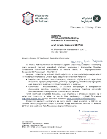 WYdZiał~ Wojskowa Akademia Techniczna Logistyki W Warszawa, dn. 22 lutego 2016 r. DZIEKAN WYDZIAŁU ZARZĄDZANIA Politechniki Rzeszowskiej prof. dr hab. Grzegorz OSTASZ ul. Powstańców Warszawy 8, bud. L, 35-595 Rzeszów Dotyczy: Kongres Kół Naukowych Studentów i Dok/oran/ów )!tQ!'<'.OLI ~ ~O-.-N.:.~ VrĄl/.,',()~ W imieniu Kól Naukowych na Wydziale Logistyki Wojskowej 'A:kademii Technicznej, mam zaszczyt zaprosić wszystkich chętnych studentów i doktorantów Wydziału Zarządzania Politechniki Rzeszowskiej do wzięcia udziału w I Międzynarodowym Kongresie Kół Naukowych - WAT 2016. Kongres, odbędzie się w dniach 11-12 maja 2016 r. w Kampusie Wojskowej Akademii Technicznej w Warszawie. Obrady będą odbywać się w dwóch Panelach: • Logistycznym , którego zakres tematyczny obejmuje między innymi zagadnienia związane z logistyką zaopatrzenia, produkcji i dystrybucji, infrastrukturą logistyczną oraz systemami logistycznymi i informatycznymi w logistyce, • Obronności I Bezpieczeństwa, w zakresie zawiązanym z zarządzaniem obronnością państwa , systemem militarnym państwa , logistyką obronności i bezpieczeństwa oraz systemem pozamilitarnym państwa. Pełne informacje dotyczące kongresu, jego organizacji i przebiegu zawarte są w załączonej broszurze, a także na stronie Kola Naukowego Logistyki Stosowanej http://kns .ilog .wat.edu .pll oraz na stronie Fa cebook www.facebook .com/knslogistyka . Oficjalnymi językami seminarium są język polski i język angielski , w których wg uznania należy przygotować artykuł i przesiać drogą elektroniczną do dnia 11 kwietnia 2016 on-line na stronie Koła Naukowego Logistyki Stosowanej. Do wiadomości: Wykonano w 1 egzemplarzu - adresat Wykonała: - Magdalena Kijek !ił tel. 500443129. e-mail: magdałena . [email protected] . pl I 110"1 en " II , WOJskowa Akademia Techniczna im J a rosła wa Dą browski ego, ul. gen Sylwestra Ka hskiego 2. 00-908 Warszawa NIP: 527-020-63 -00, REGON 012122900, WWW,wat.edu pl 1/1 Serdecznie zapraszamy przedstawicieli studenckich kół nau kowych do udzialu w: I MIĘDZYNARODOWYM KONGRESIE KÓŁ NAUKOWYCH WAT 2016 który odbęd zie si ę wd nioch 11-12.05.2016r. w Wojskowej Akademii Technicznej "w zielonym Campusie Bemowo" Jeże li j esteś mlodym naukowcem. studentem . do ktorantem i mosz dorobek wart pokozan ia innym to przyj edż no I Międzynarodowy Kon gres WAT. Jeżel i chcesz w ciekawej i niezwyklej atmosferze spędz ić ki lko dni i spotkać si ę ze studentami z innych uczelni. to Jest to doskonał o szanso. oby pozn ać ich. Pastoromy s ię. żeby no na szym kongresie nikt Się nie nudził. ba chcemy ż eby w jego rom ach adbyla się kilk o specjalnych wydarzel;. Będ z i e okazja do podyskutowania z przedstawicielami firm w romach warsz tatów. nie zabraknie oczywiśc i e wyci eczki i sza lonej gri ll- porty. O ca ly kon gres zo kalkzy się ur o czys ta śc iq wręcze ni a nagród dla autorów najlepszych proc. TEMATYKA Kongres adbywoć się będzie w dwóch głównych panelach: Logistyko i Obronność. Spotkan ia w roma ch Panelu Logistyki dotyczyć będq m.in : • log ist yka produkcji. • logistyko zaopa trzenia, • logistyko dyst rybucji. • infrastru ktura log istyczno , • systemy logi stycz ne, • systemy informatyczne w logistyce, • za rządza nie ł a ńcuchem dostaw. Zakres tematyczny Panelu Obro nn ości obejmuje m. in: • zarzqdzanie obronn ośc i ą państwo: • system militarny pań s twa ; • logistyko obronnośc i i bezpieczeństwo; • systemu pozami litorny pań stwa. Ofi cjalnymi Językami seminarium są j ęzyk polski i ję zyk angi elski. w których dowolnie należy przyg otowa ć art ykuł i preze ntację. Po peł n e informocje zapraszamy no stro n ę (z akł adk a Kongres). do tycz ące sem inarium www.kns.iloq.wat.edu.pl Wszelkie bi eż ące informa cje. Dotyczące naszeg o kongresu. zna jdziecie Pa l;stwo tak że na stroni e Facebaok www.facebook.com/knslogistyka. ZGŁO SZ E N I E UCZESTNI CTWA Peł ny proces rejestracji jest realizowany na st roni e seminarium www.kns.wat.edll .pl (za kładka Kon gres), poprzez wypełnienie formularza. Wszelkie pytania i wątpliwości prosimy zg ła szać pod adresy umieszczone na www.kns.ilog.wat.edu.pl (zakładko Kongres) lub no stronie Facebook wwwJocebook.com/knslogistyka. KALENDARZ SEMINARIUM 08 Kwieciel) 2016 11 Kwiecie ń 2016 6 Moj 20 16 11 Moj 20 16 11· 12 MOJ2016 Termin zgłoszeń Termin przesy ł an i a st reszczeń i pe ł nyeh refera tów Publikacjo prog ramu seminarium . Ostateczny termin opl ot Przyjazd i zakwaterowanie uczestni ków seminarium Obrady Seminarium ~.Wlo.wot"'".PII ADRES ORGANIZATORA WOJSKOWA AKADEM IA TECHNI CZNA Wydzial Logistyki dr inż. Artur KRÓL ul. Gen. Syl w estra Ka liski ego 2 00-908 Warszawo 49 t el. +48 26 1 839 410 fax: +48 26 1 837 382 e-mai l: artu [email protected] INFORMACJE DODATKOWE Pelny tekst referatu obeJmujqcy maksymalnie 8 stron n a l eż y przyg ot ować wed lug wzoru (do pobran ia ze strony www.kns.ilog.wat.edu.ol. zokladka Kongres) , w edytorze Word Offi ce i prze słać on -line no stronie www.kns.ilag.wot.edu.pi. KOSZT UCZESTNICTWA 100 zł/os . -- udz iał jednego uczestnika, obejm uj ący koszty wyżywi enia, udzialu we wszystkich wydarzeniach seminari um (obrody, warsztaty, grill porty. wycieczko), wydania materialów seminaryjnych. bez kosztów zakwaterowania. Koszty zakwaterowania na l eży op ło c i ć we wlasnym zak resie. Uczes tni cy moj ą wstępn ie zarezerwowa ne pokoje w Centrum Szkolenlowo-Konferencyjnym WAT ul. Gen. Sylwest ra Ka li skiego 9, 00-908 Warszawo. 92 5, e-ma il: tel. I foks: 261837 [email protected]. Kwotę za uczestnictwo należ y wp ł acić no konto WOJSKOWA AKADEM IA TEC HNI CZNA C ITIBANK OIWARSZAWA N ume r r ach u nku 60 1030 1016000000000873 0005 Wojskowa -Akademia Techniczna z dopi sk iem " KONGRES WAT 2016 Subk o nto 7 00 - 1 5 00 -5 0004" p od a n i em u cze lni , n a zw i s k i imion u cze s tników -----
