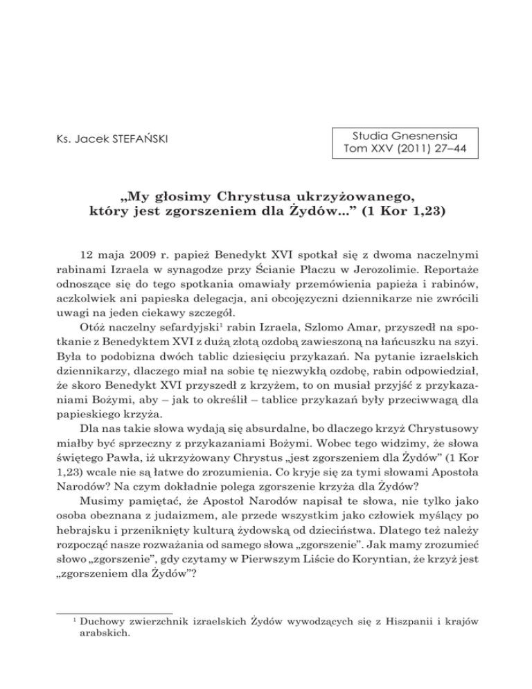 „My głosimy Chrystusa ukrzyżowanego, który jest zgorszeniem dla Żydów...” 43