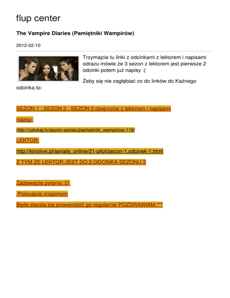 flup center The Vampire Diaries (Pamiętniki Wampirów) 2012-02-10 Trzymajcie tu linki z odcinkami z lektorem i napisami odrazu mówie że 3 sezon z lektorem jest pierwsze 2 odcinki potem już napisy :( Żeby się nie zagłębiać co do linków do Każnego odcinka to: SEZON 1 , SEZON 2 , SEZON 3 obejrzycie z lektorem i napisami napisy: http://zalukaj.tv/sezon-serialu/pamietniki_wampirow,119/ LEKTOR: http://kinolive.pl/seriale_online/21-pilot/sezon-1,odcinek-1.html Z TYM ŻE LEKTOR JEST DO 2 ODCINKA SEZONU 3 Zadawajcie pytania :D Polecajcie znajomym Będe starala się prowanidzić go regularnie POZDRAWIAM:***