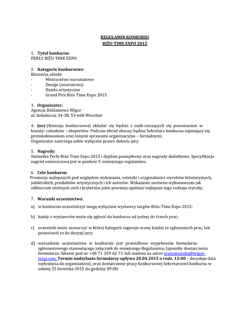REGULAMIN KONKURSU BIŻU-TIME EXPO 2015 1. Tytuł konkursu: PERŁY BIŻU-TIME EXPO 2. Kategorie konkursowe: Biżuteria, obiekt Mistrzostwo warsztatowe Design (wzornicwo) Dzieło artystyczne Grand Prix Biżu Time Expo 2015 3. Organizator: Agencja Reklamowa Wigor ul. Sokolnicza 34-38, 53-660 Wrocław 4. Jury (Komisja konkursowa) składać się będzie z osób cieszących się poważaniem w branży: członków – ekspertów. Podczas obrad obecny będzie Sekretarz konkursu zajmujący się protokołowaniem oraz innymi sprawami organizacyjno – formalnymi. Organizator zastrzega sobie wyłączne prawo doboru jury. 5. Nagrody: Statuetka Perły Biżu Time Expo 2015 i dyplom pamiątkowy oraz nagrody dodatkowe. Specyfikacja nagród umieszczona jest w punkcie 9. niniejszego regulaminu. 6. Cele konkursu: Promocja najlepszych pod względem wykonania, estetyki i oryginalności wyrobów biżuteryjnych, jubilerskich, produktów artystycznych i ich autorów. Wskazanie zarówno wykonawcom jak odbiorcom istotnych cech i kryteriów jakie powinny spełniać najlepsze tego rodzaju wyroby. 7. Warunki uczestnictwa: a) w konkursie uczestniczyć mogą wyłącznie wystawcy targów Biżu-Time Expo 2015; b) każdy z wystawców może się zgłosić do konkursu od jednej do trzech prac; c) uczestnik może zaznaczyć w której kategorii sugeruje ocenę każdej ze zgłoszonych prac, lub pozostawić to do decyzji jury; d) warunkiem uczestnictwa w konkursie jest prawidłowe wypełnienie formularza zgłoszeniowego stanowiącego załącznik do niniejszego Regulaminu, (sposoby dostarczenia formularza: faksem pod nr +48 71 359 62 71 lub mailem na adres [email protected]. Termin nadsyłania formularzy upływa 20.04.2015 o rodz. 12:00 – decyduje data wpłynięcia do organizatora). oraz dostarczenie pracy konkursowej Sekretarzowi konkursu w sobotę 25 kwietnia 2015 do godziny 09:00; e) formularze konkursowe zgłoszone po w/w terminie nie będą brane pod uwagę; f) zgłoszenia zostaną przekazane członkom jury; g) uczestnicy konkursu są zobowiązani do ekspozycji zgłoszonego produktu podczas targów oraz udostępnienia go na czas obrad jury, oraz udzielenia jurorom wszelkich potrzebnych do oceny informacji takich jak opis wyrobu, w tym rodzaj i próby metali szlachetnych, rodzaj kamieni, inne materiały, wymiary i masa wyrobu oraz wszystkie inne cechy charakterystyczne; h ) nagroda przyznawana jest producentowi lub dystrybutorowi danego produktu, który występuje w imieniu producenta; i) w przypadku uczestnictwa w targach producenta produktu, który ma być zgłoszony do konkursu, dystrybutor nie może zgłosić w/w produktu do konkursu; j) uczestnictwo w konkursie jest bezpłatne. 8. Kryteria oceny: W kategoriach: Mistrzostwo warsztatowe – perfekcja wykonania, umiejętność i celowość użycia materiałów, technik i technologii Design (wzornictwo) – oryginalność, nowatorstwo i estetyka projektu, oraz jego związek z aktualnymi trendami we wzornictwie i modzie. Możliwość powielania wzoru (dopuszcza się wskazanie sugerowanych technologii i materiałów) Dzieło artystyczne – idea, estetyka, oryginalność, związek z aktualnymi prądami i kierunkami w sztuce, przekaz Grand Prix – nagroda przyznana pracy wyróżniającej się w sposób szczególny w rozumieniu kryteriów jednej lub więcej powyższych kategorii. 9. Jury przeprowadza ocenę zgłoszonych prac i dokonuje ostatecznego wyboru zgodnie z niniejszym regulaminem, przyznając odpowiednio nagrody: - Grand Prix Perła Biżu-Time Expo - statuetka i dyplom, kupon na bezpłatne stoisko targowe podczas Biżu Time Expo 2016. Wytyczne stoiska: powierzchnia nieumeblowana, niezabudowana , wielkości 4m2 oraz roczna prenumerata magazynu Zegarki&Biżuteria. - Perła Biżu-Time Expo w kategorii Mistrzostwo warsztatowe - statuetka i dyplom, kupon na bezpłatne stoisko targowe podczas Biżu Time Expo 2016. Wytyczne stoiska: powierzchnia nieumeblowana, niezabudowana , wielkości 4m2 . - Perła Biżu-Time Expo w kategorii Design (wzornictwo)- statuetka i dyplom, kupon na bezpłatne stoisko targowe podczas Biżu Time Expo 2016. Wytyczne stoiska: powierzchnia nieumeblowana, niezabudowana , wielkości 4m2. - Perła Biżu-Time Expo w kategorii Dzieło artystyczne - statuetka i dyplom, kupon na bezpłatne stoisko targowe podczas Biżu Time Expo 2016. Wytyczne stoiska: powierzchnia nieumeblowana, niezabudowana , wielkości 4m2. 9.1 Jury może dokonać innego podziału nagród – to znaczy nie przyznać nagrody w którejś z kategorii lub przyznać dwie nagrody w tej samej kategorii, w taki jednak sposób, że łączna pula nagród nie zostanie przekroczona. 9.2 Jury ma prawo nie przyznania nagród. 9.3 Decyzja Jury jest ostateczna i nie podlega weryfikacji. Żadne odwołania od decyzji Jury nie będą uwzględniane. 10. Obradami jury kieruje przewodniczący. O ostatecznej ocenie decyduje większość głosów lub – przy równej ilości głosów – głos Przewodniczącego Komisji. 11. Sekretarz Konkursu sporządza Protokół z obrad, oraz spisuje opracowany przez jurorów Werdykt. Werdykt podany zostanie do publicznej wiadomości podczas ceremonii wręczenia nagród. 12. Ogłoszenie wyników oraz wręczenie nagród odbędzie się na scenie głównej w czasie trwania targów, w dniu 25.04.2015. Organizator poinformuje uczestników konkursu o miejscu i dokładnym czasie wręczenia nagród. 13. Lista przyznanych nagród wraz z Werdyktem Jury konkursu umieszczona zostanie do wglądu na stronie targowej Biżu-Time Expo. 14. Wystawcy, których produkty zostały nagrodzone, mają prawo do używania nazwy i wizerunku otrzymanej nagrody w celach reklamowych. 15. Organizator zastrzega sobie prawo do nieodpłatnej publikacji zdjęć nagrodzonych produktów.