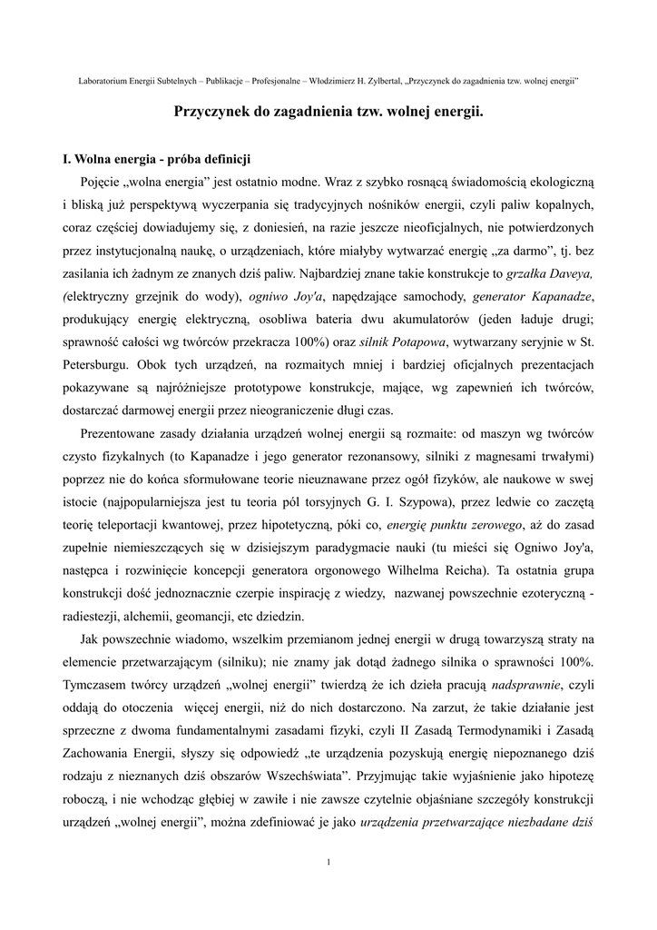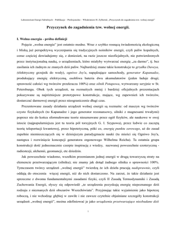 Laboratorium Energii Subtelnych – Publikacje – Profesjonalne – Włodzimierz H. Zylbertal, „Przyczynek do zagadnienia tzw. wolnej energii” Przyczynek do zagadnienia tzw. wolnej energii. I. Wolna energia - próba definicji Pojęcie „wolna energia” jest ostatnio modne. Wraz z szybko rosnącą świadomością ekologiczną i bliską już perspektywą wyczerpania się tradycyjnych nośników energii, czyli paliw kopalnych, coraz częściej dowiadujemy się, z doniesień, na razie jeszcze nieoficjalnych, nie potwierdzonych przez instytucjonalną naukę, o urządzeniach, które miałyby wytwarzać energię „za darmo”, tj. bez zasilania ich żadnym ze znanych dziś paliw. Najbardziej znane takie konstrukcje to grzałka Daveya, (elektryczny grzejnik do wody), ogniwo Joy'a, napędzające samochody, generator Kapanadze, produkujący energię elektryczną, osobliwa bateria dwu akumulatorów (jeden ładuje drugi; sprawność całości wg twórców przekracza 100%) oraz silnik Potapowa, wytwarzany seryjnie w St. Petersburgu. Obok tych urządzeń, na rozmaitych mniej i bardziej oficjalnych prezentacjach pokazywane są najróżniejsze prototypowe konstrukcje, mające, wg zapewnień ich twórców, dostarczać darmowej energii przez nieograniczenie długi czas. Prezentowane zasady działania urządzeń wolnej energii są rozmaite: od maszyn wg twórców czysto fizykalnych (to Kapanadze i jego generator rezonansowy, silniki z magnesami trwałymi) poprzez nie do końca sformułowane teorie nieuznawane przez ogół fizyków, ale naukowe w swej istocie (najpopularniejsza jest tu teoria pól torsyjnych G. I. Szypowa), przez ledwie co zaczętą teorię teleportacji kwantowej, przez hipotetyczną, póki co, energię punktu zerowego, aż do zasad zupełnie niemieszczących się w dzisiejszym paradygmacie nauki (tu mieści się Ogniwo Joy'a, następca i rozwinięcie koncepcji generatora orgonowego Wilhelma Reicha). Ta ostatnia grupa konstrukcji dość jednoznacznie czerpie inspirację z wiedzy, nazwanej powszechnie ezoteryczną radiestezji, alchemii, geomancji, etc dziedzin. Jak powszechnie wiadomo, wszelkim przemianom jednej energii w drugą towarzyszą straty na elemencie przetwarzającym (silniku); nie znamy jak dotąd żadnego silnika o sprawności 100%. Tymczasem twórcy urządzeń „wolnej energii” twierdzą że ich dzieła pracują nadsprawnie, czyli oddają do otoczenia więcej energii, niż do nich dostarczono. Na zarzut, że takie działanie jest sprzeczne z dwoma fundamentalnymi zasadami fizyki, czyli II Zasadą Termodynamiki i Zasadą Zachowania Energii, słyszy się odpowiedź „te urządzenia pozyskują energię niepoznanego dziś rodzaju z nieznanych dziś obszarów Wszechświata”. Przyjmując takie wyjaśnienie jako hipotezę roboczą, i nie wchodząc głębiej w zawiłe i nie zawsze czytelnie objaśniane szczegóły konstrukcji urządzeń „wolnej energii”, można zdefiniować je jako urządzenia przetwarzające niezbadane dziś 1 Laboratorium Energii Subtelnych – Publikacje – Profesjonalne – Włodzimierz H. Zylbertal, „Przyczynek do zagadnienia tzw. wolnej energii” rodzaje energii w energie znane, oswojone i powszechnie używane przez naszą cywilizację. W takim rozumieniu byłyby one zatem niczym więcej, niż silnikami; dziś znane silniki też nic innego nie robią, tylko przetwarzają jedną postać energii na inną. Urządzenia wolnej energii nie są zatem w żaden sposób nadsprawne w rozumieniu fizycznym 1, mają tylko inne źródło zasilania i nieznaną (ale raczej na pewno mniejsza od 100%) sprawność przetwarzania owego zasilania w energie fizyczne. Ostatecznie zatem można zdefiniować roboczo wolną energię jako dziś niezbadane ale realnie istniejące we Wszechświecie zasoby energii możliwe do opanowana i wykorzystania metodami cywilizacji naukowo-technicznej. Tak też rozumieć będziemy to nasze tytułowe pojęcie w dalszej części tekstu. II. Możliwe dziś wytłumaczenia fenomenu wolnej energii Gdyby dokładniej zanalizować konstrukcje urządzeń wolnej energii to - mimo wielu różnic – da się wychwycić pewne ich podobieństwo: wszystkie one zawierają elementy, bądź procedury obsługi, które tworzą przejście między dobre opisaną rzeczywistością fizyczną a bliżej nieokreśloną inną rzeczywistością, przez dzisiejszą fizykę nie rozpoznaną; z tej „innej” rzeczywistości miałaby pochodzić wolna energia. Role takiego elementu może pełnić kilka zjawisk: rezonans mechaniczny lub elektryczny, który w określonych warunkach miałby wytwarzać energię zdecydowanie większą, niż dostarczona do wprawienia w rezonans. Z matematycznego opisu zjawiska rezonansu wynika, że w braku tłumienia, rezonans może mieć nieskończoną amplitudę; w praktyce, wskutek istnienia w układzie rezonującym oporów (mechanicznych lub elektrycznych) wartość tej amplitudy jest skończona, choć bywa znaczna2. Jednocześnie teorie opisujące zjawiska związane z wolną energią 3 postulują, że wszelkie stany nieustalone (takie, w których, opisie matematycznym pojawia się nieciągłość) sprzyjają przejściom między światem fizycznym a „innymi wymiarami”. Z uwagi na to, że w praktyce wystarczy pewne przybliżenie matematycznego ideału, żeby 1 2 3 Twierdzenie, że urządzenia wolnej energii są nadsprawne spotyka się czasem, wygłaszane z cała powagą, przez mniej wykształconych i bardziej mistycznie nastawionych twórców tych urządzeń. Jednak w świetle wiedzy wyraźniejszej, niż tylko intuicja tyleż genialnych co kiepsko wykształconych pionierów, są one nadsprawne z punktu widzenia układu zamkniętego w rozumieniu termodynamicznym. Tymczasem system zasilania energią naszej planety najpewniej nie jest termodynamicznie zamknięty, zatem takie opowieści o nadsprawności można by porównać do twierdzenia palacza parowozu, że ów parowóz jest nadsprawny, gdyż energia przenoszona na jego koła jest wiel
