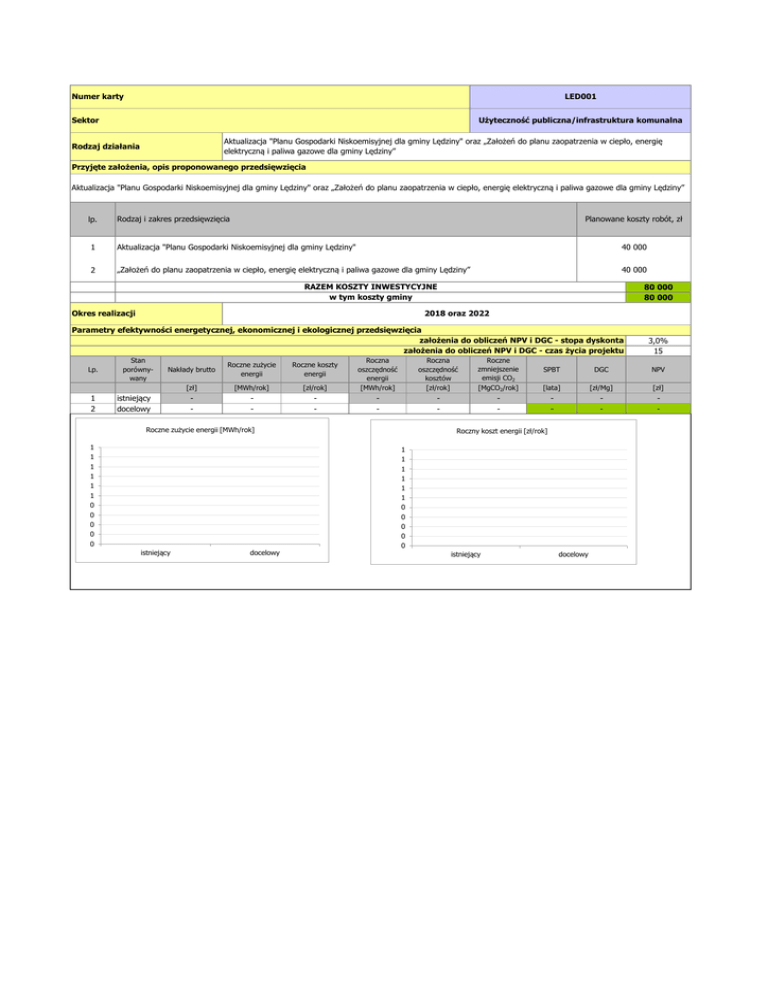 Numer karty LED001 Sektor Użyteczność publiczna/infrastruktura komunalna Aktualizacja "Planu Gospodarki Niskoemisyjnej dla gminy Lędziny" oraz „Założeń do planu zaopatrzenia w ciepło, energię elektryczną i paliwa gazowe dla gminy Lędziny” Rodzaj działania Przyjęte założenia, opis proponowanego przedsięwzięcia Aktualizacja "Planu Gospodarki Niskoemisyjnej dla gminy Lędziny" oraz „Założeń do planu zaopatrzenia w ciepło, energię elektryczną i paliwa gazowe dla gminy Lędziny” lp. Rodzaj i zakres przedsięwzięcia Planowane koszty robót, zł 1 Aktualizacja "Planu Gospodarki Niskoemisyjnej dla gminy Lędziny" 40 000 2 „Założeń do planu zaopatrzenia w ciepło, energię elektryczną i paliwa gazowe dla gminy Lędziny” 40 000 RAZEM KOSZTY INWESTYCYJNE w tym koszty gminy Okres realizacji 80 000 80 000 2018 oraz 2022 Parametry efektywności energetycznej, ekonomicznej i ekologicznej przedsięwzięcia założenia do obliczeń NPV i DGC - stopa dyskonta założenia do obliczeń NPV i DGC - czas życia projektu Lp. 1 2 Stan porównywany Roczna oszczędność kosztów [zł/rok] Roczne zmniejszenie emisji CO2 [MgCO2/rok] SPBT DGC NPV [zł/rok] Roczna oszczędność energii [MWh/rok] [lata] [zł/Mg] [zł] - - - - - - - Nakłady brutto Roczne zużycie energii Roczne koszty energii [zł] [MWh/rok] - - istniejący docelowy Roczne zużycie energii [MWh/rok] 1 1 1 1 1 1 0 0 0 0 0 istniejący docelowy 3,0% 15 Roczny koszt energii [zł/rok] 1 1 1 1 1 1 0 0 0 0 0 istniejący docelowy Numer karty LED002 Sektor Oświetlenie uliczne Rodzaj działania Modernizacja i budowa oświetlenia ulicznego gminy Lędziny Przyjęte założenia, opis proponowanego przedsięwzięcia Projekt polega na wykonaniu kompleksowej modernizacji zużytej i wyeksploatowanej infrastruktury oświetlenia drogowego (w której są zastosowane nieefektywne źródła światła) na nową z zastosowaniem źródeł światła w nowej technologii (np. LED). lp. 1 2 Rodzaj i zakres przedsięwzięcia Planowane koszty robót, zł Wymiana słupów oświetlenia ulicznego i opraw oświetleniowych na oświetlenie efektywne energetycznie na ul. Lędzińskiej, Oficerskiej i Pokoju Wymiana słupów oświetlenia ulicznego i opraw oświetleniowych na oświetlenie efektywne energetycznie na kluczowych ulicach gminy RAZEM KOSZTY INWESTYCYJNE w tym koszty gminy Okres realizacji 500 000 8 803 245 9 303 245 1 395 487 2015-2020 Parametry efektywności energetycznej, ekonomicznej i ekologicznej przedsięwzięcia założenia do obliczeń NPV i DGC - stopa dyskonta założenia do obliczeń NPV i DGC - czas życia projektu Lp. 1 2 Stan porównywany Nakłady brutto Roczne zużycie energii Roczne koszty energii [zł] [MWh/rok] [zł/rok] istniejący docelowy 9 303 245 1 546 928 1 004 900 602 940 Roczna oszczędność energii [MWh/rok] Roczna oszczędność kosztów [zł/rok] 618,4 Roczne zużycie energii [MWh/rok] Roczne zmniejszenie emisji CO2 [MgCO2/rok] SPBT DGC NPV [lata] [zł/Mg] [zł] - - 401 960,0 514,2 23,1 Roczny koszt energii [zł/rok] 1 800 1 200 000 1 600 1 400 1 000 000 1 200 800 000 1 000 800 600 000 600 400 000 400 200 000 200 0 istniejący docelowy 3,0% 15 0 istniejący docelowy 733,8 -4 504 673 Numer karty LED003 Sektor Użyteczność publiczna/infrastruktura komunalna Rodzaj działania Termomodernizacja budynków użyteczności publicznej należących do gminy Lędziny Przyjęte założenia, opis proponowanego przedsięwzięcia Przedmiotem projektu jest wykonanie kompleksowej termomodernizacji budynków użyteczności publicznej, będących własnością gminy. Zakres termomodernizacji będzie wynikał z przeprowadzonych audytów energetycznych (ocieplenie ścian, ocieplenie dachów, wymiana stolarki otworowej, modernizacja instalacji centralnego ogrzewania, modernizacja systemu ciepłej wody użytkowej, wykonanie instalacji kolektorów słonecznych, modernizacja źródeł ciepła, modernizacja oświetlenia wewnętrznego i zewnętrznego, modernizacja instalacji elektrycznej, zastosowanie odnawialnych źródeł energii, zastosowanie systemów monitoringu oraz zarządzania energią itp.). Na podstawie rozpatrywanego zakresu w przedsięwzięciach założono 40% oszczędności zużycia energii w analizowanej grupie budynków. Roczną oszczędność energii pomnożono przez wskaźnik emisji CO2 dla ciepła sieciowego. lp. Rodzaj i zakres przedsięwzięcia Planowane koszty robót, zł 1 Termomodernizacja budynku Urzędu Miasta Lędziny 3 058 824,00 2 Termomodernizacja pozostałych budynków użyteczności publicznej należących do gminy Lędziny RAZEM KOSZTY INWESTYCYJNE w tym koszty gminy 12 000 000,00 Okres realizacji 15 058 824 2 258 824 2015 -2020 Parametry efektywności energetycznej, ekonomicznej i ekologicznej przedsięwzięcia założenia do obliczeń NPV i DGC - stopa dyskonta założenia do obliczeń NPV i DGC - czas życia projektu Lp. 1 2 Stan porównywany Nakłady brutto Roczne zużycie energii Roczne koszty energii [zł] [MWh/rok] [zł/rok] istniejący docelowy 15 058 824 7 147 4 288 1 786 808 1 072 085 Roczna oszczędność energii [MWh/rok] 2 858,89 Roczne zużycie energii [MWh/rok] 8 000 6 000 5 000 4 000 3 000 2 000 1 000 0 istniejący docelowy 714 723,0 Roczne zmniejszenie emisji CO2 [MgCO2/rok] SPBT DGC NPV [lata] [zł/Mg] [zł] 1 326,53 21,1 Roczny koszt energii [zł/rok] 2 1 1 1 1 1 7 000 Roczna oszczędność kosztów [zł/rok] 000 800 600 400 200 000 800 600 400 200 000 000 000 000 000 000 000 000 000 000 0 istniejący 3,0% 15 docelowy 412,1 -6 526 507 Numer karty LED004 Sektor Użyteczność publiczna/infrastruktura komunalna Rodzaj działania Termomodernizacja pozostałych budynków użyteczności publicznej na terenie gminy Lędziny Przyjęte założenia, opis proponowanego przedsięwzięcia Przedmiotem projektu jest wykonanie kompleksowej termomodernizacji budynków użyteczności publicznej, będących własnością gminy. Zakres termomodernizacji będzie wynikał z przeprowadzonych audytów ene