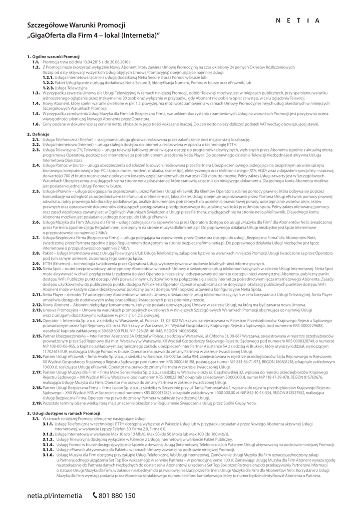Szczegółowe Warunki Promocji „GigaOferta dla Firm 4 – lokal (Internetia)” 1. Ogólne warunki Promocji 1.1. Promocja trwa od dnia 13.04.2015 r. do 30.06.2016 r. 1.2. Z Promocji może skorzystać wyłącznie Nowy Abonent, który zawiera Umowę Promocyjną na czas określony 24 pełnych Okresów Rozliczeniowych (licząc od daty aktywacji wszystkich Usług objętych Umową Promocyjną) obejmującą co najmniej Usługi: 1.2.1. Usługa Internetowa łącznie z usługą dodatkową Netia Secure 3 oraz Pomoc w biurze lub 1.2.2. Pakiet Usług łącznie z usługą dodatkową Netia Secure 3, Identyfikacja Numeru, Pomoc w biurze oraz ePrawnik, lub 1.2.3. Usługa Telewizyjna. 1.3. W przypadku zawarcia Umowy dla Usługi Telewizyjnej w ramach niniejszej Promocji, odbiór Telewizji możliwy jest w miejscach publicznych, przy spełnieniu warunku jednoczesnego oglądania przez maksymalnie 30 osób oraz wyłącznie w przypadku, gdy Abonent nie pobiera opłat za wstęp, w celu oglądania Telewizji. 1.4. Nowy Abonent, który spełni warunki określone w pkt 1.2. powyżej, ma możliwość zamówienia w ramach Umowy Promocyjnej innych usług określonych w niniejszych Szczegółowych Warunkach Promocji. 1.5. W przypadku zamówienia Usług Muzyka dla Firm lub Bezpieczna Firma, warunkiem skorzystania z zamówionych Usług na warunkach Promocji jest pozytywna ocena wiarygodności płatniczej Nowego Abonenta przez Operatora. 1.6. Ceny podane w dokumencie są cenami netto, chyba że w jego treści wskazano inaczej. Do cen netto należy doliczyć podatek VAT według obowiązującej stawki. 2. Definicje 2.1. Usługa Telefoniczna (Telefon) – stacjonarna usługa głosowa realizowana przez zakończenie sieci mające stałą lokalizację. 2.2. Usługa Internetowa (Internet) – usługa stałego dostępu do internetu, realizowana w oparciu o technologię ETTH. 2.3. Usługa Telewizyjna (TV, Telewizja) – usługa telewizji kablowej umożliwiająca dostęp do programów telewizyjnych, wybranych przez Abonenta zgodnie z aktualną ofertą programową Operatora, poprzez sieć internetową za pośrednictwem Urządzenia Netia Player. Do poprawnego działania Telewizji niezbędna jest aktywna Usługa Internetowa Operatora. 2.4. Usługa Pomoc w biurze – usługa ubezpieczenia od zdarzeń losowych, realizowana przez Partnera Ubezpieczeniowego, polegająca na bezpłatnym serwisie sprzętu biurowego, komputerowego (np. PC, laptop, router, modem, drukarka, skaner itp.), elektrycznego oraz elektronicznego (RTV, AGD) wraz z dojazdem specjalisty i naprawą do wartości 700 zł brutto rocznie oraz z pokryciem kosztów części zamiennych do wartości 700 zł brutto rocznie. Pełny zakres Usługi zawarty jest w Szczegółowych Warunkach Ubezpieczenia, znajdujących się na stronie netia.pl/assistance, które stanowią załącznik do niniejszego dokumentu. Dla jednego konta Abonenta możliwe jest posiadanie jednej Usługi Pomoc w biurze. 2.5. Usługa ePrawnik – usługa polegająca na organizowaniu przez Partnera Usługi ePrawnik dla Klientów Operatora zdalnej pomocy prawnej, która odbywa się poprzez komunikację na odległość za pośrednictwem telefonu lub on-line (e-mail, faks). Zakres Usługi obejmuje organizowanie przez Partnera Usługi ePrawnik pomocy prawnej adwokata, radcy prawnego lub doradcy podatkowego, analizę dokumentów potrzebnych do udzielenia prawidłowej porady, udostępnianie wzorów pism, aktów prawnych oraz opracowanie dokumentów dotyczących postępowania przedprocesowego do ustalonej wartości przedmiotu sporu. Pełny zakres oferowanej pomocy oraz zasad współpracy zawarty jest w Ogólnych Warunkach Świadczenia Usługi przez Partnera, znajdujących się na stronie netia.pl/ePrawnik. Dla jednego konta Abonenta możliwe jest posiadanie jednego dostępu do Usługi ePrawnik. 2.6. Usługa Muzyka dla Firm (Muzyka dla Firm) – usługa polegająca na zapewnieniu przez Operatora dostępu do usługi „Muzyka dla Firm” dla Abonentów Netii, świadczonej przez Partnera zgodnie z jego Regulaminem, dostępnym na stronie muzykadlafirm.netia.pl. Do poprawnego działania Usługi niezbędne jest łącze internetowe o przepustowości co najmniej 2 Mb/s. 2.7. Usługa Bezpieczna Firma (Bezpieczna Firma) – usługa polegająca na zapewnieniu przez Operatora dostępu do usługi „Bezpieczna Firma” dla Abonentów Netii, świadczonej przez Partnera zgodnie z jego Regulaminem dostępnym na stronie bezpiecznafirma.netia.pl. Do poprawnego działania Usługi niezbędne jest łącze internetowe o przepustowości co najmniej 2 Mb/s. 2.8. Pakiet – Usługa Internetowa wraz z Usługą Telewizyjną i/lub Usługą Telefoniczną, zakupione łącznie na warunkach niniejszej Promocji. Usługi świadczone są przez Operatora pod tym samym adresem, za pomocą tego samego łącza. 2.9. ETTH (Ethernet) – technologia świadczenia przez Operatora Usług, wykorzystywana w budowie lokalnych sieci informatycznych. 2.10. Netia Spot – router bezprzewodowy udostępniony Abonentowi w ramach Umowy o świadczenie usług telekomunikacyjnych w zakresie Usługi Internetowej. Netia Spot może aktywować w chwili przyłączenia Urządzenia do sieci Operatora, niezależny i odseparowany od punktu dostępu i sieci wewnętrznej Abonenta, publiczny punkt dostępu WiFi. Publiczny punkt dostępu WiFi pozwala innym użytkownikom na połączenie się z siecią internet za pośrednictwem łącza internetowego Abonenta. Zasady dostępu użytkowników do publicznego punktu dostępu WiFi określa Operator. Operator upublicznia dane dotyczące lokalizacji publicznych punktów dostępu WiFi. Abonent może w każdym czasie dezaktywować publiczny punkt dostępu WiFi poprzez ustawienia konfiguracyjne Netia Spota. 2.11. Netia Player – dekoder TV udostępniony Abonentowi w ramach Umowy o świadczenie usług telekomunikacyjnych w celu korzystania z Usługi Telewizyjnej. Netia Player umożliwia dostęp do dodatkowych usług oraz aplikacji świadczonych przez po