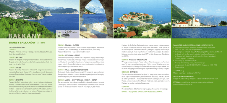 CENA OD SKARBY BAŁKANÓW | 11 DNI PROGRAM RAMOWY: DZIEŃ 1: Wyjazd z Polski o północy. Nocleg w okolicy Szegedu/Nowego Sadu (bez obiadokolacji). DZIEŃ 2: BELGRAD Przejazd do Belgradu. W programie zwiedzania stolicy Serbii: Nowy Belgrad, cerkiew św. Sawy, twierdza Kalemegdan, bastion Kula Nebojsa i cerkiew św. Petki. DZIEŃ 3: SKOPJE Przejazd do stolicy Macedonii – Skopje. W programie zwiedzania: meczet Isy Beja, łaźnie Kursumli An, stary bazar, rzymski akwedukt, twierdza Skopsko Kale, Kamienny Most na rzece Wardar, cerkiew św. Spasa. DZIEŃ 4: OCHRYD Przejazd do Ochrydu (miasta, które – wraz z jeziorem, do którego przylega – zostało wpisane na Światową Listę UNESCO). Spacer po Starym Mieście: antyczny teatr, cerkiew św. Pantalejmona, cerkiew św. Sofii – jeden z najważniejszych zabytków Macedonii, cerkiew św. Johana Kaneo z widokiem na jezioro. Następnie przejazd do kompleksu klasztornego św. Nauma, zwiedzanie. 2129 ZŁ/OS . DZIEŃ 5: TIRANA – DURRES Przejazd do stolicy Albanii – Tirany. Przejazd aleją Poległych Bohaterów, „Piramida”, plac Skandenberga, Muzeum Narodowe, czas wolny. Przejazd do Durres – wypoczynek nad morzem. DZIEŃ 6: APOLONIA – BERAT Zwiedzanie położonej w pobliżu Fier – Apollonii, niegdyś wspaniałego starożytnego miasta, dziś urokliwego miejsca z pozostałościami starożytnych budowli i bizantyjskim klasztorem. Następnie przejazd do „miasta tysiąca okien”, Beratu. Zwiedzanie starożytnej cytadeli z malowniczą zabudową starego miasta, czas wolny. DZIEŃ 7: KRUJA – JEZIORO SZKODERSKIE Zwiedzanie Kruji, „miasta Skandenberga”. W programie spacer uliczkami Starego Miasta, twierdza, Muzeum Skandenberga.Wyjazd do Czarnogóry, po drodze postój nad jeziorem Szkodersk. DZIEŃ 8: ULCINJ – SVATY STEFAN – BUDVA – KOTOR Od rana pobyt w Ulcinj, drugim po Budvie najpopularniejszym kurorcie Czarnogóry, mieście orientu o szczególnym multietnicznym klimacie. Spacer po mieście, zwiedzanie Starówki wysuniętej w głąb morza. Przejazd do Sv. Stefan. Zwiedzanie tego malowniczego miasta-skansenu na wyspie. Następnie Budva w programie: Starówka, a także spacer po murach miejskich. Zwiedzanie Kotoru, jednego z najlepiej zachowanych średniowiecznych miast w południowo-wschodniej Europie. Zwiedzanie historycznej części miasta wpisanej od 1979 na Listę Światowego Dziedzictwa UNESCO. DZIEŃ 9: MOSTAR – MEDJUGORIE W programie zwiedzania Mostaru: Stary Most zbudowany na Neretwie przez Turków, meczet Karadjozbega z 1564 r., meczet Tabacica, panorama miasta. Przejazd do Medjugorie. Zwiedzanie znanego na całym świecie Sanktuarium Maryjnego, a także wzgórza objawień. Nocleg w okolicy Sarajeva. DZIEŃ 10: SARAJEVO Od rana krótkie zwiedzanie Sarajeva. W programie: panorama miasta (duża część miasta położona jest na stromych zboczach), Meczet Cesarski (z 1566 r.) Bezistan – bazar, katolicka katedra Serca Jezusowego, Stare Miasto, cerkiew Archaniołów Michała i Gabriela, most „Zamachowców”. Przejazd na nocleg w okolice Budapesztu. DZIEŃ 11: Powrót do Polski. Zakończenie imprezy po północy dnia dwunastego. UWAGA – KOLEJNOŚĆ ZWIEDZANIA MOŻE ULEC ZMIANIE. ŚWIADCZENIA ZAWARTE W CENIE PODSTAWOWEJ: • Przejazd komfortowym autokarem wyposażonym w klimatyzację, barek, DVD, WC oraz pasy bezpieczeństwa. •10 noclegów w hotelach klasy 2*/3* (ok. Szeged/Novy Sad x1, ok. Nis x 1, ok. Skopje x 1, ok. Durres x 3, Ulcinj x 1, ok. Kotor/Budva x 1, ok. Sarajeva x 1, Budapeszt x 1). Pokoje 2- i 3-os. z łazienkami. Dopłata za pokój 1-osobowy. • Śniadania (10), obiadokolacje (9). W cenę obiadokolacji nie są wliczone napoje. • Ubezpieczenie KL do 15 000 EUR, NW i bagażu do 1000 PLN. • Opieka pilota. ZA DOPŁATĄ: Miejsce w pokoju 1-osobowym: 900 PLN. WYDATKI PROGRAMOWE: Wstępy + przewodnicy miejscowi + taksy klimatyczne około 115 €. UWAGA – wydatki programowe są opłacane indywidualnie przez uczestników wycieczki.