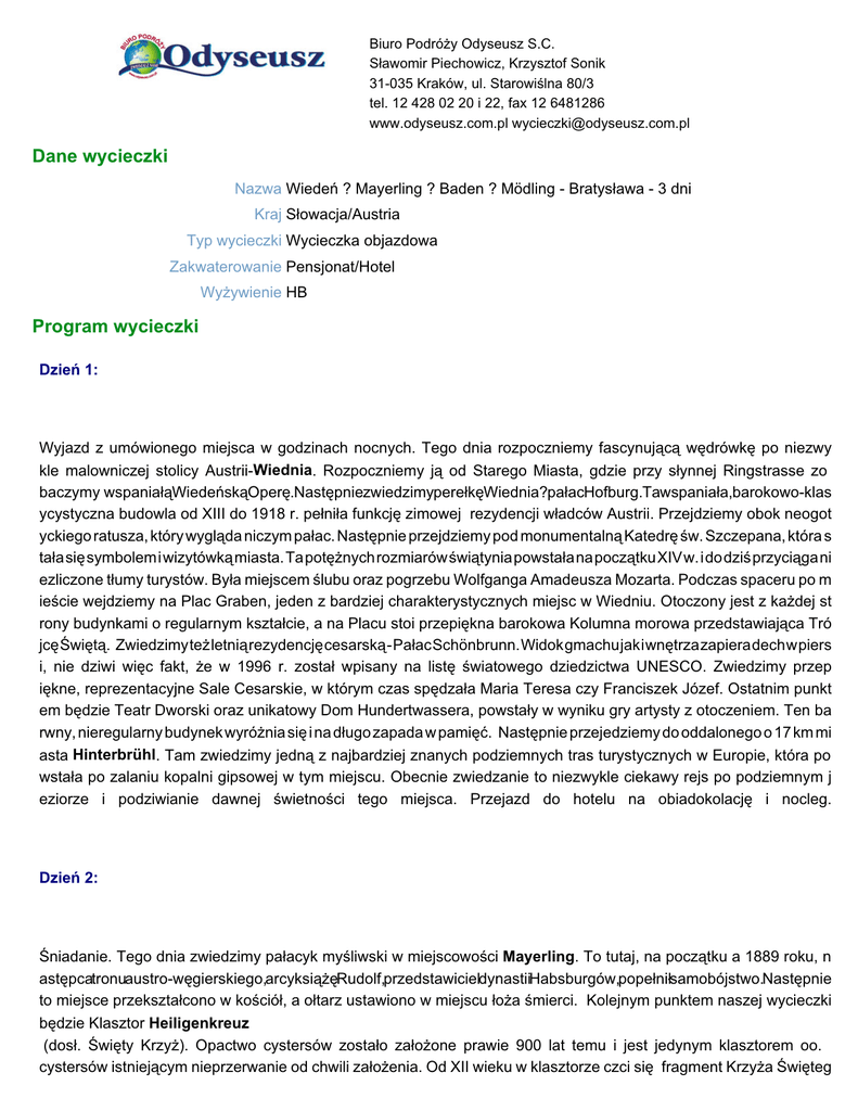 Dane wycieczki Program wycieczki - ODYSEUSZ