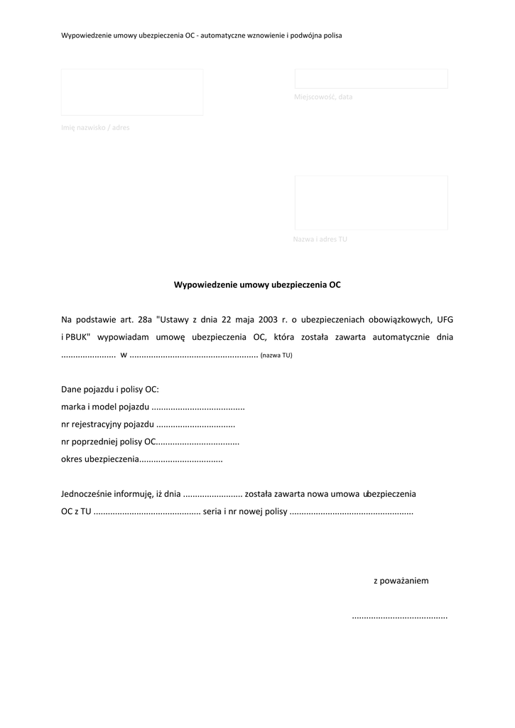 Wypowiedzenie umowy ubezpieczenia OC - automatyczne wznowienie i podwójna polisa Miejscowość, data Imię nazwisko / adres Nazwa i adres TU Wypowiedzenie umowy ubezpieczenia OC Na podstawie art. 28a "Ustawy z dnia 22 maja 2003 r. o ubezpieczeniach obowiązkowych, UFG i PBUK" wypowiadam umowę ubezpieczenia OC, która została zawarta automatycznie dnia ....................... w ...................................................... (nazwa TU) Dane pojazdu i polisy OC: marka i model pojazdu ....................................... nr rejestracyjny pojazdu ................................. nr poprzedniej polisy OC................................... okres ubezpieczenia................................... Jednocześnie informuję, iż dnia ......................... została zawarta nowa umowa ubezpieczenia OC z TU ............................................. seria i nr nowej polisy .................................................... z poważaniem ........................................