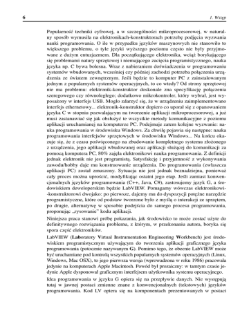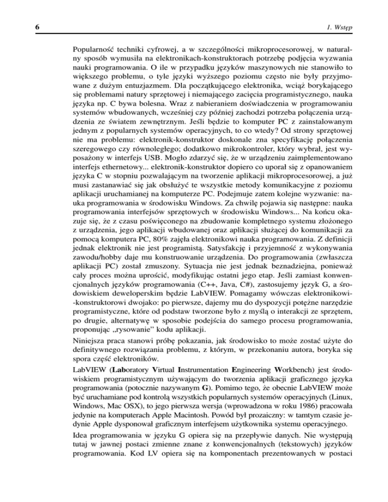 6 1. Wstęp Popularność techniki cyfrowej, a w szczególności mikroprocesorowej, w naturalny sposób wymusiła na elektronikach-konstruktorach potrzebę podjęcia wyzwania nauki programowania. O ile w przypadku języków maszynowych nie stanowiło to większego problemu, o tyle języki wyższego poziomu często nie były przyjmowane z dużym entuzjazmem. Dla początkującego elektronika, wciąż borykającego się problemami natury sprzętowej i niemającego zacięcia programistycznego, nauka języka np. C bywa bolesna. Wraz z nabieraniem doświadczenia w programowaniu systemów wbudowanych, wcześniej czy później zachodzi potrzeba połączenia urządzenia ze światem zewnętrznym. Jeśli będzie to komputer PC z zainstalowanym jednym z popularnych systemów operacyjnych, to co wtedy? Od strony sprzętowej nie ma problemu: elektronik-konstruktor doskonale zna specyfikację połączenia szeregowego czy równoległego; dodatkowo mikrokontroler, który wybrał, jest wyposażony w interfejs USB. Mogło zdarzyć się, że w urządzeniu zaimplementowano interfejs ethernetowy... elektronik-konstruktor dopiero co uporał się z opanowaniem języka C w stopniu pozwalającym na tworzenie aplikacji mikroprocesorowej, a już musi zastanawiać się jak obsłużyć te wszystkie metody komunikacyjne z poziomu aplikacji uruchamianej na komputerze PC. Podejmuje zatem kolejne wyzwanie: nauka programowania w środowisku Windows. Za chwilę pojawia się następne: nauka programowania interfejsów sprzętowych w środowisku Windows... Na końcu okazuje się, że z czasu poświęconego na zbudowanie kompletnego systemu złożonego z urządzenia, jego aplikacji wbudowanej oraz aplikacji służącej do komunikacji za pomocą komputera PC, 80% zajęła elektronikowi nauka programowania. Z definicji jednak elektronik nie jest programistą. Satysfakcję i przyjemność z wykonywania zawodu/hobby daje mu konstruowanie urządzenia. Do programowania (zwłaszcza aplikacji PC) został zmuszony. Sytuacja nie jest jednak beznadziejna, ponieważ cały proces można uprościć, modyfikując ostatni jego etap. Jeśli zamiast konwencjonalnych języków programowania (C++, Java, C#), zastosujemy język G, a środowiskiem deweloperskim będzie LabVIEW. Pomagamy wówczas elektronikowi-konstruktorowi dwojako: po pierwsze, dajemy mu do dyspozycji potężne narzędzie programistyczne, które od podstaw tworzone było z myślą o interakcji ze sprzętem, po drugie, alternatywę w sposobie podejścia do samego procesu programowania, proponując „rysowanie” kodu aplikacji. Niniejsza praca stanowi próbę pokazania, jak środowisko to może zostać użyte do definitywnego rozwiązania problemu, z którym, w przekonaniu autora, boryka się spora część elektroników. LabVIEW (Laboratory Virtual Instrumentation Engineering Workbench) jest środowiskiem programistycznym używającym do tworzenia aplikacji graficznego języka programowania (potocznie nazywanym G). Pomimo tego, że obecnie LabVIEW może być uruchamiane pod kontrolą wszystkich popularnych systemów operacyjnych (Linux, Windows, Mac OSX), to jego pierwsza wersja (wprowadzona w roku 1986) pracowała jedynie na komputerach Apple Macintosh. Powód był prozaiczny: w tamtym czasie jedynie Apple dysponował graficznym interfejsem użytkownika systemu operacyjnego. Idea programowania w języku G opiera się na przepływie danych. Nie występują tutaj w jawnej postaci zmienne znane z konwencjonalnych (tekstowych) języków programowania. Kod LV opiera się na komponentach prezentowanych w postaci 1. Wstęp 7 symboli graficznych, połączonych ze sobą przewodami. Przewody są odzwierciedleniem ścieżki przepływu danych, która jednocześnie wymusza wykonywanie się aplikacji. Model ten odróżnia LV od konwencjonalnych języków, których to komponenty sterują wykonywaniem się aplikacji. Jedne funkcje/komponenty wywołują kolejne, przekazując (lub nie) do nich dane. W LV komponent/funkcja zostanie wykonana tylko wtedy, kiedy dotrą do niej wszystkie dane wejściowe. Fakt ten jest często przytaczany (przede wszystkim przez „konwencjonalnych” programistów) jako argument na niekorzyść LabVIEW, bowiem że podejście takie nie gwarantuje kontroli nad kolejnością wykonywania się fragmentów programu. Argument ten jest bezpodstawny. Jeśli programista będzie stosował kilka podstawowych zasad kontroli przepływu danych, wówczas nie ma mowy o jakiejkolwiek dowolności wykonywania się kodu. Fakt, iż w kodzie LV nie znajdziemy linijki tekstu, jest również przytaczany jako powodujący nieczytelność czy trudność zrozumienia kodu. Również i ten argument jest nietrafiony. Tak naprawdę do przekazu logicznej informacji nie jest potrzebny tekst. Przykładem niech będą wszelkiego rodzaju algorytmy prezentowane w postaci grafów. W klasycznym podejściu implementacja takiego algorytmu sprowadza się do stworzenia kodu (w postaci tekstu) o treści zrozumiałej dla kompilatora. LV eliminuje krok pośredni: kod w postaci ciągu znaków ASCII. Co więcej, okazuje się, że do łatwego zrozumienia kodu zapisanego w postaci tekstowej nie jest istotna tylko jego treść, ale i wygląd. Zawodowi programiści używający języków tekstowych kładą ogromny nacisk na styl programowania (w sensie formatowania tekstu). Dlaczego? Ponieważ wcięcia i odstępy pomiędzy fragmentami kodu niosą cenną informację na temat jego struktury. W LV to wyłącznie wygląd kodu stanowi o jego treści. Poza podstawowymi elementami programu, LV dostarcza wiele gotowych komponentów, zwłaszcza w domenach zbierania, analizy, przetwarzania i prezentacji danych, co powoduje, że jest to środowisko niezwykle efektywne. Z drugiej jednak strony często prowadzi to do błędnego stwierdzenia, iż poprawne programowanie w LV nie wymaga dużej wiedzy. W przypadku małych aplikacji często jest to prawdą, jednak aby stworzyć duży i skalowalny kod, potrzebne jest spore doświadczenie. 