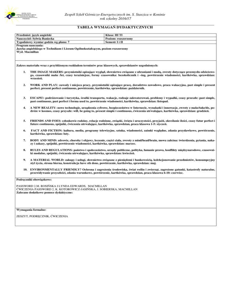 Zespół Szkół Górniczo-Energetycznych im. S. Staszica w Koninie rok szkolny 2016/17 TABELA WYMAGAŃ DYDAKTYCZNYCH Przedmiot: język angielski Klasa: III TI Nauczyciel: Sylwia Baniecka Poziom: rozszerzony Tygodniowy wymiar godzin wg planu: 7 Semestr I i II Program nauczania: Języka angielskiego w Technikum i Liceum Ogólnokształcącym, poziom rozszerzony Wyd. Macmillan Zakres materiału wraz z przybliżonym rozkładem terminów prac klasowych, sprawdzianów uzgodnionych: 1. THE IMAGE MAKERS: przymiotniki opisujące wygląd, słownictwo związane z ubraniami i modą, zwroty dotyczące przemysłu odzieżowego, czasowniki make /let, czasy teraźniejsze, formy czasownika: bezokolicznik i –ing, powtórzenie wiadomości, kartkówka, sprawdzian: wrzesień. 2. WORK AND PLAY: zawody i miejsca pracy, przymiotniki opisujące pracę, doradztwo zawodowe, praca wakacyjna, past simple i present perfect, present perfect continuous, powtórzenie, kartkówka, sprawdzian: październik. 3. ESCAPE!: podróżowanie i turystyka, środki transportu, wakacje, rodzaje zakwaterowań, problemy i wypadki, czasy przeszłe: past simple, past continuous, past perfect i forma used to, powtórzenie wiadomości, kartkówka, sprawdzian: listopad. 4. A NEW REALITY: nowe technologie, urządzenia cyfrowe, bezpieczeństwo w Internecie, wynalazki i innowacje, zwroty z make/take/do, podróże w kosmos, czasy przyszłe: will, be going to, present simple i continuous, ćwiczenia utrwalające, kartkówka, sprawdzian: grudzień. 5. FRIENDS AND FOES: członkowie rodziny, relacje rodzinne, związki, święta i uroczystości, przyjaźń, określanie ilości, czasy futur perfect i future continuous, spójniki, ćwiczenia utrwalające, kartkówka, sprawdzian, praca klasowa 1-5: styczeń. 6. FACT AND FICTION: kultura, media, programy telewizyjne, sztuka, wiadomości, zaimki względne, zdania przydawkowe, powtórzenie, kartkówka, sprawdzian: luty. 7. BODY AND MIND: zdrowie, choroby i objawy, leczenie, części ciała, zwroty z mind/head/brain, mowa zależna: twierdzenia, pytania, nakazy i zakazy, spójniki, powtórzenie wiadomości, kartkówka, sprawdzian: marzec. 8. RULES AND REGULATIONS: państwo i społeczeństwo, urzędy publiczne, polityka, łamanie prawa, konflikty międzynarodowe, czasowniki modalne, spójniki, ćwiczenia utrwalające, kartkówka, sprawdzian: kwiecień. 9. A MATERIAL WORLD: zakupy i usługi, słownictwo związane z pieniędzmi i bankowością, kolekcjonowanie przedmiotów, konsumpcyjny styl życia, strona bierna, konstrukcja have sth done, powtórzenie, kartkówka, sprawdzian: maj. 10. ENVIRONMENTALLY FRIENDLY? Ochrona i zagrożenia środowiska, świat roślin i zwierząt, zagrożone gatunki, katastrofy naturalne, przewidywanie przyszłości, zdania warunkowe, powtórzenie, kartkówka, sprawdzian, praca klasowa 6-10: czerwiec. Podręczniki obowiązkowe: PASSWORD 2,M. ROSIŃSKA I LYNDA EDWARDS, MACMILLAN ĆWICZENIA PASSWORD 2, K. KOTOROWICZ-JASIŃSKA, J. SOBIERSKA, MACMILLAN Zalecane dodatkowe pomoce dydaktyczne: Wymagania formalne: ZESZYT, PODRĘCZNIK, ĆWICZENIA