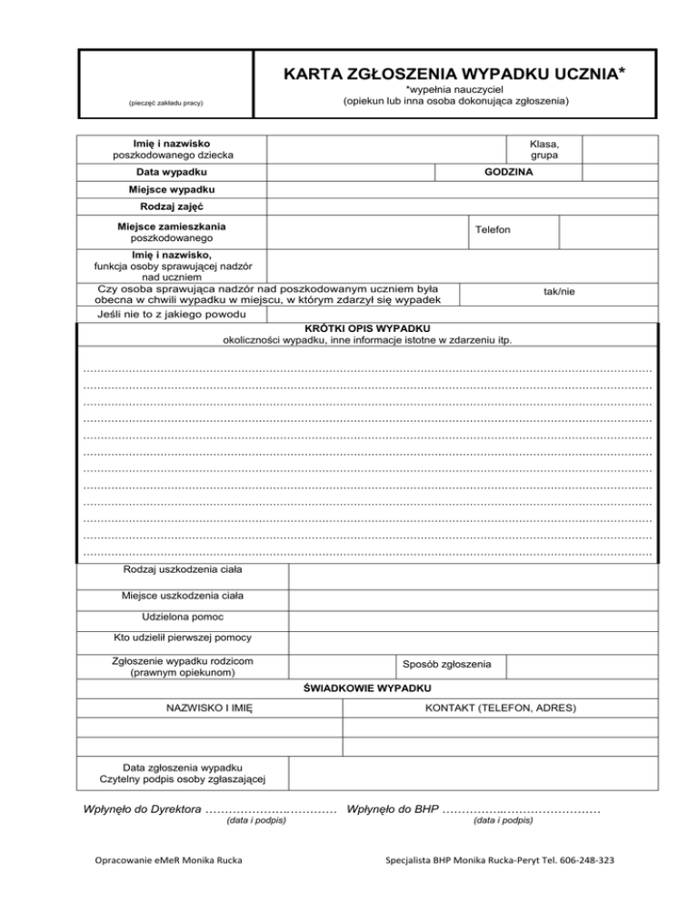 KARTA ZGŁOSZENIA WYPADKU UCZNIA* *wypełnia nauczyciel (opiekun lub inna osoba dokonująca zgłoszenia) (pieczęć zakładu pracy) Imię i nazwisko poszkodowanego dziecka Klasa, grupa Data wypadku GODZINA Miejsce wypadku Rodzaj zajęć Miejsce zamieszkania poszkodowanego Telefon Imię i nazwisko, funkcja osoby sprawującej nadzór nad uczniem Czy osoba sprawująca nadzór nad poszkodowanym uczniem była obecna w chwili wypadku w miejscu, w którym zdarzył się wypadek Jeśli nie to z jakiego powodu KRÓTKI OPIS WYPADKU okoliczności wypadku, inne informacje istotne w zdarzeniu itp. tak/nie ……………………………………………………………………………………………………………………………………………… ……………………………………………………………………………………………………………………………………………… ……………………………………………………………………………………………………………………………………………… ……………………………………………………………………………………………………………………………………………… ……………………………………………………………………………………………………………………………………………… ……………………………………………………………………………………………………………………………………………… ……………………………………………………………………………………………………………………………………………… ……………………………………………………………………………………………………………………………………………… ……………………………………………………………………………………………………………………………………………… ……………………………………………………………………………………………………………………………………………… ……………………………………………………………………………………………………………………………………………… ……………………………………………………………………………………………………………………………………………… Rodzaj uszkodzenia ciała Miejsce uszkodzenia ciała Udzielona pomoc Kto udzielił pierwszej pomocy Zgłoszenie wypadku rodzicom (prawnym opiekunom) Sposób zgłoszenia ŚWIADKOWIE WYPADKU NAZWISKO I IMIĘ KONTAKT (TELEFON, ADRES) Data zgłoszenia wypadku Czytelny podpis osoby zgłaszającej Wpłynęło do Dyrektora ………………….………… Wpłynęło do BHP ……………..…………………… (data i podpis) (data i podpis) Opracowanie eMeR Monika Rucka ………………………………………………… Specjalista BHP Monika Rucka-Peryt Tel. 606-248-323