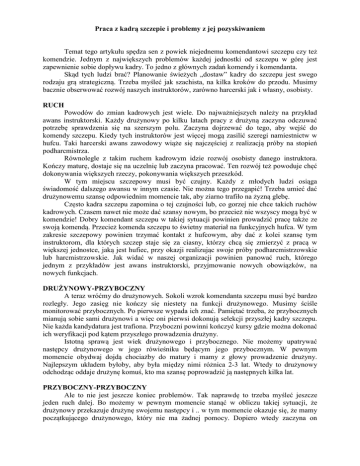 Praca z kadrą szczepie i problemy z jej pozyskiwaniem Temat tego artykułu spędza sen z powiek niejednemu komendantowi szczepu czy też komendzie. Jednym z największych problemów każdej jednostki od szczepu w górę jest zapewnienie sobie dopływu kadry. To jedno z głównych zadań komendy i komendanta. Skąd tych ludzi brać? Planowanie świeżych „dostaw” kadry do szczepu jest swego rodzaju grą strategiczną. Trzeba myśleć jak szachista, na kilka kroków do przodu. Musimy bacznie obserwować rozwój naszych instruktorów, zarówno harcerski jak i własny, osobisty. RUCH Powodów do zmian kadrowych jest wiele. Do najważniejszych należy na przykład awans instruktorski. Każdy drużynowy po kilku latach pracy z drużyną zaczyna odczuwać potrzebę sprawdzenia się na szerszym polu. Zaczyna dojrzewać do tego, aby wejść do komendy szczepu. Kiedy tych instruktorów jest więcej mogą zasilić szeregi namiestnictw w hufcu. Taki harcerski awans zawodowy wiąże się najczęściej z realizacją próby na stopień podharcmistrza. Równolegle z takim ruchem kadrowym idzie rozwój osobisty danego instruktora. Kończy maturę, dostaje się na uczelnię lub zaczyna pracować. Ten rozwój też powoduje chęć dokonywania większych rzeczy, pokonywania większych przeszkód. W tym miejscu szczepowy musi być czujny. Każdy z młodych ludzi osiąga świadomość dalszego awansu w innym czasie. Nie można tego przegapić! Trzeba umieć dać drużynowemu szansę odpowiednim momencie tak, aby ziarno trafiło na żyzną glebę. Często kadra szczepu zapomina o tej czujności lub, co gorzej nie chce takich ruchów kadrowych. Czasem nawet nie może dać szansy nowym, bo przecież nie wszyscy mogą być w komendzie! Dobry komendant szczepu w takiej sytuacji powinien prowadzić pracę także ze swoją komendą. Przecież komenda szczepu to świetny materiał na funkcyjnych hufca. W tym zakresie szczepowy powinien trzymać kontakt z hufcowym, aby dać z kolei szansę tym instruktorom, dla których szczep staje się za ciasny, którzy chcą się zmierzyć z pracą w większej jednostce, jaką jest hufiec, przy okazji realizując swoje próby podharcmistrzowskie lub harcmistrzowskie. Jak widać w naszej organizacji powinien panować ruch, którego jednym z przykładów jest awans instruktorski, przyjmowanie nowych obowiązków, na nowych funkcjach. DRUŻYNOWY-PRZYBOCZNY A teraz wróćmy do drużynowych. Sokoli wzrok komendanta szczepu musi być bardzo rozległy. Jego zasięg nie kończy się niestety na funkcji drużynowego. Musimy ściśle monitorować przybocznych. Po pierwsze wypada ich znać. Pamiętać trzeba, że przybocznych mianują sobie sami drużynowi a więc oni pierwsi dokonują selekcji przyszłej kadry szczepu. Nie każda kandydatura jest trafiona. Przyboczni powinni kończyć kursy gdzie można dokonać ich weryfikacji pod kątem przyszłego prowadzenia drużyny. Istotną sprawą jest wiek drużynowego i przybocznego. Nie możemy upatrywać następcy drużynowego w jego rówieśniku będącym jego przybocznym. W pewnym momencie obydwaj dojdą chociażby do matury i mamy z głowy prowadzenie drużyny. Najlepszym układem byłoby, aby była między nimi różnica 2-3 lat. Wtedy to drużynowy odchodząc oddaje drużynę komuś, kto ma szansę poprowadzić ją następnych kilka lat. PRZYBOCZNY-PRZYBOCZNY Ale to nie jest jeszcze koniec problemów. Tak naprawdę to trzeba myśleć jeszcze jeden ruch dalej. Bo możemy w pewnym momencie stanąć w obliczu takiej sytuacji, że drużynowy przekazuje drużynę swojemu następcy i .. w tym momencie okazuje się, że mamy początkującego drużynowego, który nie ma żadnej pomocy. Dopiero wtedy zaczyna on szukać kogoś na swoje miejsce. Dlatego, każda drużyna powinna mieć dwóch przybocznych. Wtedy nie ma problemu, kiedy ktoś awansuje. Drużyna wspaniale działa mając zapewnioną kadrę. O stworzenie takiej sytuacji w drużynach musi dbać szczepowy, gdyż najczęściej drużynowi zapewniają sobie przybocznego i tyle. W tym momencie wywiązują się z swojego obowiązku zapewnienia sobie następcy. HEADHUNTER Następnym elementem pracy z kadrą w szczepie jest racjonalna polityka kadrowa wobec wszystkich jednostek, polegająca na zapewnianiu kadry chociażby do gromad zuchowych, które same sobie nie wychowają przybocznych. Potrzeba tutaj mądrej działalności polegającej na wyszukiwaniu talentów wśród drużyn harcerskich, starszoharcerskich i wędrowniczych szczepu. Praca to niełatwa, ale bardzo potrzebna. Trzeba tylko zachować umiar i pamiętać, że pierwsze i ostatnie słowo zawsze należy do drużynowego danej drużyny, z której chcemy dokonać transferu. Nie może być tak, że drużynowy ma określone plany wobec swoich podopiecznych a my zabieramy mu najlepszych ludzi. Czasem może się zdarzyć, że mimo naszej mądrości odejdzie nagle drużynowy i przyboczny. Katastrofa! Co tu robić z osieroconą drużyną? Czasami to komendant szczepu podwinie rękawy i poprowadzi jakiś czas drużynę, może to także zrobić ktoś z komendy, ale są to działania prowizoryczne. Trzeba poszukać kandydata na drużynowego pośród przybocznych innych drużyn szczepu. KUŹNIA KADR W tym miejscu przejdziemy do sprawy tzw. Kuźni kadr. Gdzie to się wykuwa tych wspaniałych instruktorów, skąd się bierze ten najszlachetniejszy materiał? Mam na ten temat teorię, ale nie jest to jedyna droga do sukcesu. Najważniejszym źródłem pozyskiwania kadry są same drużyny. To w nich wychowuje się i przygotowuje przyszłą kadrę szczepu. Poczynając od zastępowego zaczynamy zauważać wybitne jednostki, które w przyszłości często zostają przybocznymi. Jeżeli w drużynie występuje „nadprodukcja” kandydatów na funkcyjnych to w takim właśnie miejscu można dokonać transferu. Daje się szansę bycia przybocznym w innej drużynie lub gromadzie. Często mianowanie na przybocznego jest poprzedzone testami trwającymi nawet k