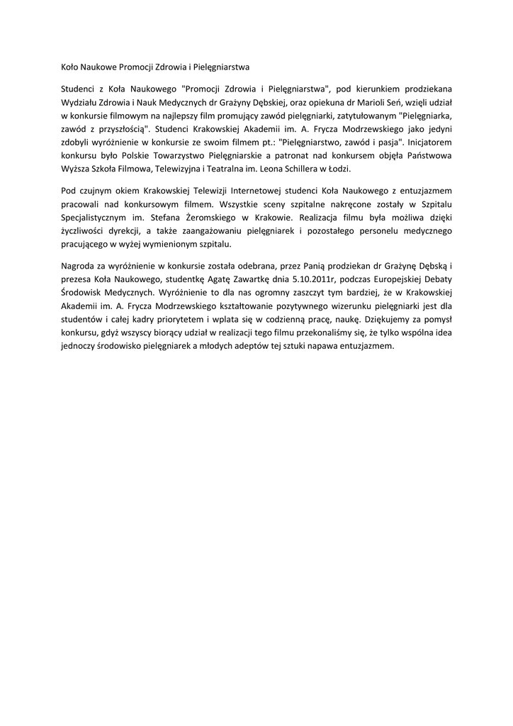 Koło Naukowe Promocji Zdrowia i Pielęgniarstwa Studenci z Koła Naukowego "Promocji Zdrowia i Pielęgniarstwa", pod kierunkiem prodziekana Wydziału Zdrowia i Nauk Medycznych dr Grażyny Dębskiej, oraz opiekuna dr Marioli Seń, wzięli udział w konkursie filmowym na najlepszy film promujący zawód pielęgniarki, zatytułowanym "Pielęgniarka, zawód z przyszłością". Studenci Krakowskiej Akademii im. A. Frycza Modrzewskiego jako jedyni zdobyli wyróżnienie w konkursie ze swoim filmem pt.: "Pielęgniarstwo, zawód i pasja". Inicjatorem konkursu było Polskie Towarzystwo Pielęgniarskie a patronat nad konkursem objęła Państwowa Wyższa Szkoła Filmowa, Telewizyjna i Teatralna im. Leona Schillera w Łodzi. Pod czujnym okiem Krakowskiej Telewizji Internetowej studenci Koła Naukowego z entuzjazmem pracowali nad konkursowym filmem. Wszystkie sceny szpitalne nakręcone zostały w Szpitalu Specjalistycznym im. Stefana Żeromskiego w Krakowie. Realizacja filmu była możliwa dzięki życzliwości dyrekcji, a także zaangażowaniu pielęgniarek i pozostałego personelu medycznego pracującego w wyżej wymienionym szpitalu. Nagroda za wyróżnienie w konkursie została odebrana, przez Panią prodziekan dr Grażynę Dębską i prezesa Koła Naukowego, studentkę Agatę Zawartkę dnia 5.10.2011r, podczas Europejskiej Debaty Środowisk Medycznych. Wyróżnienie to dla nas ogromny zaszczyt tym bardziej, że w Krakowskiej Akademii im. A. Frycza Modrzewskiego kształtowanie pozytywnego wizerunku pielęgniarki jest dla studentów i całej kadry priorytetem i wplata się w codzienną pracę, naukę. Dziękujemy za pomysł konkursu, gdyż wszyscy biorący udział w realizacji tego filmu przekonaliśmy się, że tylko wspólna idea jednoczy środowisko pielęgniarek a młodych adeptów tej sztuki napawa entuzjazmem.
