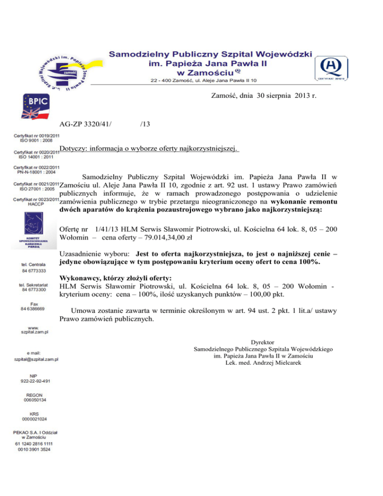 Zamość, dnia 30 sierpnia 2013 r. AG-ZP 3320/41/ /13 Dotyczy: informacja o wyborze oferty najkorzystniejszej. Samodzielny Publiczny Szpital Wojewódzki im. Papieża Jana Pawła II w Zamościu ul. Aleje Jana Pawła II 10, zgodnie z art. 92 ust. 1 ustawy Prawo zamówień publicznych informuje, że w ramach prowadzonego postępowania o udzielenie zamówienia publicznego w trybie przetargu nieograniczonego na wykonanie remontu dwóch aparatów do krążenia pozaustrojowego wybrano jako najkorzystniejszą: Ofertę nr 1/41/13 HLM Serwis Sławomir Piotrowski, ul. Kościelna 64 lok. 8, 05 – 200 Wołomin – cena oferty – 79.014,34,00 zł Uzasadnienie wyboru: Jest to oferta najkorzystniejsza, to jest o najniższej cenie – jedyne obowiązujące w tym postępowaniu kryterium oceny ofert to cena 100%. Wykonawcy, którzy złożyli oferty: HLM Serwis Sławomir Piotrowski, ul. Kościelna 64 lok. 8, 05 – 200 Wołomin kryterium oceny: cena – 100%, ilość uzyskanych punktów – 100,00 pkt. Umowa zostanie zawarta w terminie określonym w art. 94 ust. 2 pkt. 1 lit.a/ ustawy Prawo zamówień publicznych. Dyrektor Samodzielnego Publicznego Szpitala Wojewódzkiego im. Papieża Jana Pawła II w Zamościu Lek. med. Andrzej Mielcarek