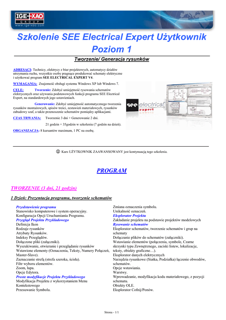 Szkolenie SEE Electrical Expert UŜytkownik Poziom 1 Tworzenie/ Generacja rysunków ADRESACI: Technicy, elektrycy z biur projektowych, automatycy działów utrzymania ruchu, wszystkie osoby pragnące produkować schematy elektryczne i uŜytkować program SEE ELECTRICAL EXPERT V4. WYMAGANIA: Znajomość obsługi systemu Windows XP lub Windows 7. CELE: Tworzenie: Zdobyć umiejętność rysowania schematów elektrycznych oraz uŜywania podstawowych funkcji programu SEE Electrical Expert, na standardowych jego ustawieniach. Generowanie: Zdobyć umiejętność automatycznego tworzenia rysunków montaŜowych, spisów treści, zestawień materiałowych, rysunków zabudowy szaf, a takŜe przenoszenie schematów pomiędzy aplikacjami. CZAS TRWANIA: Tworzenie 3 dni + Generowanie 2 dni. 21 godzin + 35godzin w szkoleniu (7 godzin na dzień). ORGANIZACJA: 8 kursantów maximum, 1 PC na osobę. Kurs UśYTKOWNIK ZAAWANSOWANY jest kontynuacją tego szkolenia. PROGRAM TWORZENIE (3 dni, 21 godzin) 1 Dzień: Prezentacja programu, tworzenie schematów Przedstawienie programu Stanowisko komputerowe i system operacyjny. Konfiguracja Opcji Uruchamiania Programu. Przegląd Projektu Przykładowego Definicja Ikon Rodzaje rysunków Atrybuty Rysunków. Indeksy Przeglądów. Dołączone pliki (załączniki). Wyszukiwanie, otwieranie i przeglądanie rysunków Wstawione elementy (Oznaczenia, Teksty, Numery Połączeń, Master-Slave). Zaznaczanie strefą (strefa szeroka, ścisła). Filtr wyboru elementów. Zoom, lupa. Opcje Edytora. Proste modyfikacje Projektu Przykładowego Modyfikacja Projektu z wykorzystaniem Menu Kontekstowego Przesuwanie Symbolu. Zmiana oznaczenia symbolu. Unikalność oznaczeń. Eksplorator Projektu Zakładanie projektu na podstawie projektów modelowych Rysowanie schematów Eksplorator schematów, tworzenie schematów i grup na schematy Dołączanie plików do schematów (załączniki). Wstawianie elementów (połączenia, symbole, Czarne skrzynki typu Zewnętrznego, zaciski listew, lokalizacje, teksty, obiekty graficzne…). Eksplorator danych elektrycznych Narzędzia rysunkowe (Siatka, Podziałka) łączenie obwodów, schematów. Opcje wstawiania. Warstwy. Wprowadzanie, modyfikacja kodu materiałowego, z pozycji schematu. Obiekty OLE. Eksplorator Cofnij/Ponów. Strona - 1/1 Wersja 4 Szkolenie UŜytkownik Poziom 1 2 dzień: Tworzenie Rysunków (kontynuacja) Widoczność numerów połączeń. Zmiana typu połączenia. Wyszukiwanie błędów na rysunkach ideowych przed automatycznym generowaniem schematów. Automatyczne numerowanie połączeń. Automatyczna numeracja połączeń według symboli. Wyrównywanie numerów połączeń. Adresacja Krosowa (róŜne normy). Spis treści Generowanie Spisu Treści. Aktualizacja Spisu Treści. Wydruk Wydruk jednego lub wielu schematów. Zapis rysunków do innych formatów (JPG, PDF, DWG…). Operacje na schematach Kopiowanie jednego lub kilku schematów. Kopiowanie schematów z innego projektu. Usuwanie jednego lub kilku schematów. Modyfikacja kolejności schematów. Modyfikacja grup rysunkowych. Zarządzanie indeksami przeglądów Bloki i standardowe Schematy Typowe Eksplorator Bloków i Schematów Typowych. Parametry Bloków i Schematów Typowych. Zarządzanie Blokami i Schematami Typowymi. Przetwarzania na schematach Ręczne Oznaczanie Połączeń Zmiana właściwości połączenia 3 dzień - Dostosowanie Eksplorator projektów Przeglądanie projektu Archiwizacja z lub bez kompresji. Przywracanie skompresowanego projektu. Otwieranie projektów z wcześniejszych wersji programu. Środowisko Przegląd menu Środowisko Eksplorator środowisk Zarządzanie środowiskami Arkusze formatowe Dostosowanie arkusza formatowego. Eksplorator arkuszy formatowych. Dodanie logo firmy. Wstawianie makropodstawień. Obszar roboczy, parametryzacja miejsca na podziałkę. Aktualizacja arkusza formatowego Katalog aparatów Dodawanie i Usuwanie Kodu Katalogowego Zarządzanie filtrami (katalog lokalny i internetowy). Podstawowe modyfikacje symboli Modyfikacja symboli w środowisku programu i w projekcie Modyfikacje atrybutów symboli – na schemacie.. Modyfikacje końcówek i atrybutów w Edytorze Symboli. Tworzenie symboli z zaznaczonych na schemacie elementów graficznych. Generowanie (2 dni, 14 godzin) 4 dzień: UŜywanie Listew i Zestawień - Poziom 1 Zarządzanie listwą Eksplorator listew. Edytor Listew. Tryb Wyboru dla listwy zaciskowej. • Sortowanie listwy. • Zaciski WieloŜyłowe (2 Ŝyły). Oznaczanie zacisków piętrowych. Zarządzanie kablami Wstawianie kabli w Edytorze Listew. Modyfikacje kabli i Ŝył.. Generowanie rysunków montaŜowych listew Wybór szablonów dt. wyglądu listwy. Generowanie kilku listew na jeden schemat. Aktualizacja wygenerowanych schematów listew. Zarządzanie zestawieniami aparatów Domyślny szablon dla generowania zestawień. Ekstrakcja i generowanie zestawienia. Inne formaty generowań (.mdb, .xls, .txt ). Jednoczesne generowanie wielu zestawień. Aktualizacja zestawienia aparatów. Eksport/import danych z projektu. Import lokalizacji, funkcji, listew i złączy. Strona - 2/2 Wersja 4 Szkolenie UŜytkownik Poziom 1 5 dzień – Zabudowa Szaf, PLC, Tłumaczenia, Wymiana DWG/DXF, Synoptyka i Harness (wiązka) Zarządzanie zabudową szaf Lokalizacja aparatów w Edytorze Schematów Zakładanie planu zabudowy. Wybór szafy. Wstawianie elementów (szyny, korytka, aparatura). Wymiarowanie. Zmiana lokalizacji aparatów. Wydruk planów zabudowy. Zarządzanie sterownikami PLC Manager PLC I/O – projektowanie sterownika. Generowanie schematów sterownika. Aktualizacja schematów I/O (WE/WY). Tłumaczenia Tłumaczenie projektu. Lokalizacja słownika dla tłumaczeń. Dodanie nowych wyraŜeń do słownika. Wymiana DWG/DXF Import plików DWG/DXF oraz eksport rysunków z See. Synoptyka Ogólne informacje. • Zakładanie schematu synoptyki. • Nawigacja z rysunku synoptyki do schematu ideowego, listwy zaciskowej, planu zabudowy szafy. Harness (na 