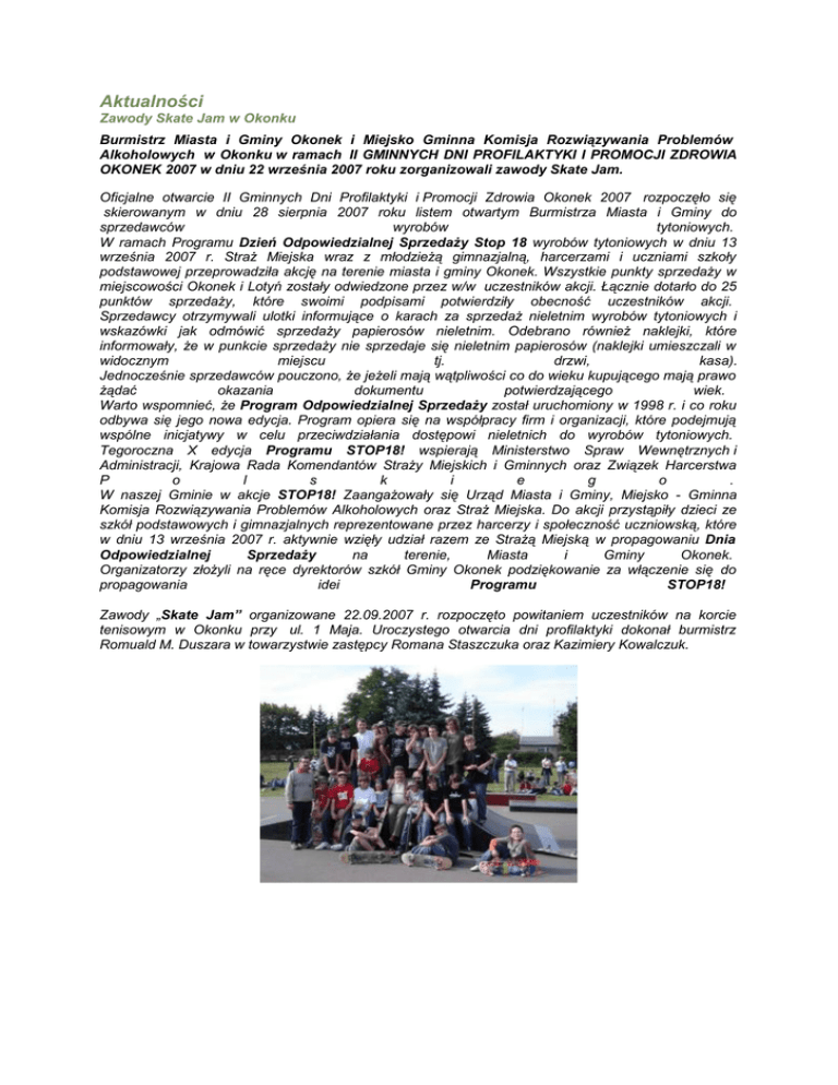 Aktualności Zawody Skate Jam w Okonku Burmistrz Miasta i Gminy Okonek i Miejsko Gminna Komisja Rozwiązywania Problemów Alkoholowych w Okonku w ramach II GMINNYCH DNI PROFILAKTYKI I PROMOCJI ZDROWIA OKONEK 2007 w dniu 22 września 2007 roku zorganizowali zawody Skate Jam. Oficjalne otwarcie II Gminnych Dni Profilaktyki i Promocji Zdrowia Okonek 2007 rozpoczęło się skierowanym w dniu 28 sierpnia 2007 roku listem otwartym Burmistrza Miasta i Gminy do sprzedawców wyrobów tytoniowych. W ramach Programu Dzień Odpowiedzialnej Sprzedaży Stop 18 wyrobów tytoniowych w dniu 13 września 2007 r. Straż Miejska wraz z młodzieżą gimnazjalną, harcerzami i uczniami szkoły podstawowej przeprowadziła akcję na terenie miasta i gminy Okonek. Wszystkie punkty sprzedaży w miejscowości Okonek i Lotyń zostały odwiedzone przez w/w uczestników akcji. Łącznie dotarło do 25 punktów sprzedaży, które swoimi podpisami potwierdziły obecność uczestników akcji. Sprzedawcy otrzymywali ulotki informujące o karach za sprzedaż nieletnim wyrobów tytoniowych i wskazówki jak odmówić sprzedaży papierosów nieletnim. Odebrano również naklejki, które informowały, że w punkcie sprzedaży nie sprzedaje się nieletnim papierosów (naklejki umieszczali w widocznym miejscu tj. drzwi, kasa). Jednocześnie sprzedawców pouczono, że jeżeli mają wątpliwości co do wieku kupującego mają prawo żądać okazania dokumentu potwierdzającego wiek. Warto wspomnieć, że Program Odpowiedzialnej Sprzedaży został uruchomiony w 1998 r. i co roku odbywa się jego nowa edycja. Program opiera się na współpracy firm i organizacji, które podejmują wspólne inicjatywy w celu przeciwdziałania dostępowi nieletnich do wyrobów tytoniowych. Tegoroczna X edycja Programu STOP18! wspierają Ministerstwo Spraw Wewnętrznych i Administracji, Krajowa Rada Komendantów Straży Miejskich i Gminnych oraz Związek Harcerstwa P o l s k i e g o . W naszej Gminie w akcje STOP18! Zaangażowały się Urząd Miasta i Gminy, Miejsko - Gminna Komisja Rozwiązywania Problemów Alkoholowych oraz Straż Miejska. Do akcji przystąpiły dzieci ze szkół podstawowych i gimnazjalnych reprezentowane przez harcerzy i społeczność uczniowską, które w dniu 13 września 2007 r. aktywnie wzięły udział razem ze Strażą Miejską w propagowaniu Dnia Odpowiedzialnej Sprzedaży na terenie, Miasta i Gminy Okonek. Organizatorzy złożyli na ręce dyrektorów szkół Gminy Okonek podziękowanie za włączenie się do propagowania idei Programu STOP18! Zawody „Skate Jam” organizowane 22.09.2007 r. rozpoczęto powitaniem uczestników na korcie tenisowym w Okonku przy ul. 1 Maja. Uroczystego otwarcia dni profilaktyki dokonał burmistrz Romuald M. Duszara w towarzystwie zastępcy Romana Staszczuka oraz Kazimiery Kowalczuk. Swoją obecnością zaszczycili również Bronisława Ćwikła Sekretarz Miasta i Gminy Okonek i Wiesław Polewski – komendant Straży Miejskiej. Oprócz pokazów deskorolkowców było wiele innych atrakcji. W ocenie dodatkowej zaprezentowało się trzech najlepszych zawodników z Okonka. W międzyczasie odbył się pokaz tworzenia profesjonalnego Graffiti. Piotr Glanc - i Marcin Czołowski (obaj ze Szczecinka) na ścianie dawnego kortu tenisowego wykazywali się swoimi umiejętnościami. Bardzo widowiskowo zaprezentowała się także grupa „Parkur” w osobach Michał Harasimowicz, Kacper Szymański, Marcin Masłysz oraz Aron Rychanicz. Celem tych zawodów jest popularyzacja sportów ekstremalnych, aktywny wypoczynek, dobra zabawa oraz integracja społeczności lokalnej. Pomysł zrodził się dzięki grupie 2sick4you z Okonka z Ryszardem Stępniewiczem i Kacprem Woźnicą na czele. Uczestnikami zawodów były grupy z Okonka, Złotowa Szczecinka i Dobiegniewa. Po zapowiedzi koordynatorki Kazimiery Kowalczuk, która czuwała w tym dniu nad całością, wręczono d y p l o m y : klasa III – IV szkoły podstawowej 1. miejsce Kacper Bagdzion najmłodszy uczestnik 2. miejsce Kacper Emert klasa V – VI szkoły podstawowej 1. Paweł Petryk 2. Łukasz Łodkowski 3. Krystian Spychała klasa IIII gimnazjum 1. Radosław Adamkiewicz 2. Bartosz Karaś 3. Wojciech Jaworski kategoria ponadgimnazjalna 1. Paweł Sołonowicz 2. Damian Kociszewski 3. Ryszard Stępniewicz Trzech najlepszych zawodników z gminy Okonek to: 1. Kacper Woźnica 2. Adam Łapiński 3. Paweł Petryk Serdecznie gratulujemy wyróżnionym, bo podporą każdej społeczności lokalnej jest młodzież. Cieszymy się, że młodzi z naszej Gminy są rozumni i utalentowani, zamiast używek wybierają inni sposób spędzania wolnego czasu, że mogą i chcą być świadomymi uczestnikami akcji profilaktycznej. Wielu z Was z pewnością będzie w przyszłości drogowskazami dla przyszłych pokoleń. Tegoroczna impreza zostanie wpisana w kalendarzu imprez cyklicznych i w przyszłym roku będzie sfinansowana również z budżetu Gminy- te słowa skierował burmistrz Duszara do wszystkich uczestniczących. W ostatnim dniu tj. 28.09.07r. odbędzie się seminarium dla przedstawicieli różnych grup zawodowych, zajmujących się problematyką uzależnień. Celem spotkania będzie dostarczenie przez specjalistę panią dr Teresę Kobrzyńską edukatora Ogólnopolskiej Kampanii Edukacyjnej „Ciąża bez alkoholu” informacje na temat: przekonanie społeczne na temat picia przez kobietę w ciąży, picie alkoholu przez kobiety w ciążynajważniejsze wyniki badań, - Płodowy Zespół Alkoholowy jako najgroźniejszy z możliwych skutków picia alkoholu w ciąży, - profilaktyka jako skuteczna metoda zapobiegania spożywania alkoholu w ciąży. Słowa podziękowania kierujemy w stronę zastępcy burmistrza Romana Staszczuka, który jednocześnie pełni funkcję przewodniczącego MGKRPA, oraz Kazimiery Kowalczuk, którzy profesjonalnie przygotowali całość.