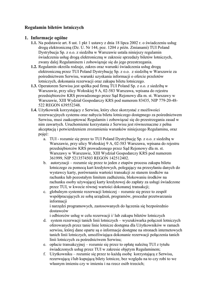 Regulamin biletów lotniczych 1. Informacje ogólne 1.1. Na podstawie art. 8 ust. 1 pkt 1 ustawy z dnia 18 lipca 2002 r. o świadczeniu usług drogą elektroniczną (Dz. U. Nr 144, poz. 1204 z późn. Zmianami) TUI Poland Dystrybucja Sp. z o.o. z siedziba w Warszawie ustala niniejszy regulamin świadczenia usług drogą elektroniczną w zakresie sprzedaży biletów lotniczych, zwany dalej Regulaminem i zobowiązuje się do jego przestrzegania. 1.2. Regulamin określa rodzaje, zakres oraz warunki świadczenia usług drogą elektroniczną przez TUI Poland Dystrybucję Sp. z o.o. z siedzibą w Warszawie za pośrednictwem Serwisu, warunki uzyskania informacji o ofercie przelotów lotniczych, dokonania rezerwacji oraz zakupu biletu lotniczego. 1.3. Operatorem Serwisu jest spółka pod firmą TUI Poland Sp. z o.o. z siedzibą w Warszawie, przy ulicy Wołoskiej 9 A, 02-583 Warszawa, wpisana do rejestru przedsiębiorców KRS prowadzonego przez Sąd Rejonowy dla m. st. Warszawy w Warszawie, XIII Wydział Gospodarczy KRS pod numerem 83435, NIP 779-20-48522 REGON 639552348. 1.4. Użytkownik korzystający z Serwisu, który chce skorzystać z możliwości rezerwacyjnych systemu oraz nabycia biletu lotniczego dostępnego za pośrednictwem Serwisu, musi zaakceptować Regulamin i zobowiązać się do przestrzegania zasad w nim zawartych. Uruchomienie korzystania z Serwisu jest równoznaczne z pełna akceptacją i potwierdzeniem zrozumienia warunków niniejszego Regulaminu, oraz pojęć: a. TUI - rozumie się przez to TUI Poland Dystrybucję Sp. z o.o. z siedzibą w Warszawie, przy ulicy Wołoskiej 9 A, 02-583 Warszawa, wpisana do rejestru przedsiębiorców KRS prowadzonego przez Sąd Rejonowy dla m. st. Warszawy w Warszawie, XIII Wydział Gospodarczy KRS pod numerem 361999, NIP 5213574503 REGON 142512402. b. autoryzacji – rozumie się przez to jeden z etapów procesu zakupu biletu lotniczego za pomocą kart kredytowych, polegający na przesyłaniu danych do wystawcy karty, porównaniu wartości transakcji ze stanem środków na rachunku lub pozostałym limitem zadłużenia, blokowaniu środków na rachunku osoby używającej karty kredytowej do zapłaty za usługi świadczone przez TUI, w kwocie równej wartości dokonanej transakcji; c. globalnym systemie rezerwacji lotniczej – rozumie się przez to zespół współpracujących ze sobą urządzeń, programów, procedur przetwarzania informacji i narzędzi programowych, zastosowanych do łączenia się bezpośrednio dostawców i odbiorców usług w celu rezerwacji i/ lub zakupu biletów lotniczych d. system rezerwacji tanich linii lotniczych – wyszukiwarka połączeń lotniczych oferowanych przez tanie linie lotnicze dostępna dla Użytkowników w ramach serwisu, której dane oparte są o informacje dostępne na stronach internetowych tanich linii lotniczych, umożliwiająca dokonanie rezerwacji połączenia tanich linii lotniczych za pośrednictwem Serwisu; e. opłacie transakcyjnej – rozumie się przez to opłatę należną TUI z tytułu świadczonych usług przez TUI w zakresie objętym Regulaminem; f. Użytkowniku – rozumie się przez to każdą osobę korzystającą z Serwisu, rezerwującą i/lub kupującą bilety lotnicze, bez względu na to czy robi to we własnym imieniu czy w imieniu i na rzecz osób trzecich; g. Kliencie – rozumie się przez to każdą osobę, która zamierza kupić lub kupiła bilet lotniczy od przewoźnika za pośrednictwem www.tui.pl lub korzystając z Call Center h. rezerwacji – rozumie się przez to ogół czynności podejmowanych przez Użytkownika lub Klienta mających na celu zawarcie umowy z przewoźnikiem lotniczym za pośrednictwem www.tui.pl i. potwierdzeniu rezerwacji – rozumie się przez to informację wysyłaną przez TUI Użytkownikowi lub Klientowi, zawierającą istotne elementy przyszłej umowy z przewoźnikiem. Informacja taka nie stanowi oferty w rozumieniu ustawy Kodeksu cywilnego, a jest wyłącznie zaproszeniem do zawarcia umowy. Elementy przyszłej umowy podane w informacji mogą ulegać zmianie w zakresie i na zasadach określonych w niniejszym Regulaminie; j. przewoźniku lotniczym – rozumie się przez to podmiot prowadzący działalność gospodarczą z zakresu przewozu lotniczego; k. Serwisie – rozumie się przez to Serwis znajdujący się pod adresem URL www.tui.pl/bilety-lotnicze l. Call Center – świadczona przez TUI usługa telefonicznej rezerwacji i/lub zakupu biletów lotniczych przez Klientów (nr: 0 801 884 801 lub 22 255 03 01) m. linii regularnej – rozumie się przez to przewoźnika lotniczego będącego członkiem IATA dokonującego rozliczeń za pośrednictwem BSP; n. tanich liniach lotniczych – rozumie się przez to linie lotnicze nie będące liniami regularnymi; o. czarterach – rozumie się połączenia inne niż realizowane przez tanie linie lotnicze i linie regularne, oferowane wyłącznie przez TUI Poland podlegające niniejszemu Regulaminowi oraz wskazanym Warunkom Imprez Turystycznych TUI Poland Sp. z o.o. p. IATA – Międzynarodowe Zrzeszenie Przewoźników Powietrznych (ang. International Air Transport Association = IATA) – światowa organizacja handlowa z siedzibą w Montrealu i Genewie (Szwajcaria) skupiająca przewoźników lotniczych. Celem IATA jest ustalanie ogólnych norm obowiązujących w cywilnym transporcie lotniczym, opracowywanie i rozwój infrastruktury, produktów i programów umożliwiających towarzystwom lotniczym oraz agentom IATA świadczenie usług o najwyższej jakości; q. BSP – (ang. Billing and Settlement Plan) jest systemem zaprojektowanym w celu ułatwienia i uproszczenia sprzedaży, sprawozdawczości Akredytowanych Agentów IATA, jak również poprawy kontroli finansowej i przepływów pieniężnych pomiędzy Agentami i przewoźnikami lotniczymi; r. Akredytowanym Agencie – rozumie się przez to wszystkie biura agentów akredytowane przez IATA, które mają prawo do uczestniczenia i rozliczania się przez BSP, upraw