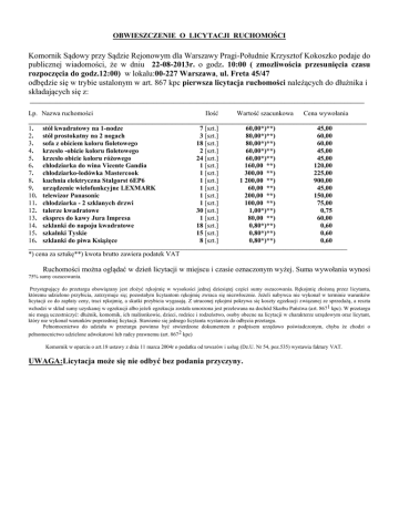 OBWIESZCZENIE O LICYTACJI RUCHOMOŚCI Komornik Sądowy przy Sądzie Rejonowym dla Warszawy Pragi-Południe Krzysztof Kokoszko podaje do publicznej wiadomości, że w dniu 22-08-2013r. o godz. 10:00 ( zmozliwościa przesunięcia czasu rozpoczęcia do godz.12:00) w lokalu:00-227 Warszawa, ul. Freta 45/47 odbędzie się w trybie ustalonym w art. 867 kpc pierwsza licytacja ruchomości należących do dłużnika i składających się z: ____________________________________________________________________________________________________ Lp. Nazwa ruchomości Ilość Wartość szacunkowa Cena wywołania _____________________________________________________________________________________________________ 1. stół kwadratowy na 1-nodze 7 [szt.] 60,00*)**) 45,00 2. stół prostokatny na 2 nogach 3 [szt.] 80,00*)**) 60,00 3. sofa z obiciem koloru fioletowego 18 [szt.] 80,00*)**) 60,00 4. krzesło -obicie koloru fioletowego 2 [szt.] 60,00*)**) 45,00 5. krzesło obicie koloru różowego 24 [szt.] 60,00*)**) 45,00 6. chłodziarka do wina Vicente Gandia 1 [szt.] 160,00 **) 120,00 7. chłodziarko-lodówka Mastercook 1 [szt.] 300,00 **) 225,00 8. kuchnia elektryczna Stalgorst 6EP6 1 [szt.] 1 200,00 **) 900,00 9. urządzenie wielofunkcyjne LEXMARK 1 [szt.] 60,00 **) 45,00 10. telewizor Panasonic 1 [szt.] 200,00 **) 150,00 11. chłodziarka - 2 szklanych drzwi 1 [szt.] 100,00 **) 75,00 12. talerze kwadratowe 30 [szt.] 1,00*)**) 0,75 13. ekspres do kawy Jura Impresa 1 [szt.] 80,00 **) 60,00 14. szklanki do napoju kwadratowe 18 [szt.] 0,80*)**) 0,60 15. szkalnki Tyskie 15 [szt.] 0,80*)**) 0,60 16. szklanki do piwa Książęce 8 [szt.] 0,80*)**) 0,60 _______________________________________________________________________________________________________________________ *) cena za sztukę**) kwota brutto zawiera podatek VAT Ruchomości można oglądać w dzień licytacji w miejscu i czasie oznaczonym wyżej. Suma wywołania wynosi 75% sumy oszacowania. Przystępujący do przetargu obowiązany jest złożyć rękojmię w wysokości jednej dziesiątej części sumy oszacowania. Rękojmię złożoną przez licytanta, któremu udzielono przybicia, zatrzymuje się; pozostałym licytantom rękojmię zwraca się niezwłocznie. Jeżeli nabywca nie wykonał w terminie warunków licytacji co do zapłaty ceny, traci rękojmię, a skutki przybicia wygasają. Z utraconej rękojmi pokrywa się koszty egzekucji związanej ze sprzedażą, a reszta wchodzi w skład sumy uzyskanej w egzekucji albo jeżeli egzekucja została umorzona jest przelewana na dochód Skarbu Państwa (art. 8671 kpc). W przetargu nie mogą uczestniczyć: dłużnik, komornik, ich małżonkowie, dzieci, rodzice i rodzeństwo, osoby obecne na licytacji w charakterze urzędowym oraz licytant, który nie wykonał warunków poprzedniej licytacji. Stawienie się jednego licytanta wystarcza do odbycia przetargu. Pełnomocnictwo do udziału w przetargu powinno być stwierdzone dokumentem z podpisem urzędowo poświadczonym, chyba że chodzi o pełnomocnictwo udzielone adwokatowi lub radcy prawnemu (art. 867 2 kpc) Komornik w oparciu o art.18 ustawy z dnia 11 marca 2004r o podatku od towarów i usług (Dz.U. Nr 54, poz.535) wystawia faktury VAT. UWAGA:Licytacja może się nie odbyć bez podania przyczyny.