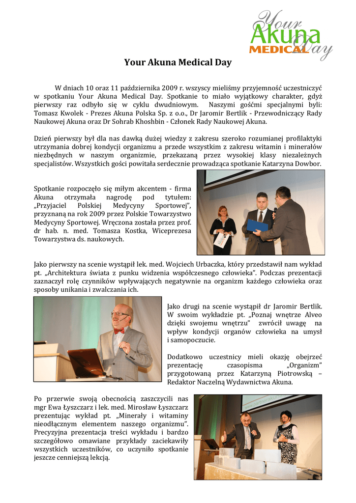 Your Akuna Medical Day W dniach 10 oraz 11 października 2009 r. wszyscy mieliśmy przyjemność uczestniczyć w spotkaniu Your Akuna Medical Day. Spotkanie to miało wyjątkowy charakter, gdyż pierwszy raz odbyło się w cyklu dwudniowym. Naszymi gośćmi specjalnymi byli: Tomasz Kwolek - Prezes Akuna Polska Sp. z o.o., Dr Jaromir Bertlik - Przewodniczący Rady Naukowej Akuna oraz Dr Sohrab Khoshbin - Członek Rady Naukowej Akuna. Dzień pierwszy był dla nas dawką dużej wiedzy z zakresu szeroko rozumianej profilaktyki utrzymania dobrej kondycji organizmu a przede wszystkim z zakresu witamin i minerałów niezbędnych w naszym organizmie, przekazaną przez wysokiej klasy niezależnych specjalistów. Wszystkich gości powitała serdecznie prowadząca spotkanie Katarzyna Dowbor. Spotkanie rozpoczęło się miłym akcentem - firma Akuna otrzymała nagrodę pod tytułem: „Przyjaciel Polskiej Medycyny Sportowej”, przyznaną na rok 2009 przez Polskie Towarzystwo Medycyny Sportowej. Wręczona została przez prof. dr hab. n. med. Tomasza Kostka, Wiceprezesa Towarzystwa ds. naukowych. Jako pierwszy na scenie wystąpił lek. med. Wojciech Urbaczka, który przedstawił nam wykład pt. „Architektura świata z punku widzenia współczesnego człowieka”. Podczas prezentacji zaznaczył rolę czynników wpływających negatywnie na organizm każdego człowieka oraz sposoby unikania i zwalczania ich. Jako drugi na scenie wystąpił dr Jaromir Bertlik. W swoim wykładzie pt. „Poznaj wnętrze Alveo dzięki swojemu wnętrzu” zwrócił uwagę na wpływ kondycji organów człowieka na umysł i samopoczucie. Dodatkowo uczestnicy mieli okazję obejrzeć prezentację czasopisma „Organizm” przygotowaną przez Katarzyną Piotrowską – Redaktor Naczelną Wydawnictwa Akuna. Po przerwie swoją obecnością zaszczycili nas mgr Ewa Łyszczarz i lek. med. Mirosław Łyszczarz prezentując wykład pt. „Minerały i witaminy nieodłącznym elementem naszego organizmu”. Precyzyjna prezentacja treści wykładu i bardzo szczegółowo omawiane przykłady zaciekawiły wszystkich uczestników, co uczyniło spotkanie jeszcze cenniejszą lekcją. Kolejne zagadnienia związane z witaminami i minerałami przedstawił następny wykładowca lek. med. Michał Mularczyk. Zwrócił on szczególną uwagę na składniki odżywcze zawarte w produktach firmy Akuna, niezbędne do prawidłowego funkcjonowania organizmu. „Poznaj odpowiedzi na najczęściej zadawane pytania” – zaprezentowała lek. med. Iwona Jakubczak. Tematem prezentacji było omówienie i podsumowanie działania infolinii „Akuna dowiedz się więcej”. Kolejnym gościem, który na scenie przekazał uczestnikom ważne informacje był Paweł Klimek, Prezes Dental Nanotechnology Sp. z o.o. Swoim wykładem pt. „Szeroki uśmiech z Akuną” nawiązującym do wspomagającego działania Alveo w zakresie leczenia chorób przyzębia wzbudził zainteresowanie wśród wszystkich uczestników. Po przerwie swój wykład rozpoczęła prawnik Dobrawa Biadun, która poinformowała nas o "Obrocie suplementami diety po 2009r.” Następnie Marcin Maciąg, Country Manager Akuna Polska Sp. z o.o. przypomniał o „Narzędziach wspomagających Twoją pracę”. Podczas tej prezentacji ogłosił zwycięzcę konkursu sumiennego wypełniania statystyk na stronie internetowej www.partnerakuna.pl Ostatnim wykładowcą był Janusz Gabryniewski, Ekspert Rady VIP, który swoim wykładem „Skuteczność w działaniu” potwierdził słuszność konsekwentnego i wytrwałego dążenia do postawionego celu. Przed zakończeniem tego bogatego w wiedzę i informacje dnia, na uczestników czekała jeszcze jedna niespodzianka. Kolejne emocje przyniosło rozstrzygnięcie czwartego etapu konkursu „Kanadyjski Świat Akuny”. Wszyscy finaliści otrzymali upominki od firmy Akuna, natomiast zwycięzca konkursu zdobył bilet do Kanady przekazany z rąk dr Sohraba Khoshbina oraz Tomasza Kwolka. Na koniec do publiczności przemówił Tomasz Kwolek – Prezes Akuna Polska Sp. z o.o. Jego słowa podsumowania i zakończenia wykładów spowodowały wzruszenie u każdego. Wszyscy uczestnicy serdecznie podziękowali Prezesowi za możliwości, jakie dała im Akuna a w ramach wspaniałego oddania zaśpiewano mu „Sto lat”. Wieczór zakończyliśmy uroczystą kolacją przy wybornej muzyce. Drugi dzień rozpoczęliśmy podziałem uczestników na grupy. Każda grupa realizowała jeden z wybranych tematów warsztatów merytorycznych: „Rozwój osobisty i zawodowy”, „Motywacja siebie i zespołu”, „ Stres i przełamywanie własnych barier”, gdzie trenerzy przekazali najważniejsze informacje dotyczące powyższych zagadnień, zwracając szczególną uwagę na częste występowanie tych problemów w życiu każdego człowieka. Dodatkowo uczestnicy mogli wziąć udział w zajęciach Wellness, gdzie pod nadzorem instruktorów przeprowadzono krótki trening oddechu oraz trening Fitness. I tak zakończyliśmy Your Akuna Medical Day 2009.