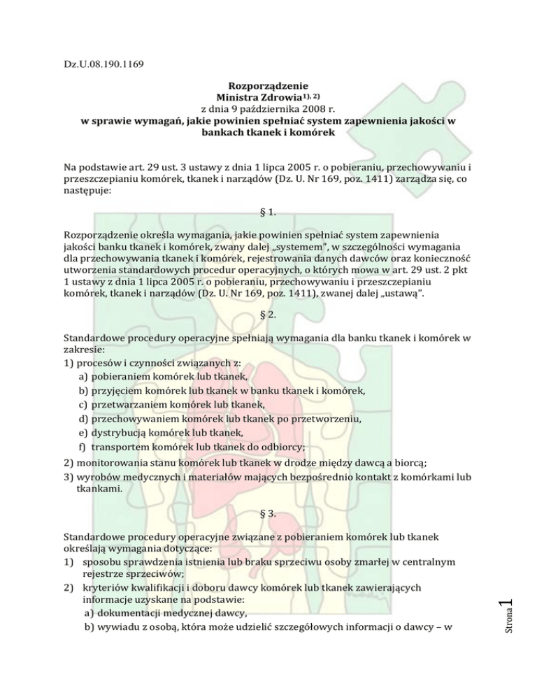 Dz.U.08.190.1169 Rozporządzenie Ministra Zdrowia1), 2) z dnia 9 października 2008 r. w sprawie wymagań, jakie powinien spełniać system zapewnienia jakości w bankach tkanek i komórek Na podstawie art. 29 ust. 3 ustawy z dnia 1 lipca 2005 r. o pobieraniu, przechowywaniu i przeszczepianiu komórek, tkanek i narządów (Dz. U. Nr 169, poz. 1411) zarządza się, co następuje: § 1. Rozporządzenie określa wymagania, jakie powinien spełniać system zapewnienia jakości banku tkanek i komórek, zwany dalej „systemem”, w szczególności wymagania dla przechowywania tkanek i komórek, rejestrowania danych dawców oraz konieczność utworzenia standardowych procedur operacyjnych, o których mowa w art. 29 ust. 2 pkt 1 ustawy z dnia 1 lipca 2005 r. o pobieraniu, przechowywaniu i przeszczepianiu komórek, tkanek i narządów (Dz. U. Nr 169, poz. 1411), zwanej dalej „ustawą”. § 2. Standardowe procedury operacyjne spełniają wymagania dla banku tkanek i komórek w zakresie: 1) procesów i czynności związanych z: a) pobieraniem komórek lub tkanek, b) przyjęciem komórek lub tkanek w banku tkanek i komórek, c) przetwarzaniem komórek lub tkanek, d) przechowywaniem komórek lub tkanek po przetworzeniu, e) dystrybucją komórek lub tkanek, f) transportem komórek lub tkanek do odbiorcy; 2) monitorowania stanu komórek lub tkanek w drodze między dawcą a biorcą; 3) wyrobów medycznych i materiałów mających bezpośrednio kontakt z komórkami lub tkankami. Strona Standardowe procedury operacyjne związane z pobieraniem komórek lub tkanek określają wymagania dotyczące: 1) sposobu sprawdzenia istnienia lub braku sprzeciwu osoby zmarłej w centralnym rejestrze sprzeciwów; 2) kryteriów kwalifikacji i doboru dawcy komórek lub tkanek zawierających informacje uzyskane na podstawie: a) dokumentacji medycznej dawcy, b) wywiadu z osobą, która może udzielić szczegółowych informacji o dawcy – w 1 § 3. Strona 3) kryteriów wykluczających zmarłego dawcę komórek lub tkanek, sporządzonych na podstawie informacji dotyczących: a) nieznanej przyczyny zgonu, o ile nie zostanie ona ustalona na podstawie późniejszego badania pośmiertnego dokonanego po pobraniu, b) choroby o nieznanej etiologii w wywiadzie, c) czynnej choroby nowotworowej lub choroby nowotworowej w wywiadzie, d) dawcy z nowotworem złośliwym, który może być poddany ocenie i brany pod uwagę jako dawca rogówki, z wyjątkiem osoby cierpiącej na siatkówczaka, choroby nowotworowe krwi i nowotwory złośliwe przedniego odcinka gałki ocznej, e) choroby Creutzfeldta-Jacoba, f) postępującej demencji lub zwyrodnieniowej choroby neurologicznej, w tym o nieznanym pochodzeniu, g) biorcy hormonów uzyskanych z ludzkiej przysadki (np. hormon wzrostu), h) biorcy przeszczepów rogówki, twardówki i opony twardej, a także osoby, którą poddano nieudokumentowanej operacji neurochirurgicznej, w której zastosowana mogła być opona twarda, i) zakażenia ogólnoustrojowego nie będącego pod kontrolą w momencie pobrania, w tym choroby bakteryjnej, uogólnionego zakażenia wirusowego, grzybiczego lub pasożytniczego lub poważnego zakażenia miejscowego w komórkach lub tkankach, które mają być pobrane, j) dodatniego wywiadu w kierunku i cechach klinicznych lub wynikach laboratoryjnych świadczących o zakażeniu wirusem HIV, ostrego lub przewlekłego zapalenia wątroby wywołanego przez wirusa HBV, zapalenia wątroby wywołanego przez wirusa HCV i zakażenia wirusem HTLV I/II, k) ryzyka przeniesienia lub obecności czynników ryzyka związanych z zakażeniami, o których mowa w lit. j, l) czynnej i przewlekłej lub w wywiadzie, uogólnionej choroby autoimmunologicznej, m) stwierdzenia, że wyniki testów próbek krwi dawcy będą nieważne ze względu na występowanie hemodylucji, jeżeli nie jest dostępna próbka sprzed transfuzji (dotyczy tylko komórek lub tkanek), n) leczenia środkami immunosupresyjnymi, o) występowania (z wywiadu lekarskiego) czynników ryzyka związanych z 2 przypadku dawcy zmarłego, c) wywiadu z lekarzem, który leczył dawcę, d) wywiadu z lekarzem podstawowej opieki zdrowotnej, e) raportu z badania pośmiertnego, f) wyniku badania przedmiotowego dawcy zmarłego i żywego w celu wykrycia wszelkich oznak, które mogą wykluczyć ich jako dawców lub które może wpłynąć na ocenę do zakwalifikowania ich jako dawców komórek lub tkanek, g) dokumentacji dotyczącej oceny stanu zdrowia dawcy, pod kątem przydatności do pobrania komórek lub tkanek, podpisanej przez osobę odpowiedzialną lub pracownika przez nią upoważnionego; p) q) r) s) t) u) chorobami zakaźnymi, wynikającymi z oceny ryzyka, z uwzględnieniem odbywania przez dawcę podróży gdzie istnieje możliwość narażenia dawcy na kontakt z chorobami zakaźnymi oraz możliwość narażenia dawcy na kontakt z chorobami zakaźnymi występującymi regionalnie, obecności na ciele dawcy fizycznych oznak wskazujących na zagrożenie chorobą zakaźną, spożycia lub narażenia na działanie substancji takiej jak cyjanek, ołów, rtęć, złoto, które mogą zostać przekazane biorcom, w dawce mogącej stanowić zagrożenie dla ich zdrowia, szczepienia żywym atenuowanym wirusem w wywiadzie, jeżeli istnieje możliwość jego przeniesienia, przebytych zabiegów z zastosowaniem przeszczepów ksenogenicznych, przypadków dzieci w wieku poniżej 18 miesięcy, urodzonych przez matki zakażone wirusem HIV, wirusem zapalenia wątroby typu B, zapalenia wątroby typu C lub wirusem HTLV, bądź narażonych na takie zakażenie, karmionych przez matki piersią w ciągu ostatnich 12 miesięcy w celu stwierdzenia, że nie mogą być brane pod uwagę jako dawcy bez względu na wyniki testów analitycznych, przypadków dzieci matek zakażonych wirusem HIV, wirusem zapalenia wątroby typu B, zapalenia wątroby typu C lub wirusem HTLV lub narażonych na takie zakażenie, które nie były karmione piersią przez matki w ciągu ostatnich 12 m